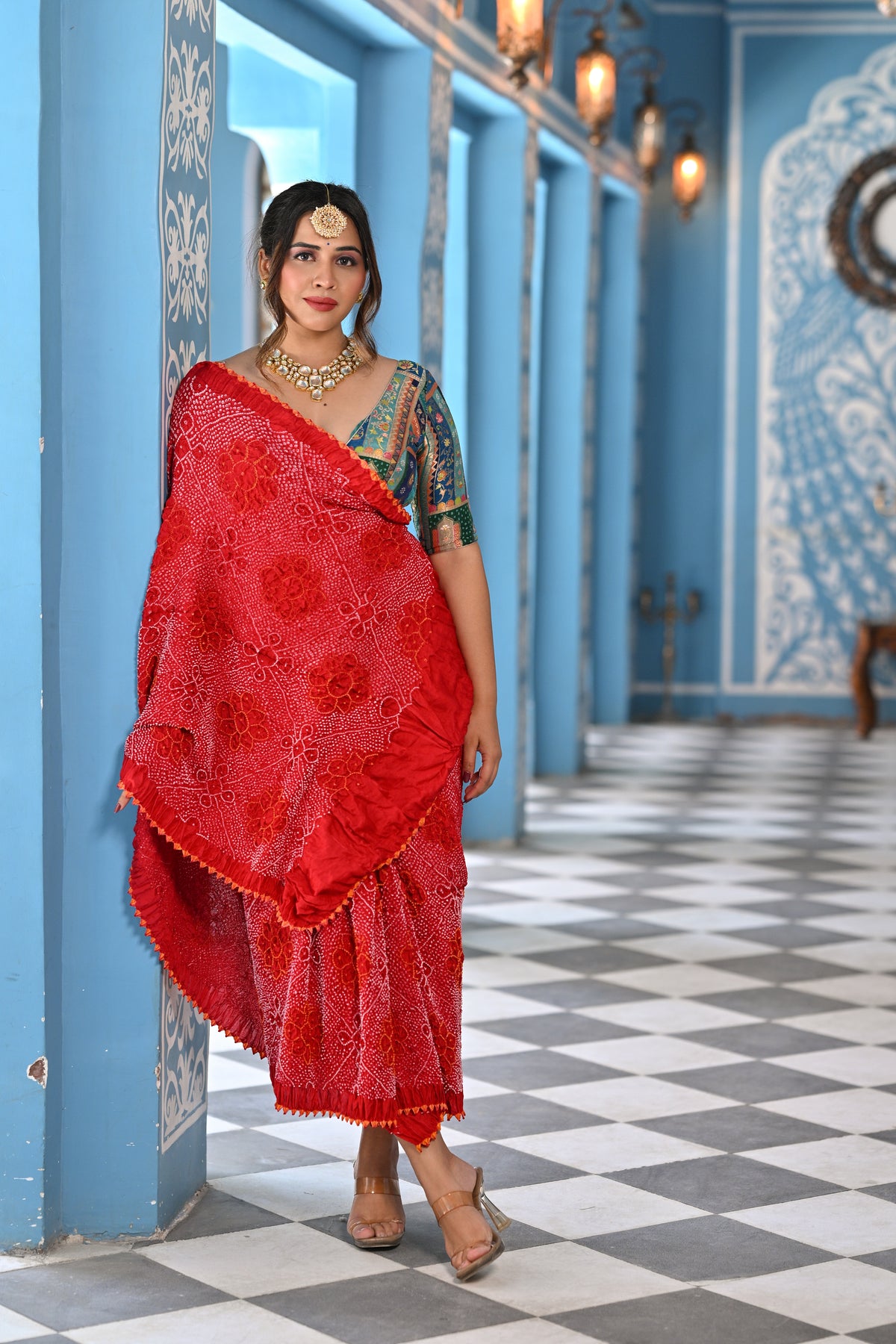 RED ETERNAL DOT SILK BANDHANI SAREE WITH EMBROIDERY AND RUFFLE BORDER