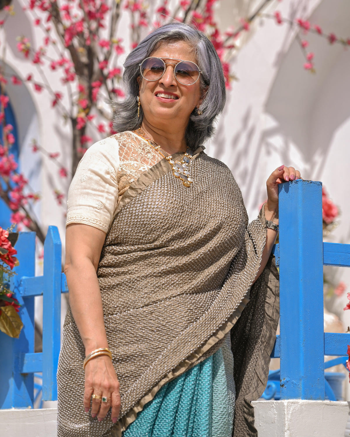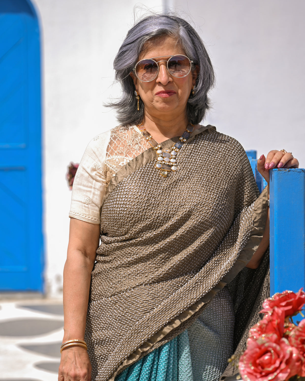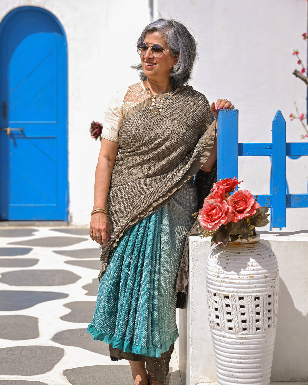 The blouse used on the model is not inclusive; a bandhani silk blouse is included with the saree.