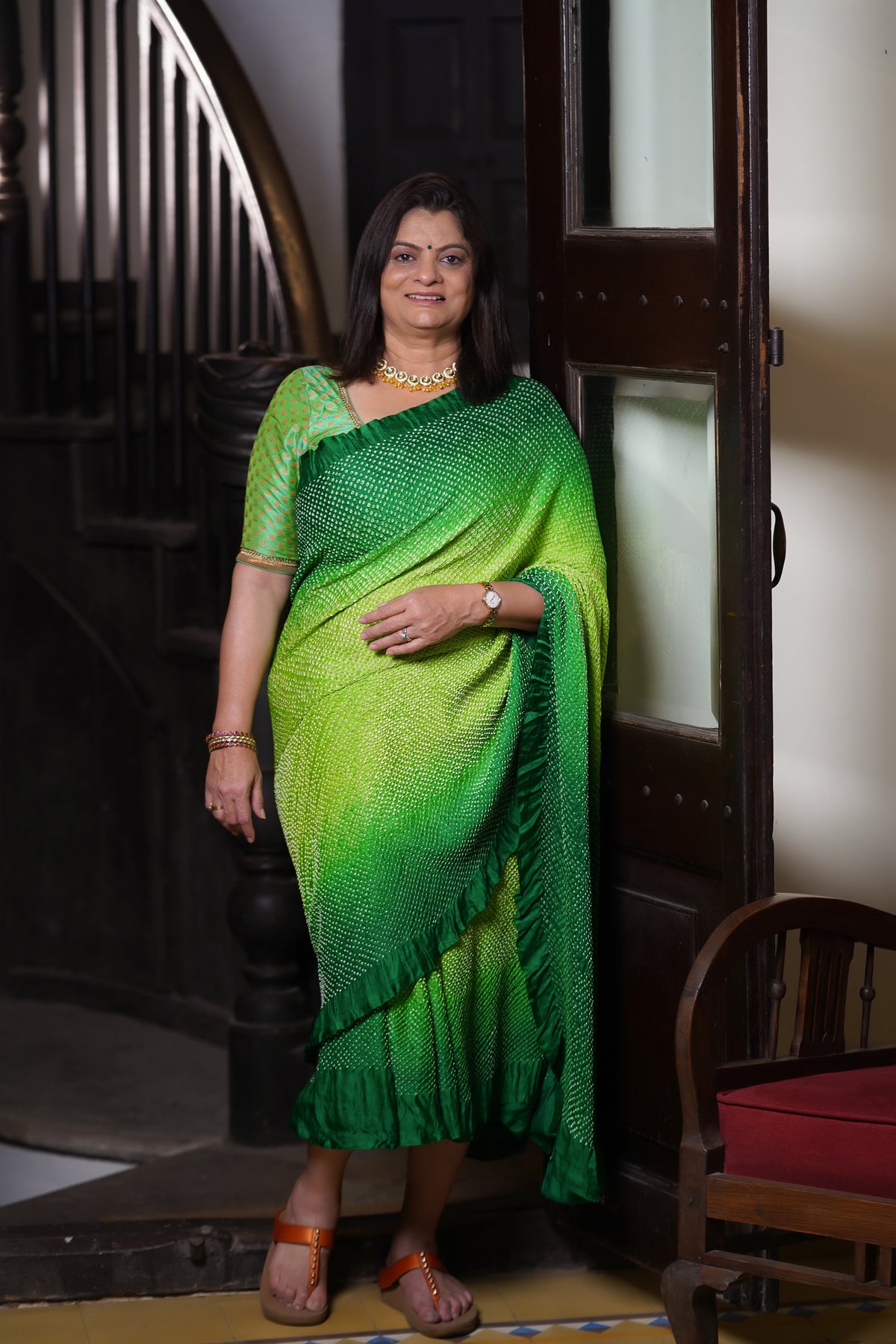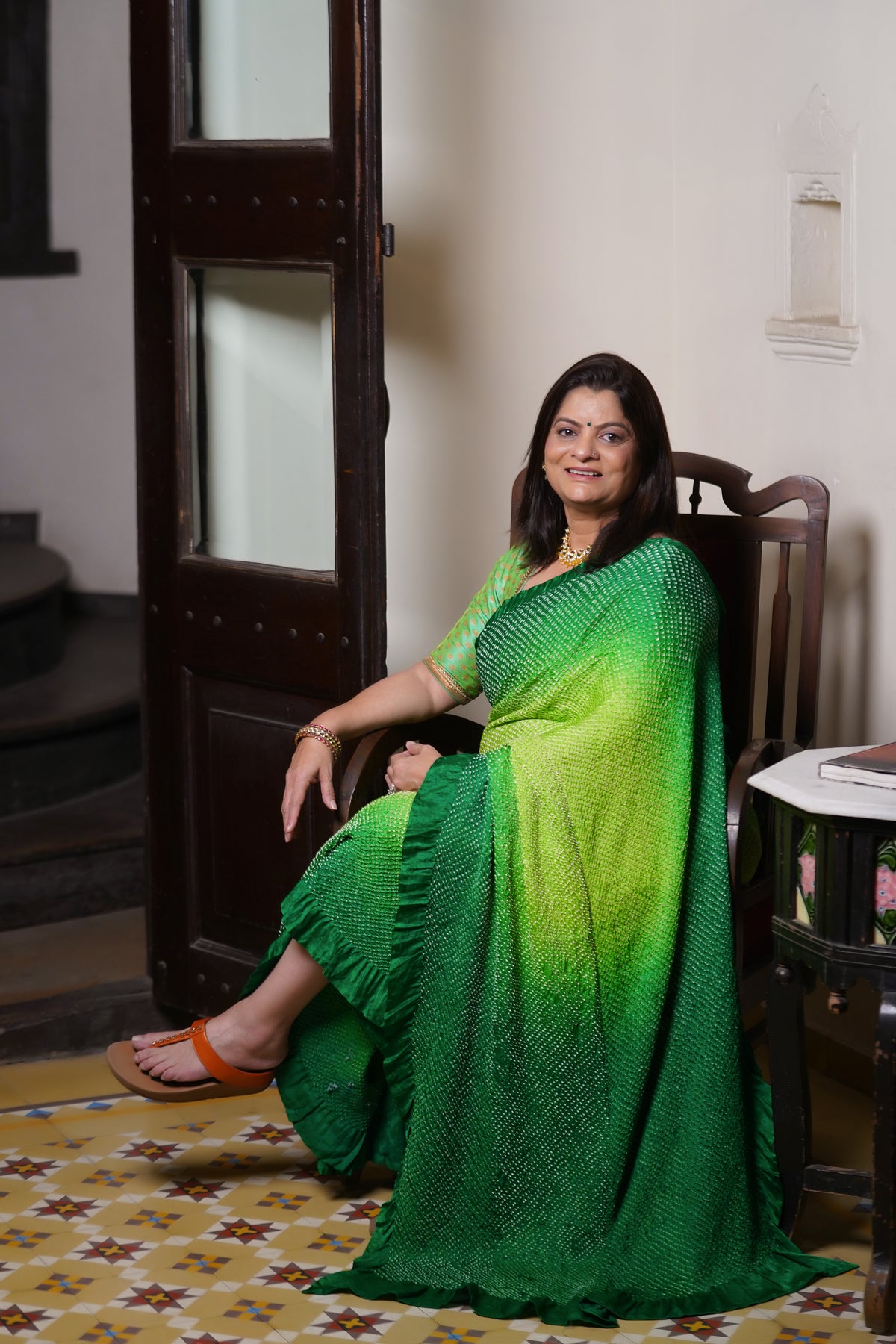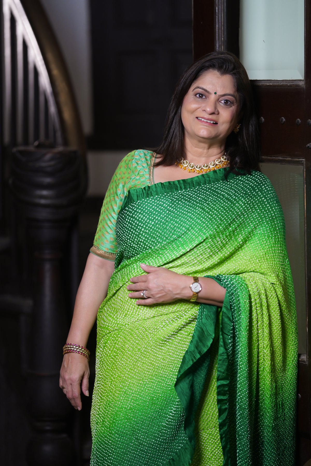 Redefining the classic bandh in our eternal dot saree, known as Bharti ka kaam, with shades of contemporary elegance. Crafted in luxurious Gajji silk, this saree embodies tradition and modern style.
