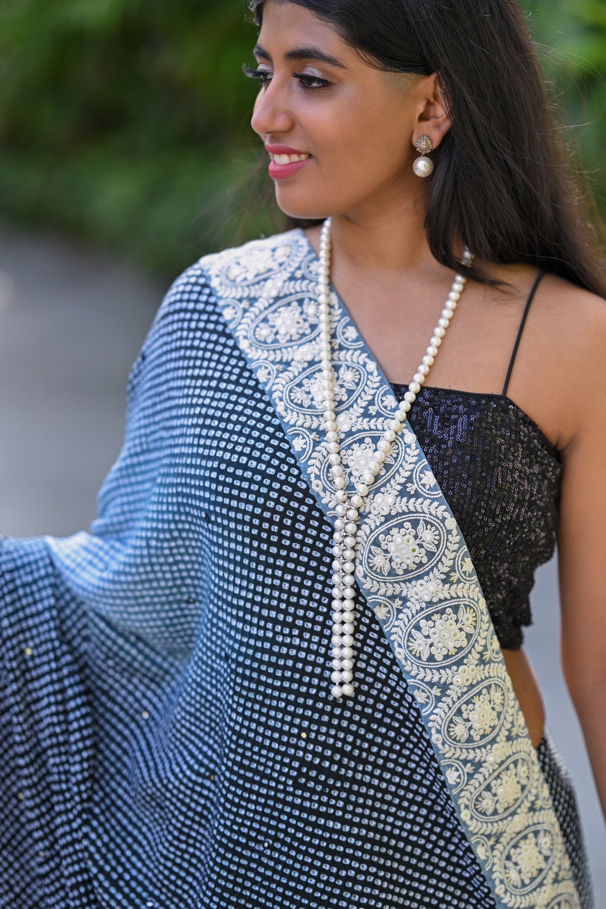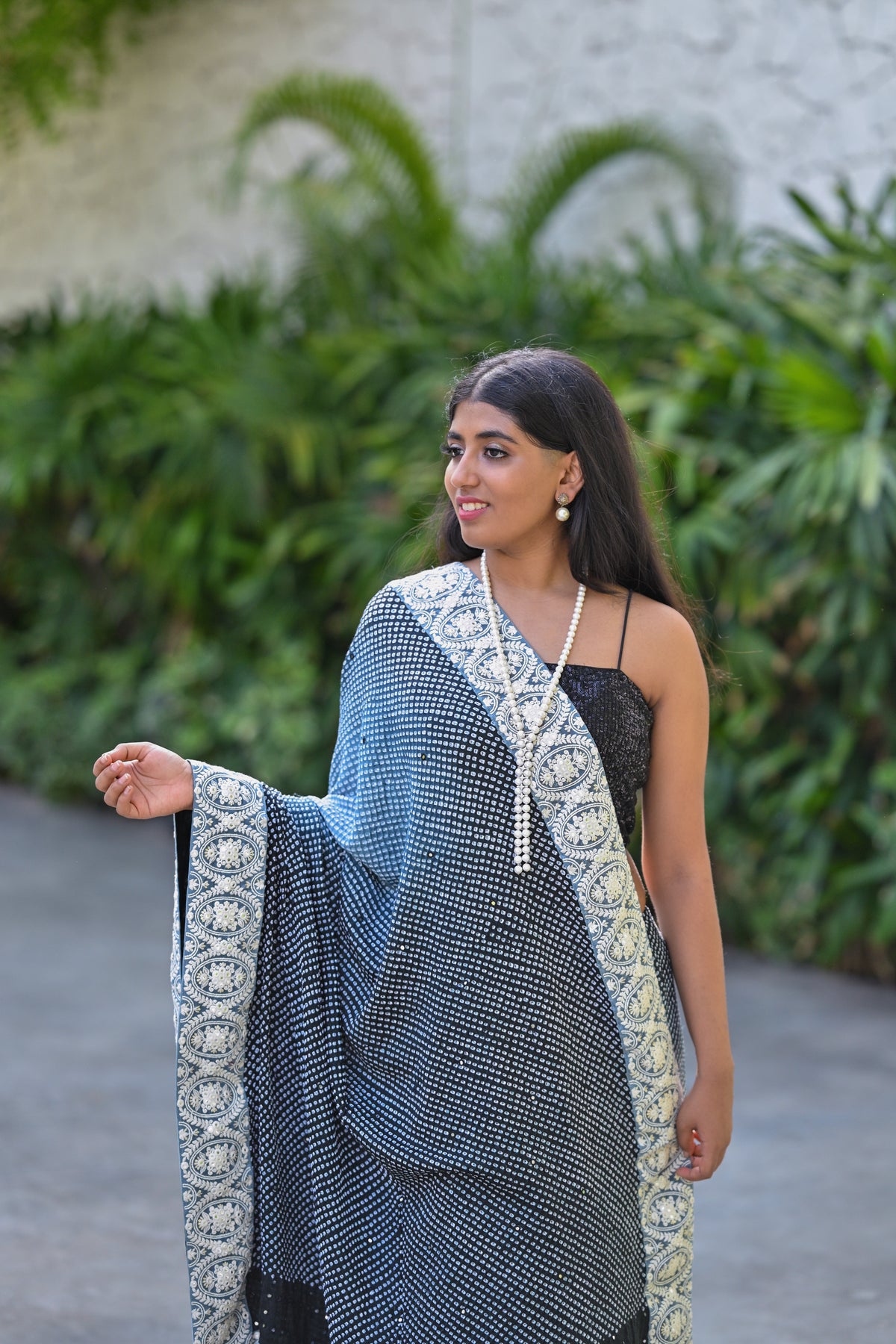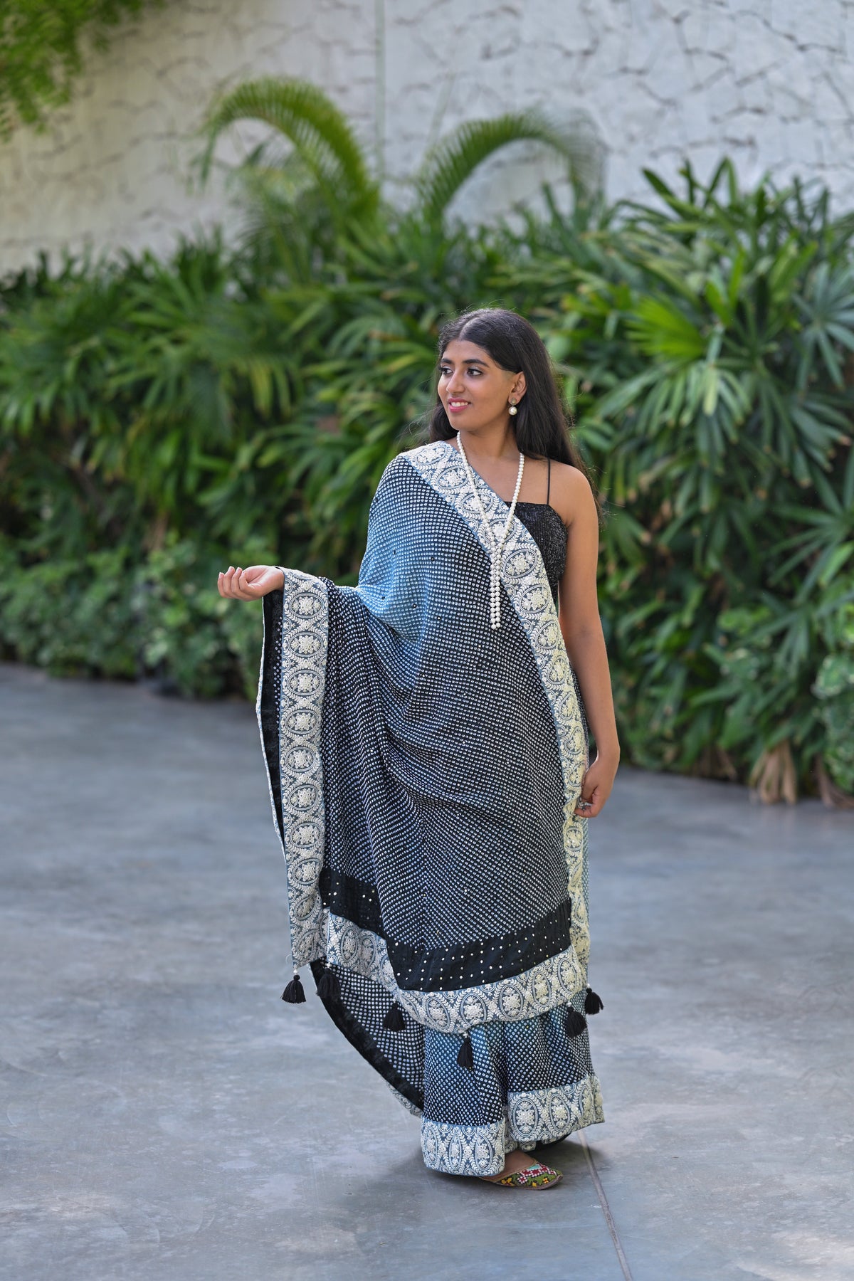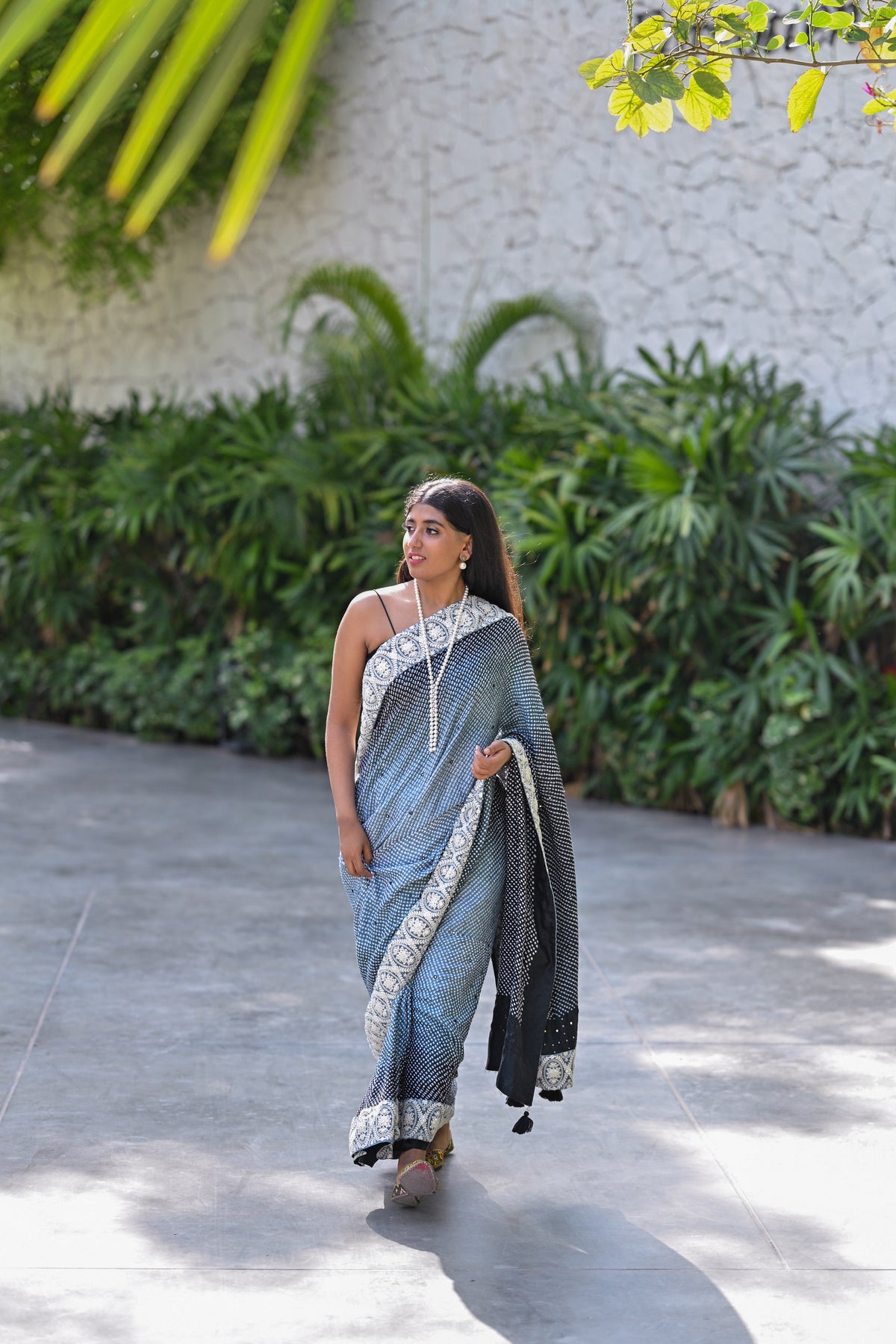 GREY-BLACK ETERNAL DOTS BANDHANI SILK SAREE WITH MIRROR WORK AND LACE BORDER