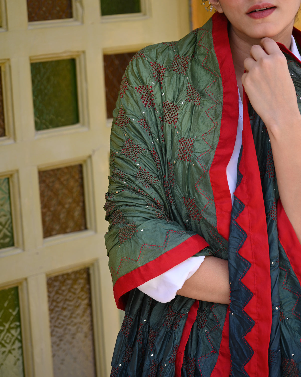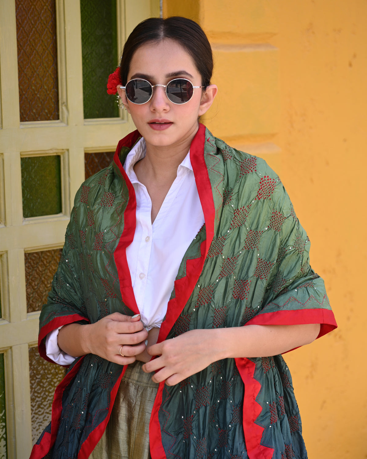 BLUE-GREEN SQUARE GEOMETRIC BANDHANI SILK DUPATTA WITH APPLIQUE BORDER AND TASSELS