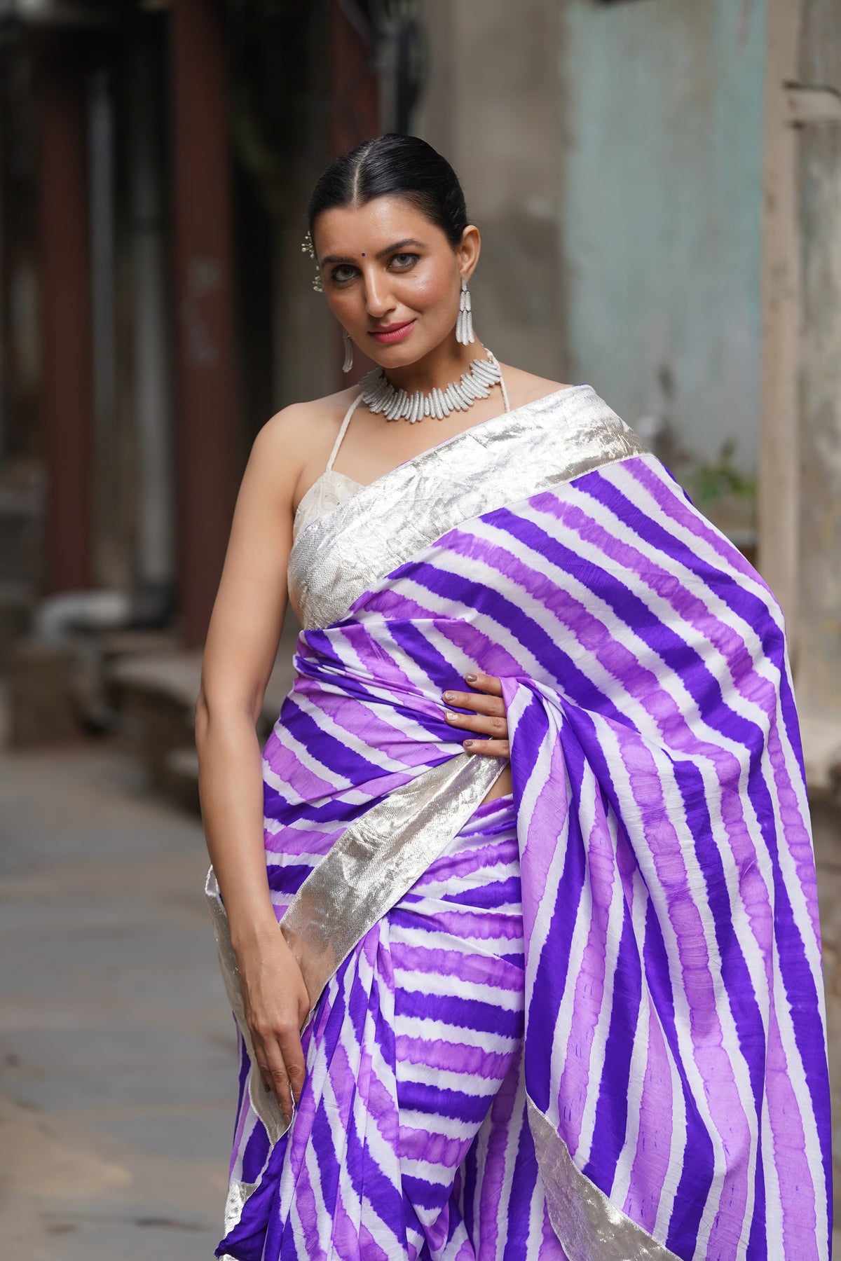 The blouse used on the model is not inclusive, a bandhani silk blouse is included with the saree.