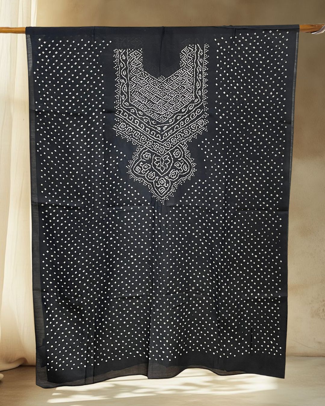 Our Bandhani features a traditional yoke design, where the yoke at the neckline is adorned with thousands of hand-tied dots, forming a rhythmic field of texture. Subtle yet striking, this constellation of knots turns the fabric into a canvas of stories—each piece unique, each one a labour of love.
