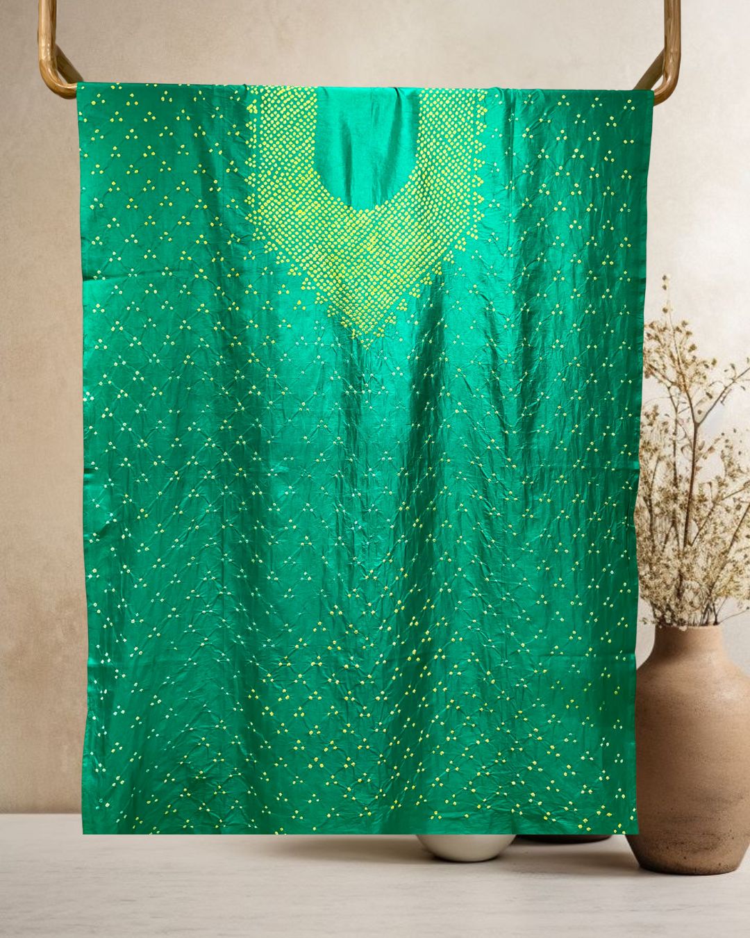 Our Bandhani features a traditional yoke design, where the yoke at the neckline is adorned with thousands of hand-tied dots, forming a rhythmic field of texture. Subtle yet striking, this constellation of knots turns the fabric into a canvas of stories—each piece unique, each one a labour of love.