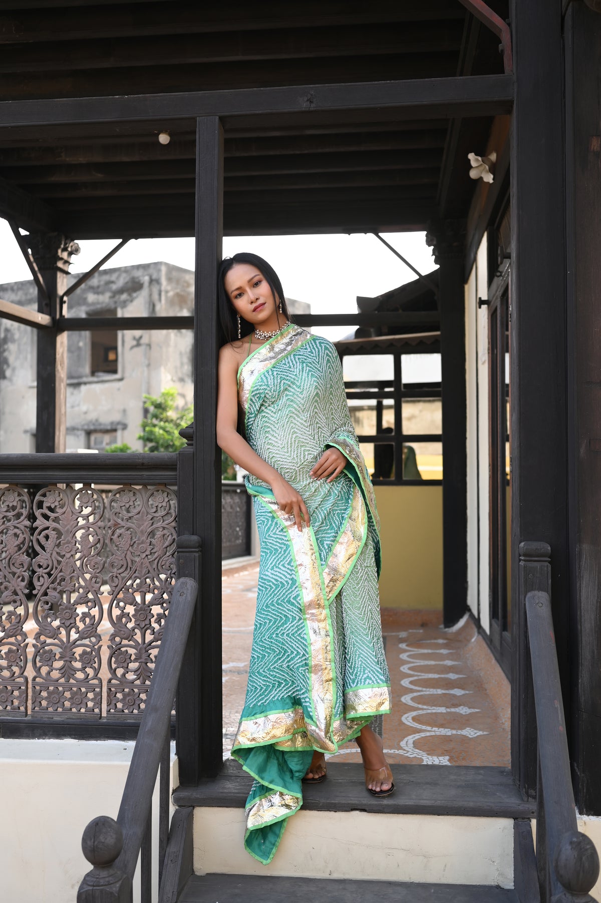 The Chevron saree introduces a fresh take on bandhani, blending the essence of leheriya with a unique design found only at Neelgar. This creation combines colors and subtle hues, offering a rare and exquisite bandhani pattern.