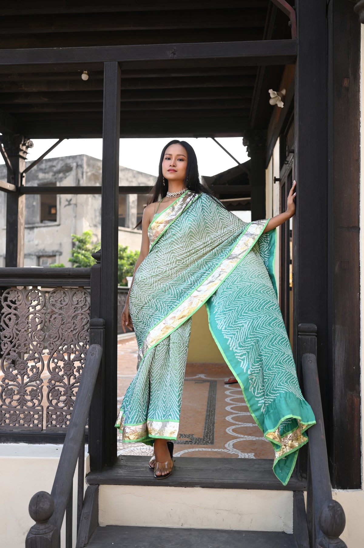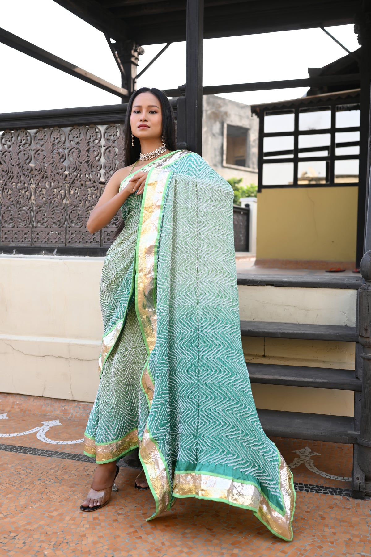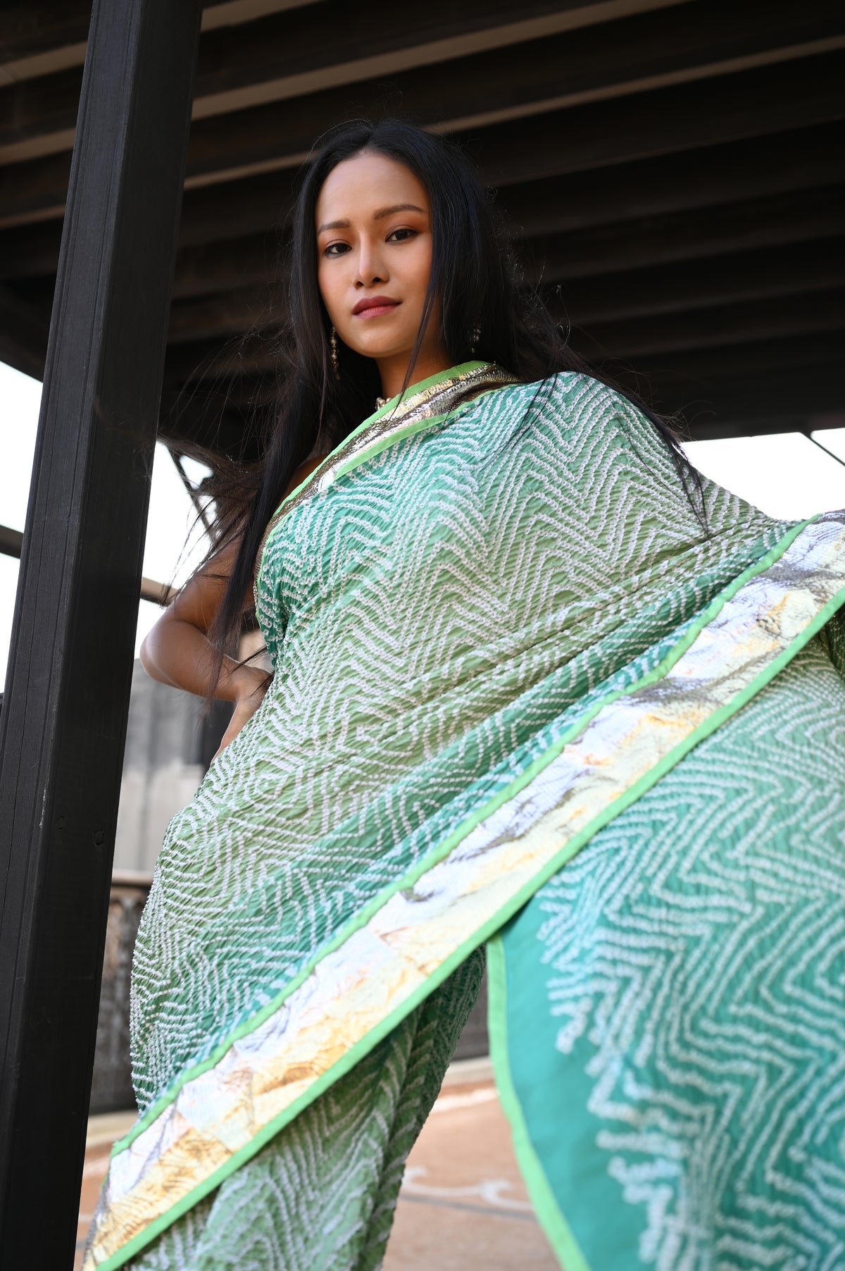 LIGHT GREEN F12 CHEVRON BANDHANI SILK SAREE WITH LAMPI BORDER AND TASSELS