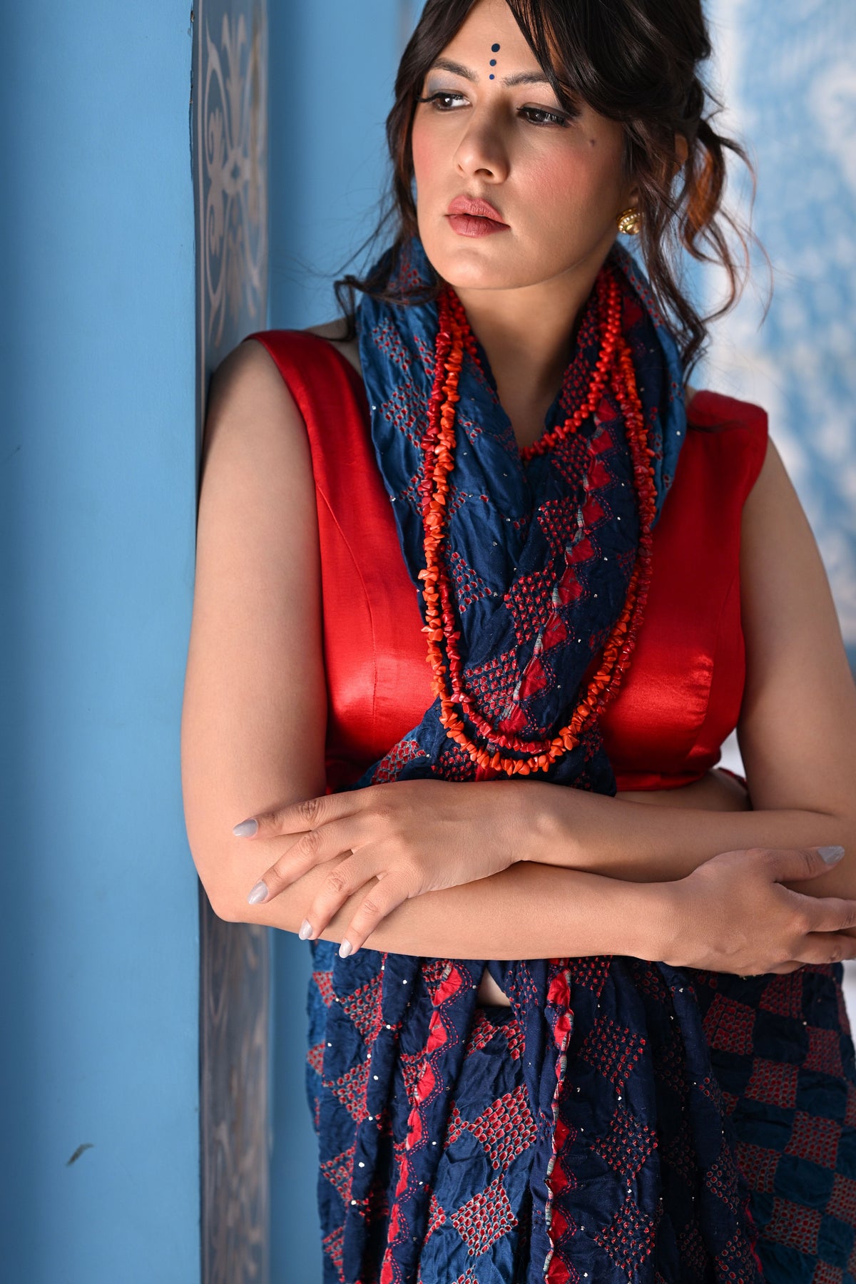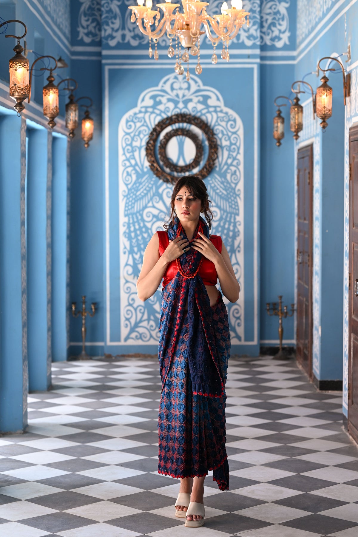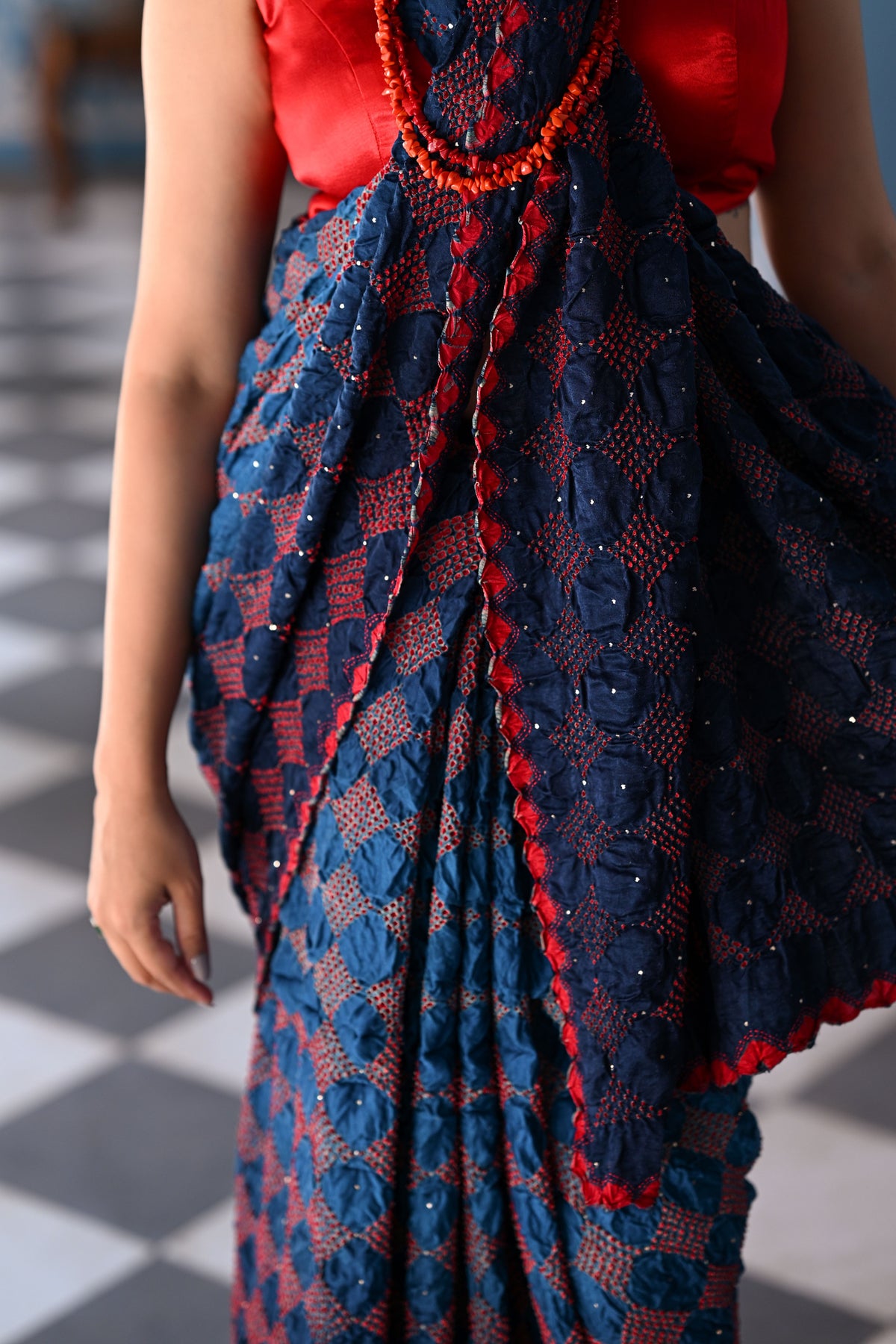INDIGO BLUE GEOMETRIC S3 BANDHANI SILK SAREE WITH MUKAISH WORK