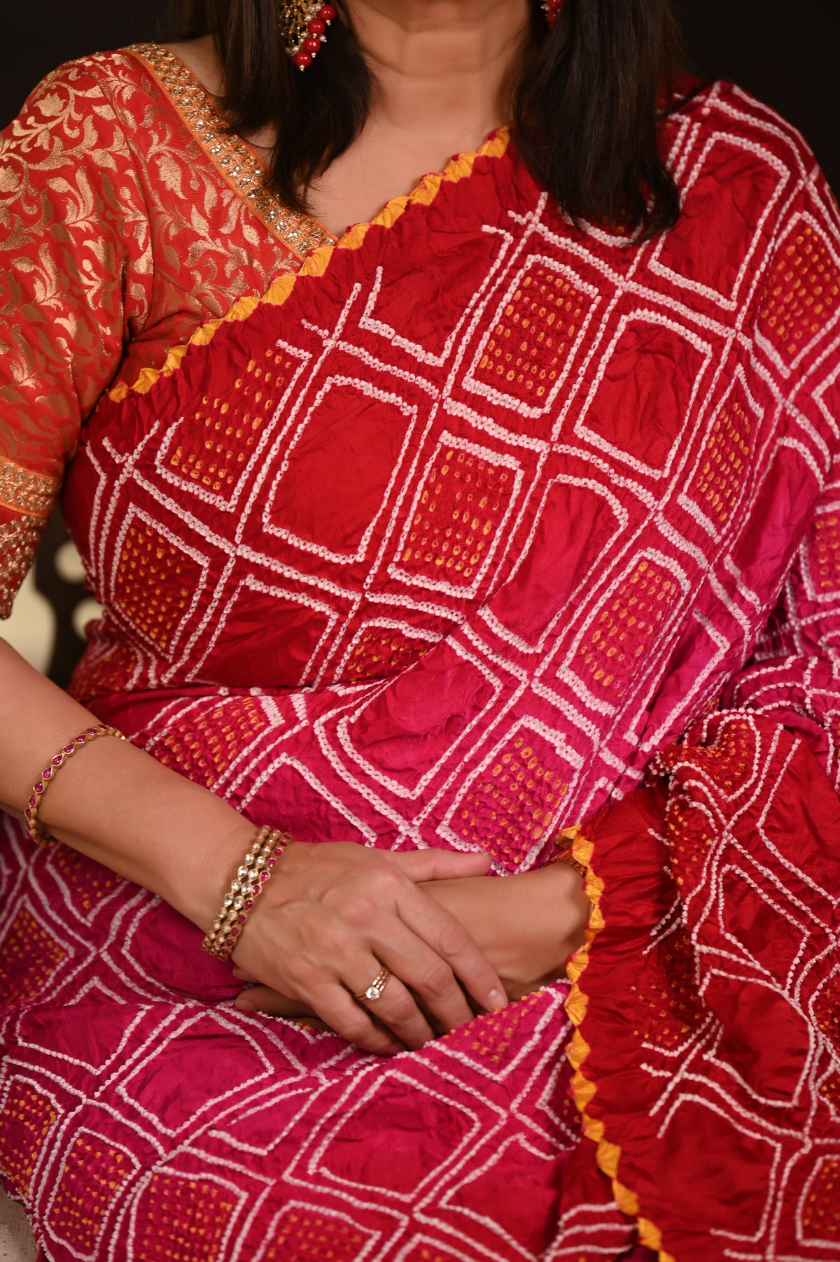 PINK-RED DIAMOND GEOMETRIC BANDHANI SILK SAREE