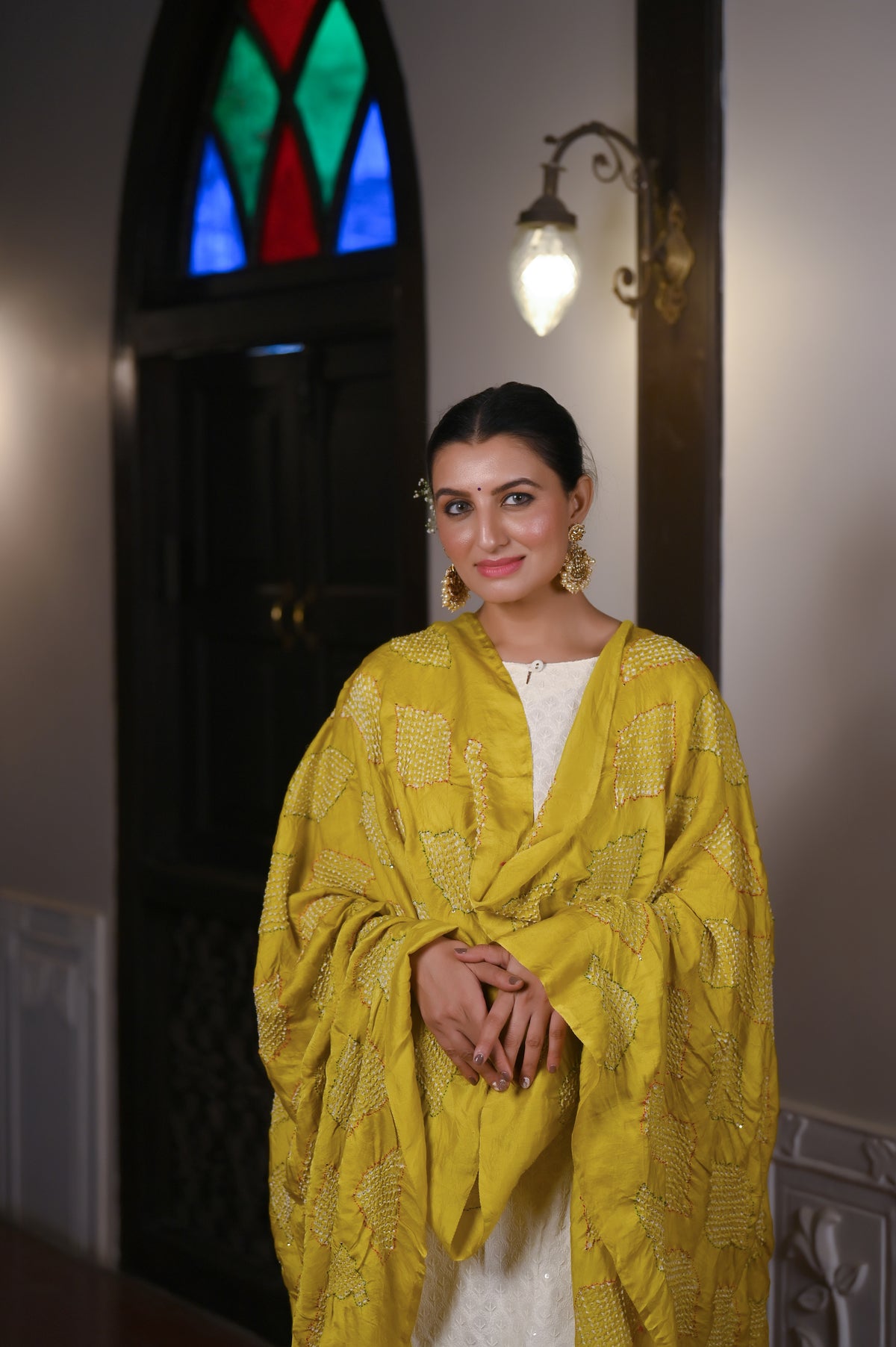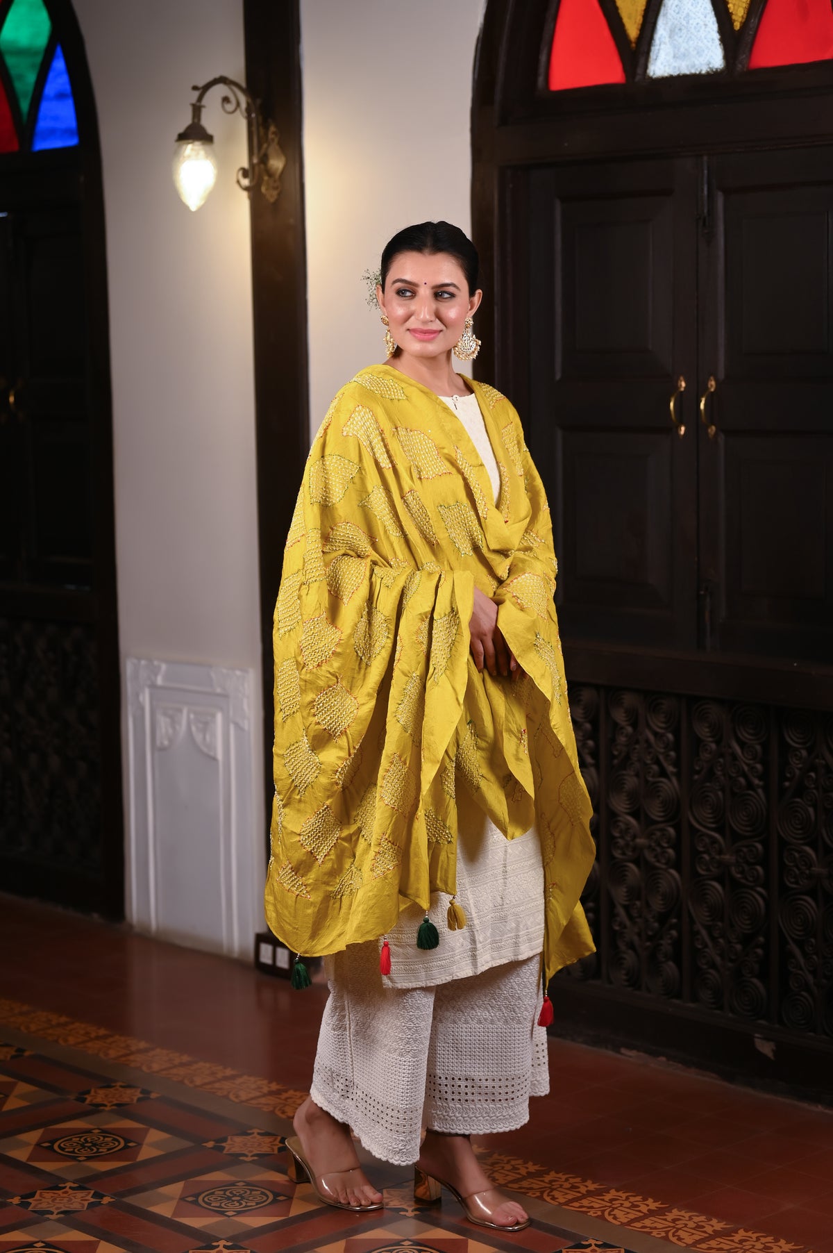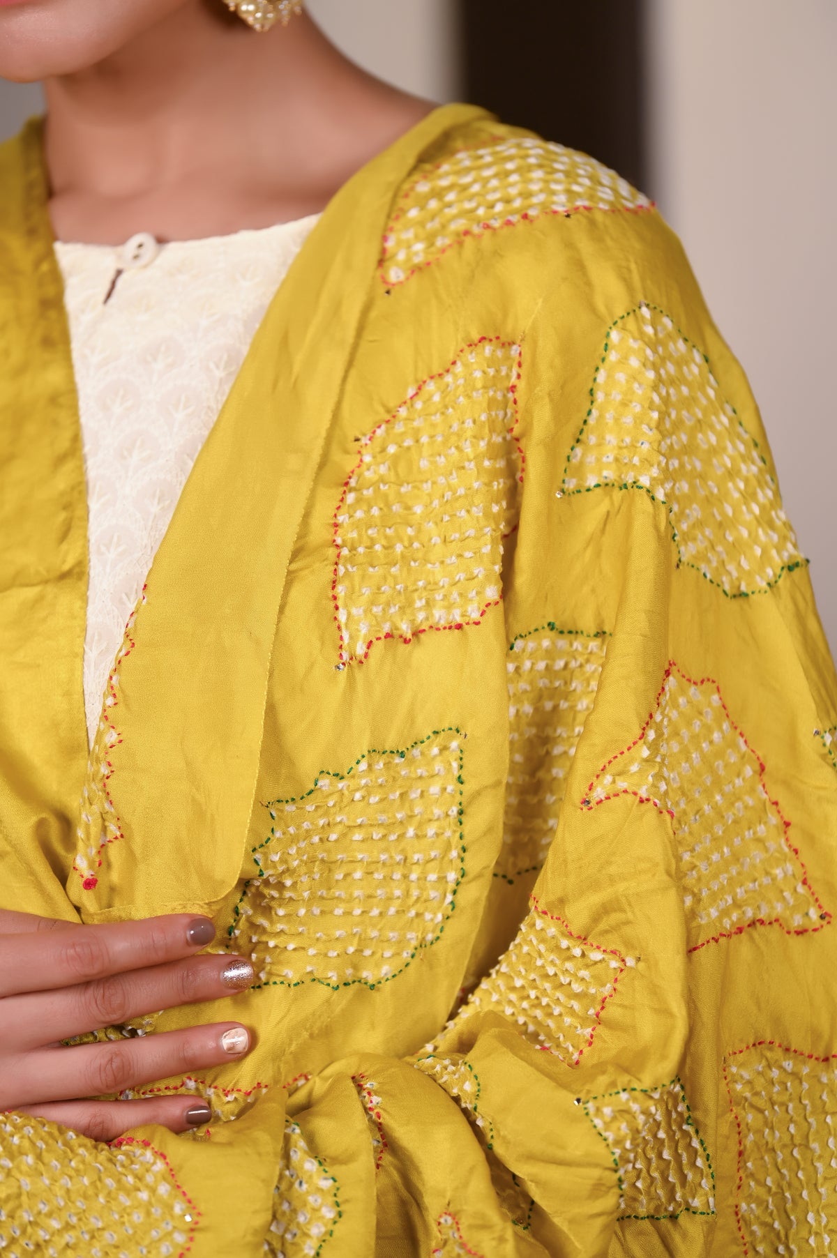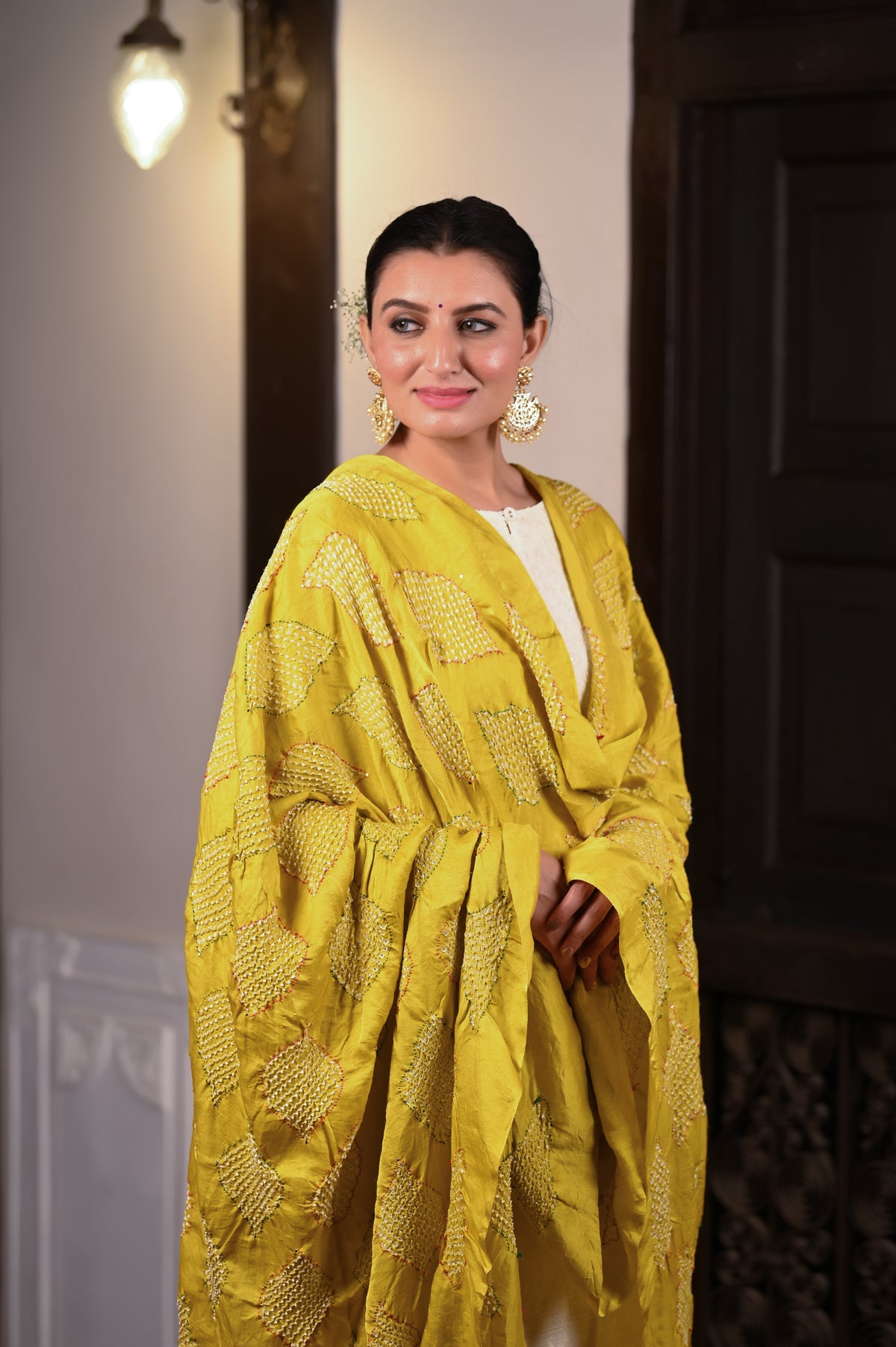 MUSTARD YELLOW GEOMETRIC BANDHANI SILK DUPATTA WITH EMBROIDERY AND MUKAISH WORK