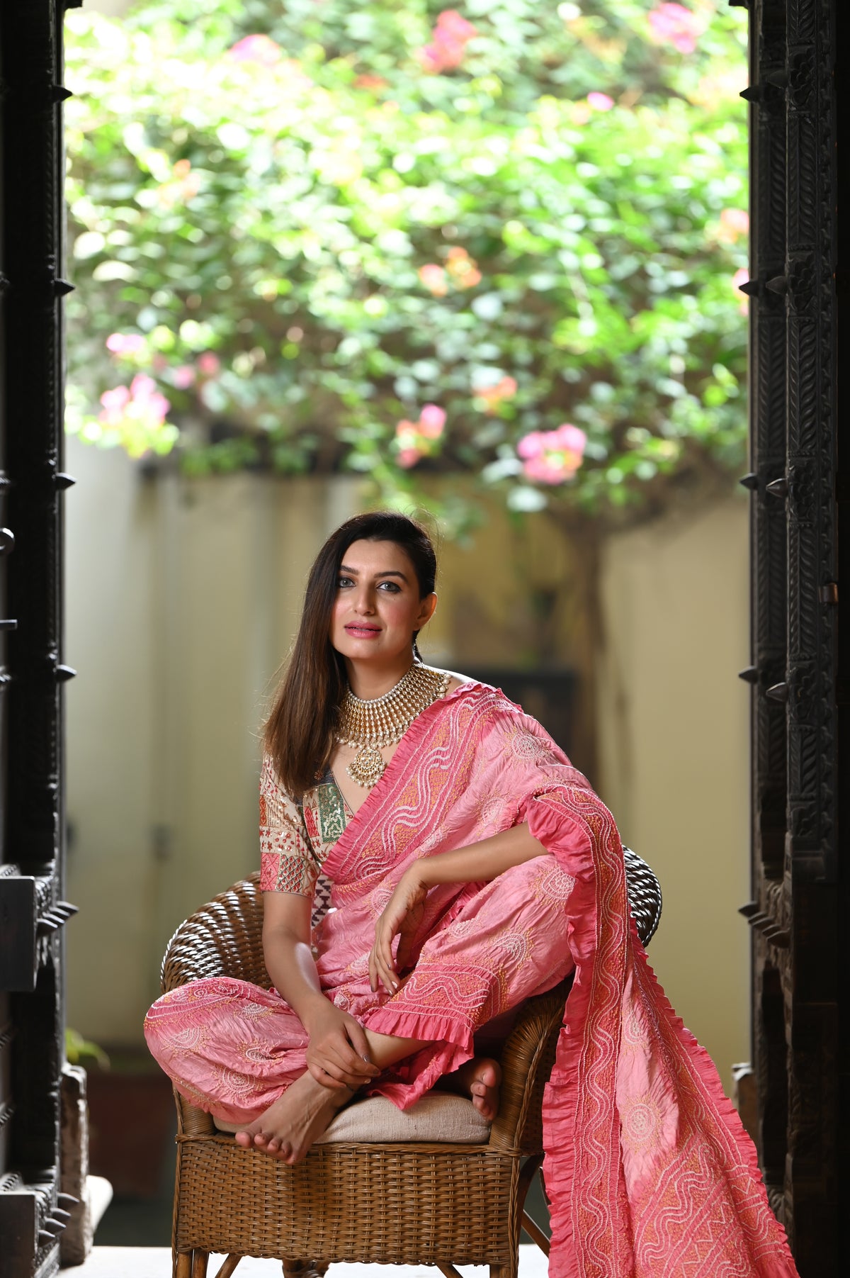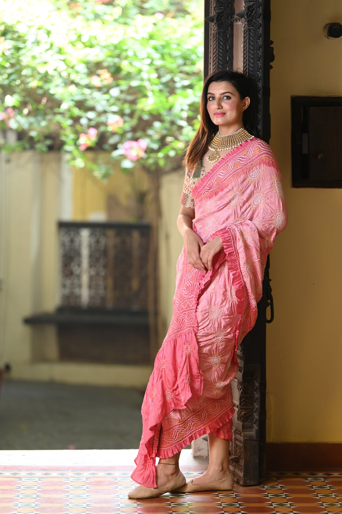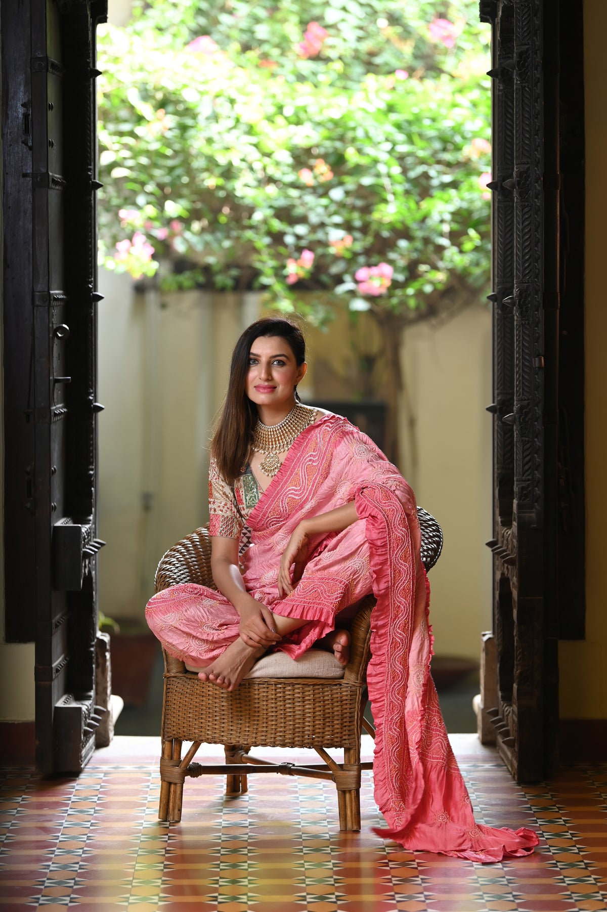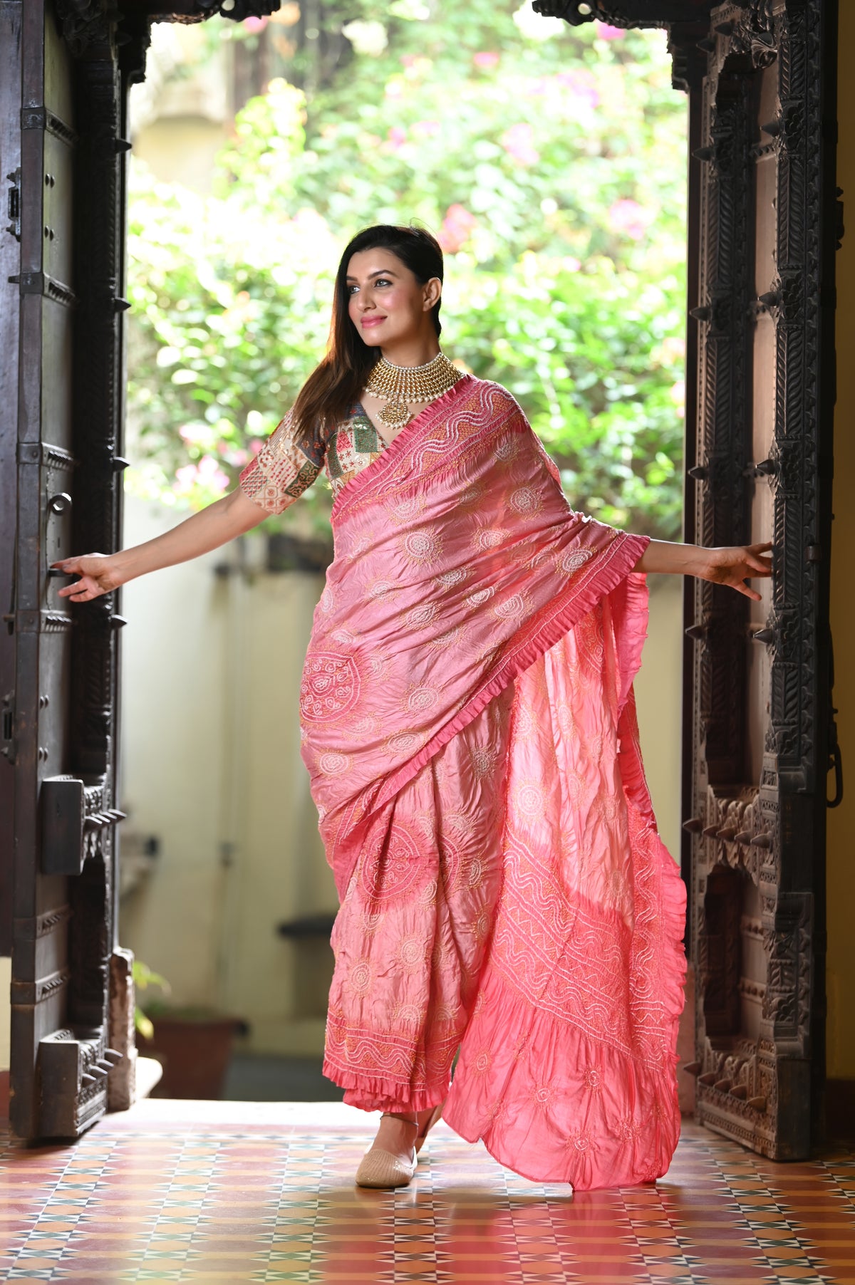 The Neelgar Classic Traditional Laddu Saree features elements of traditional bandhani, enhanced with Neelgar's elegant touch and unique palette of colors, not found traditionally. This saree beautifully blends old-world charm with contemporary sophistication.