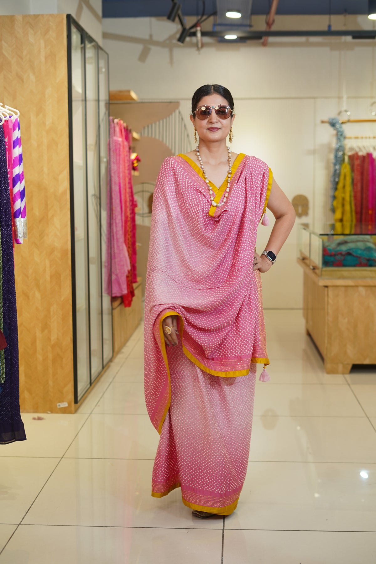 The blouse used on the model is not inclusive; a bandhani silk blouse is included with the saree.