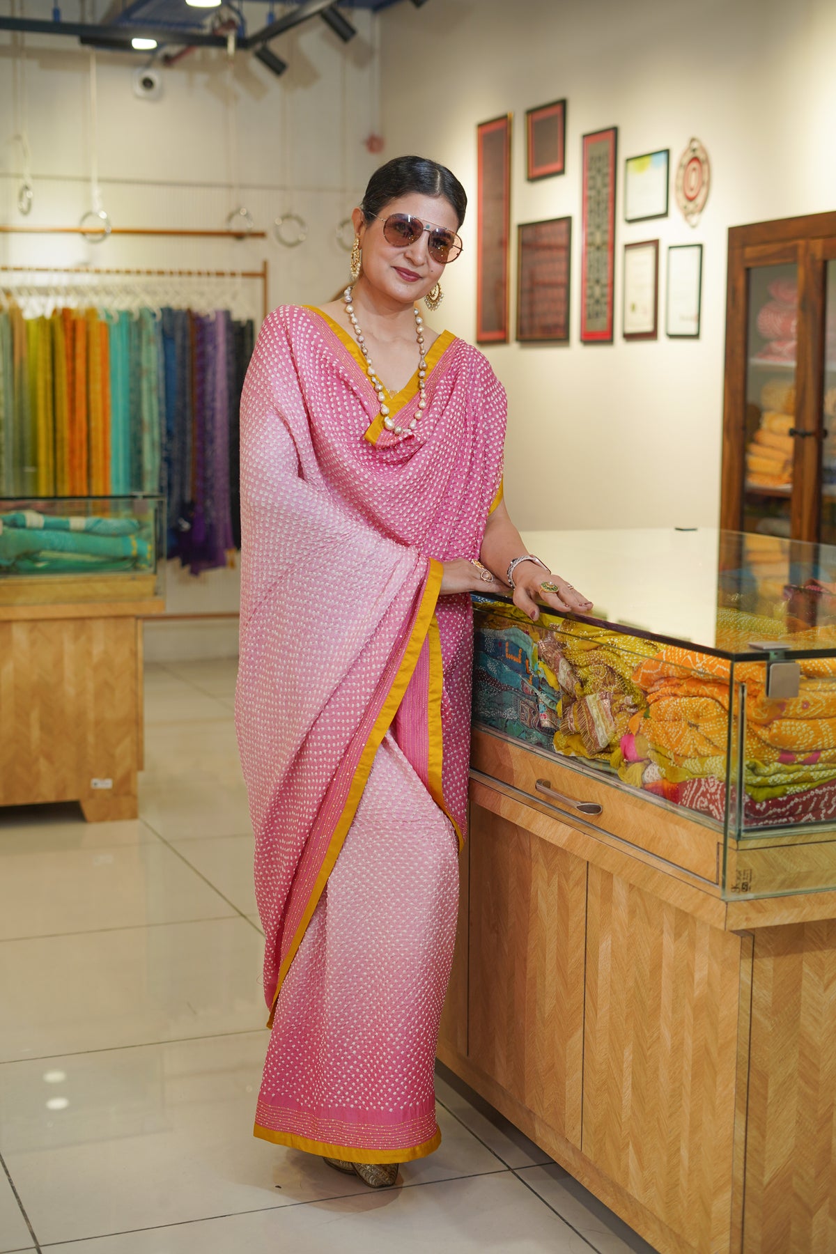 Redefining the classic bandh in our eternal dot saree, known as Bharti ka kaam, with shades of contemporary elegance. Crafted in luxurious Gajji silk, this saree embodies tradition and modern style.