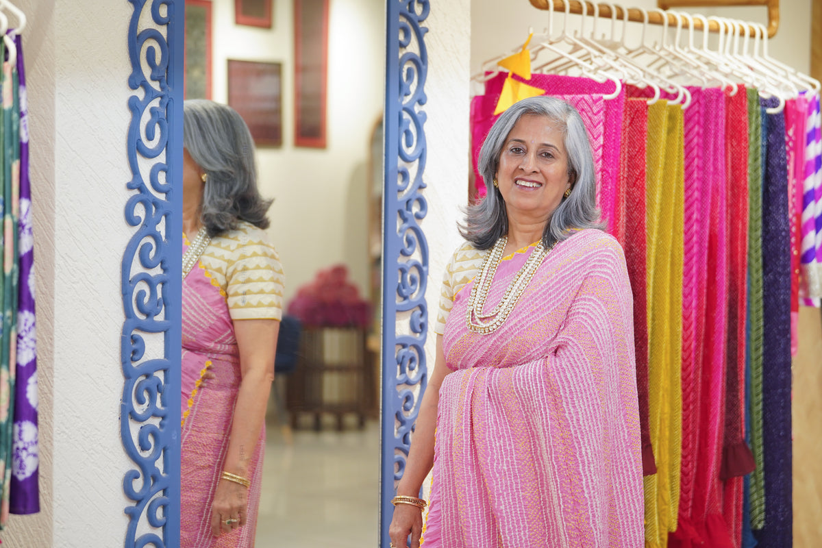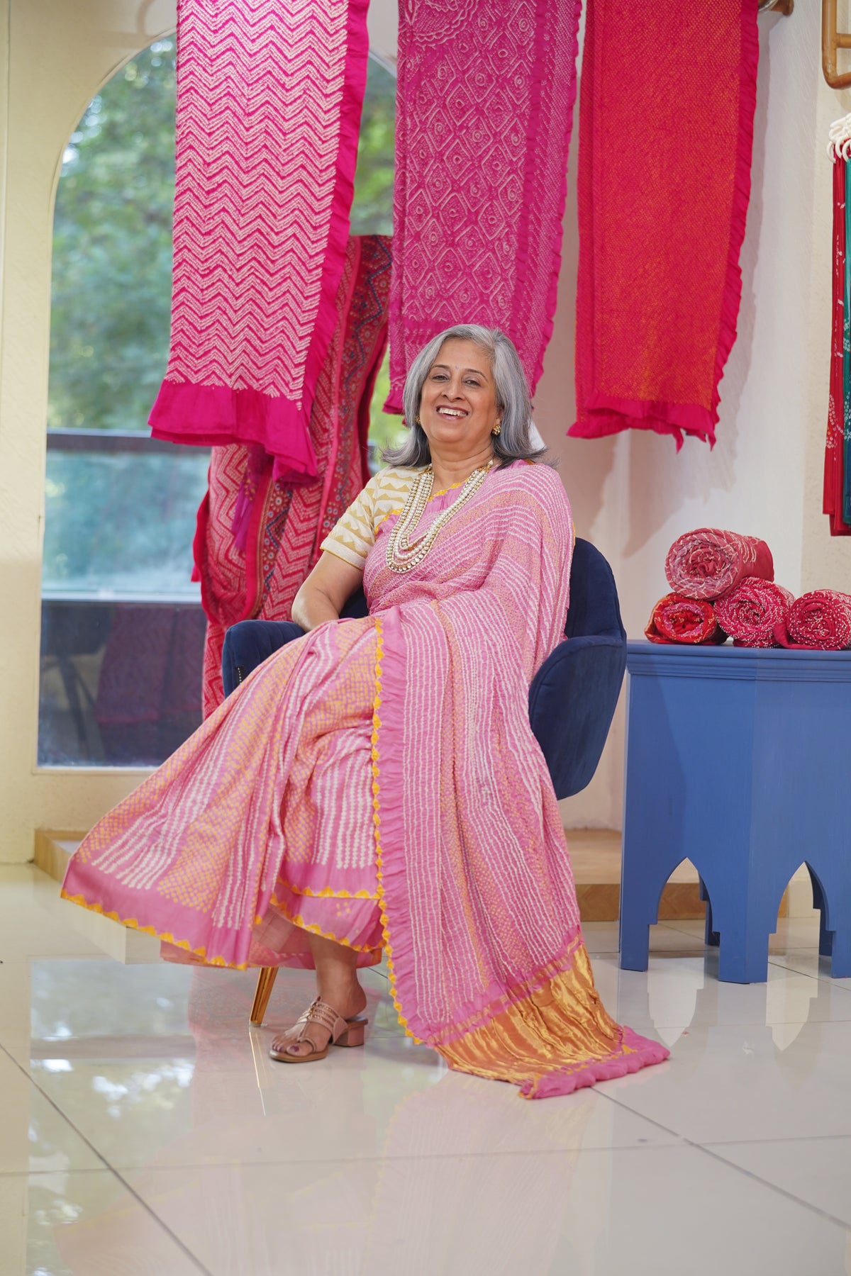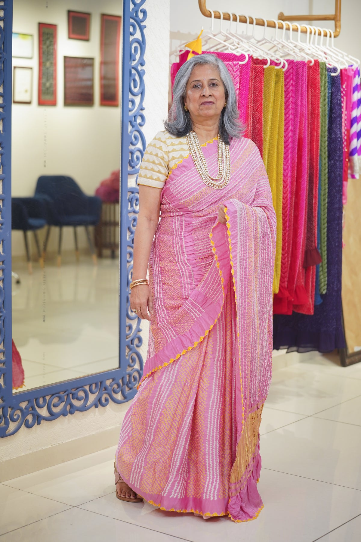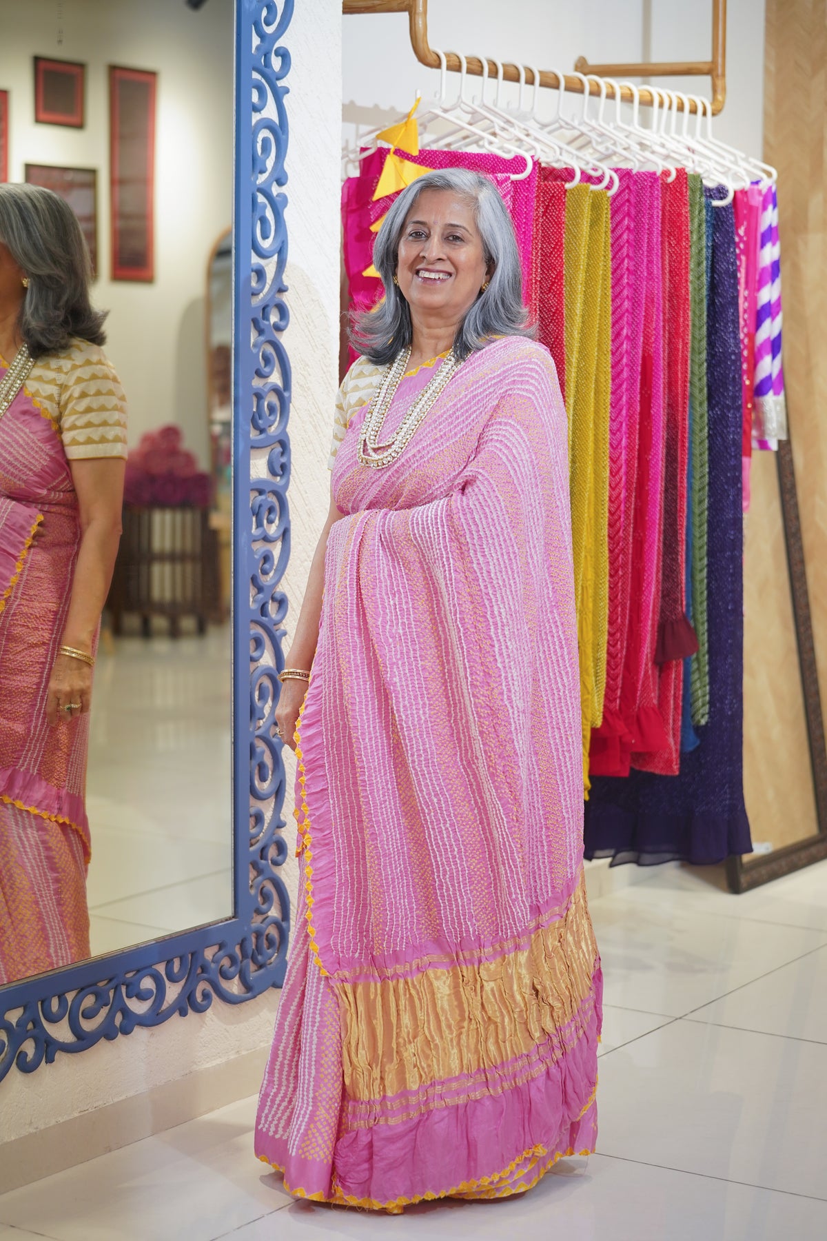 "Lines and Dots" offers a modern representation of bandhani, combining simple geometric forms to create a fresh and unique look. Using a palette of contemporary and classic colors, this design brings a new dimension to traditional bandhani. Each saree has a different combination of stripes and dots.