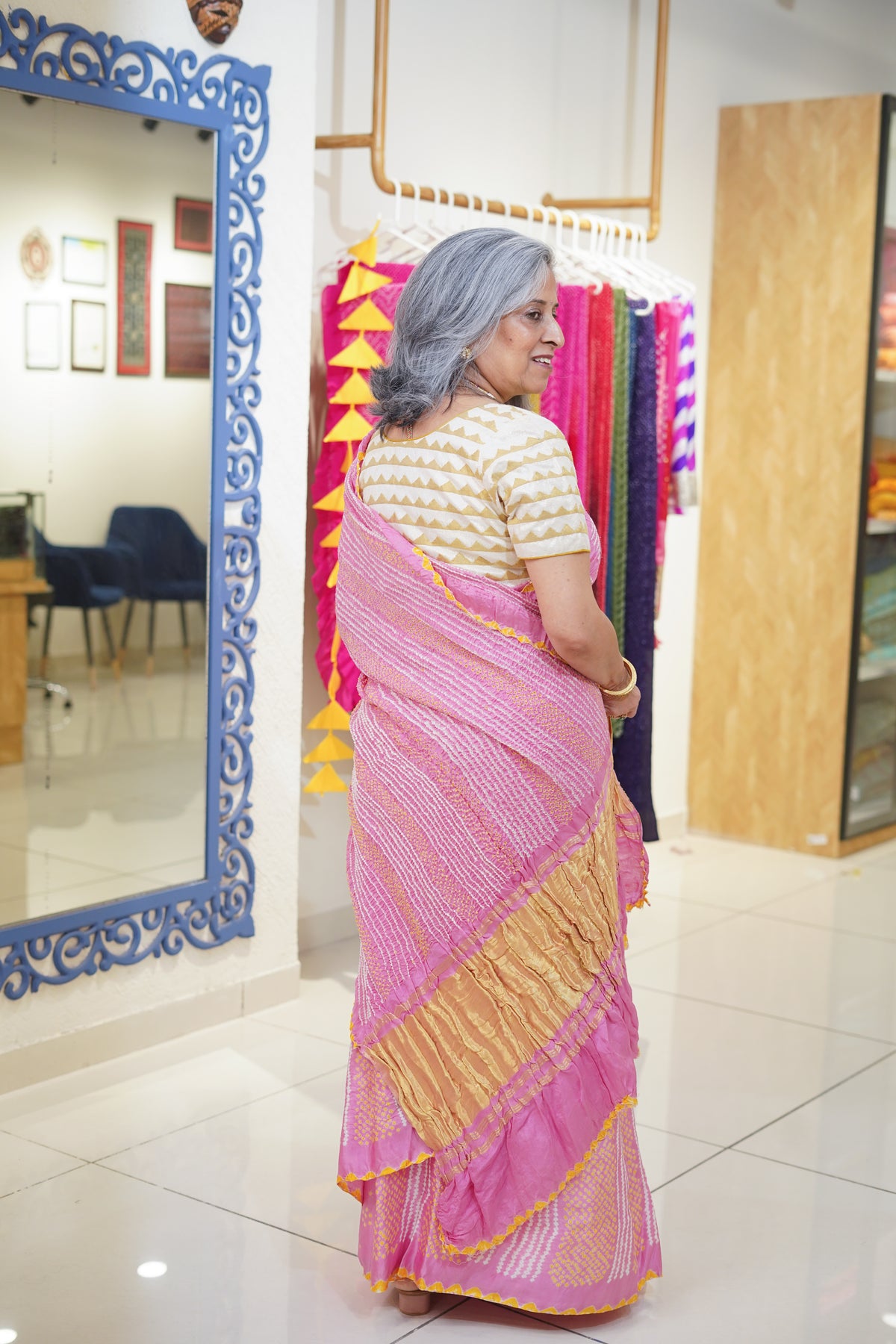 LIGHT PINK LINES AND DOTS SILK BANDHANI SAREE