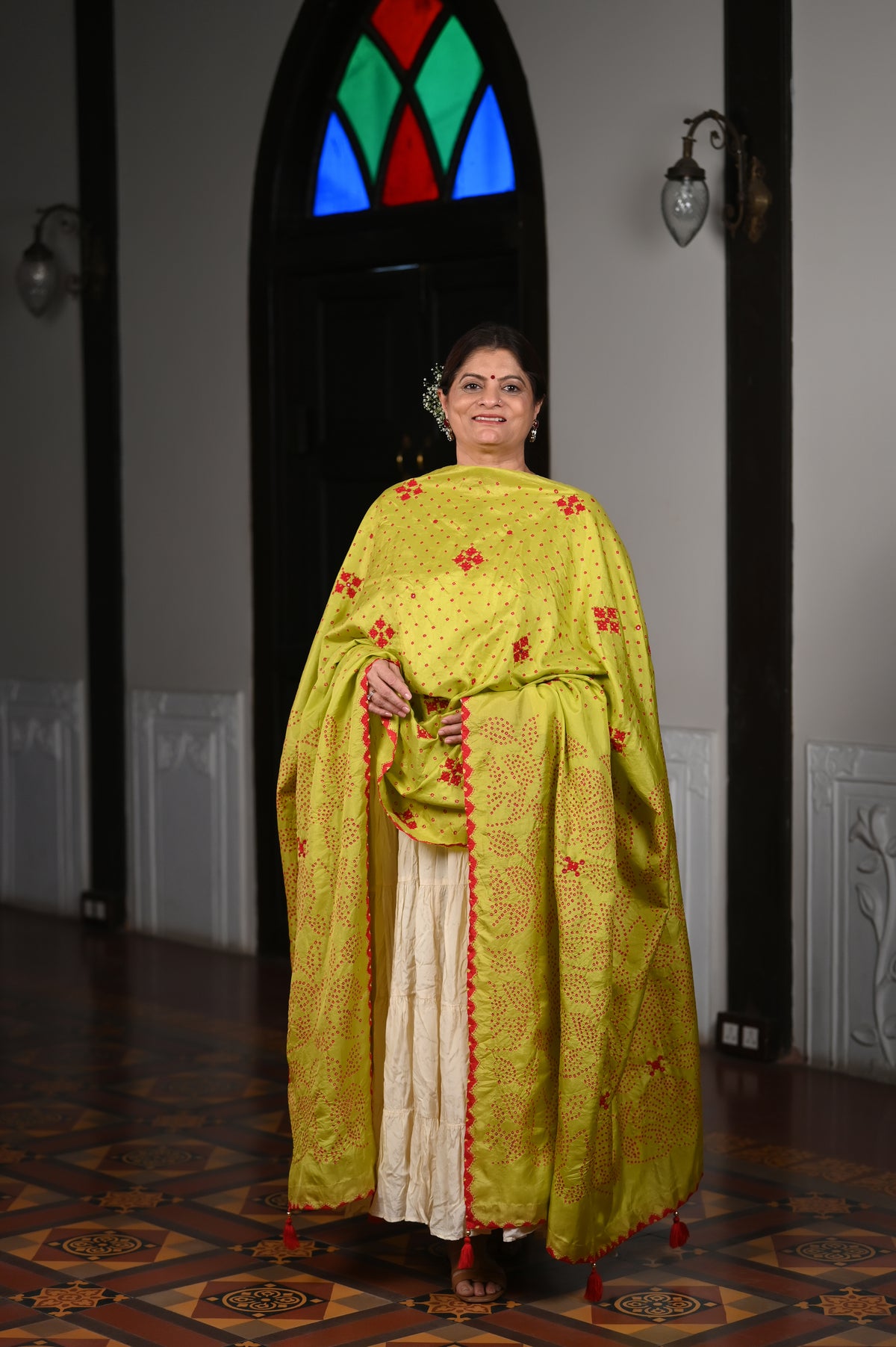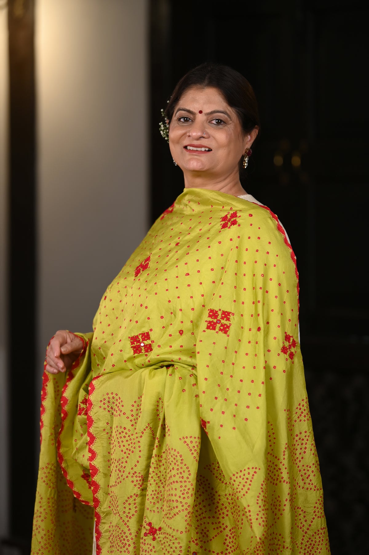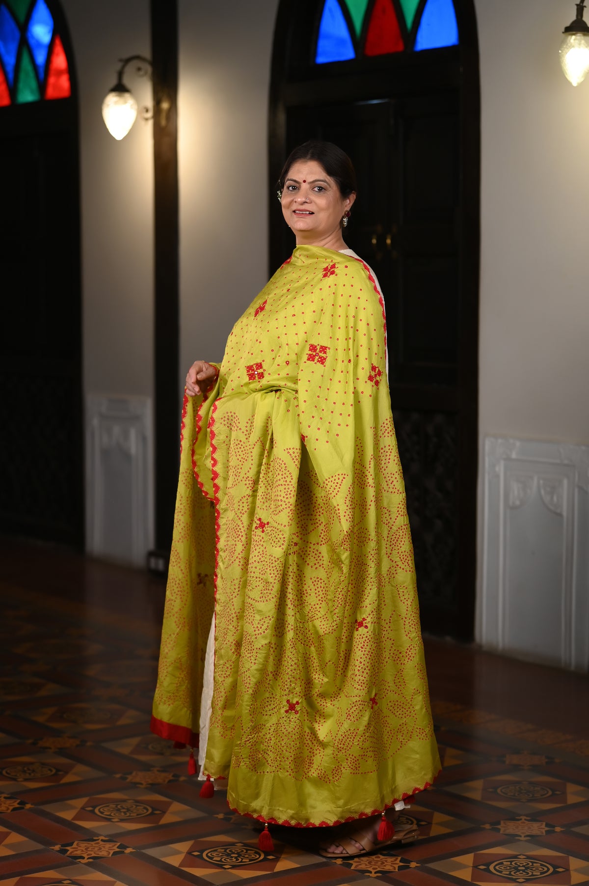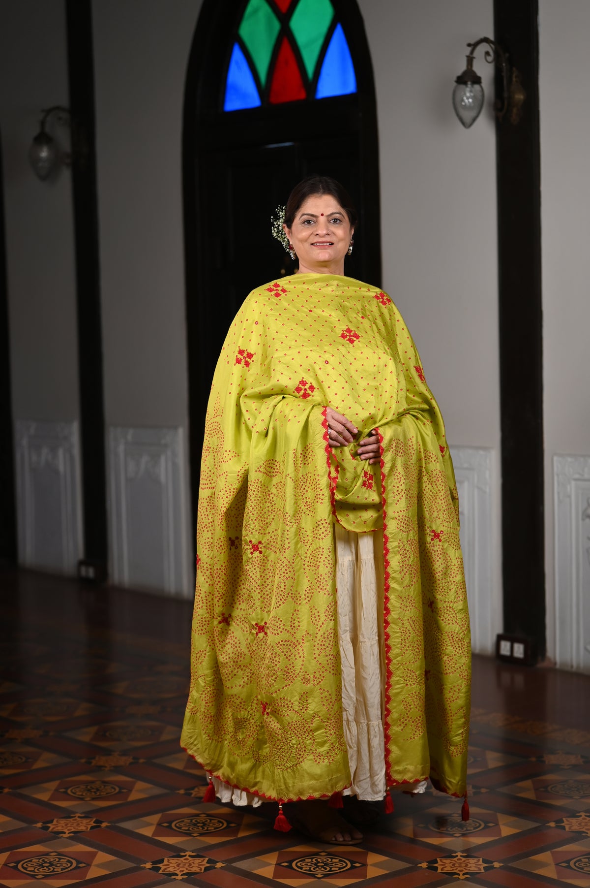 MUSTARD YELLOW POPPY FLOWER BANDHANI SILK DUPATTA WITH EMBROIDERY AND MIRROR BORDER