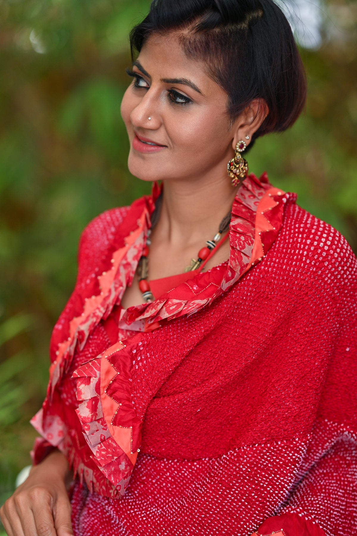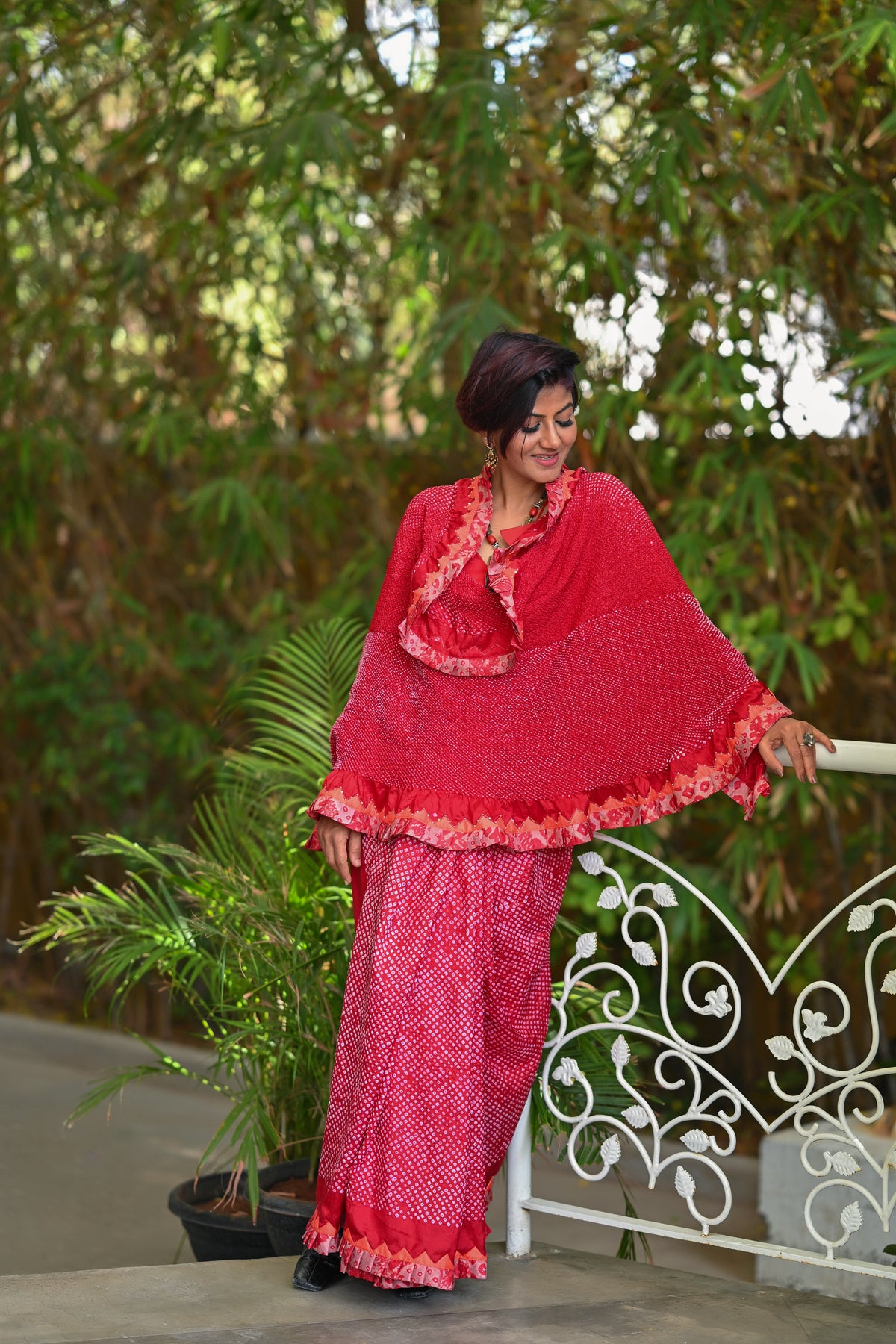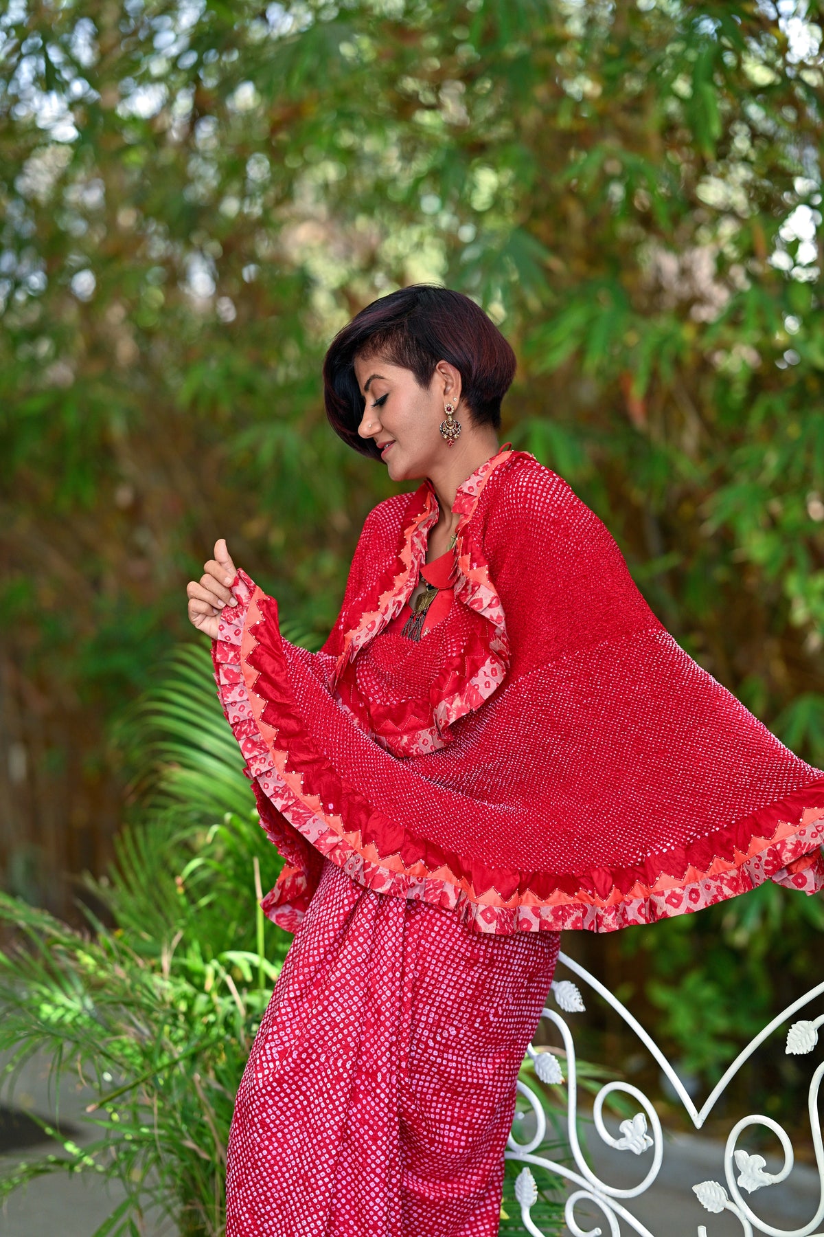 RED ETERNAL DOT SILK BANDHANI SAREE WITH EMBROIDERY AND RUFFLE BORDER