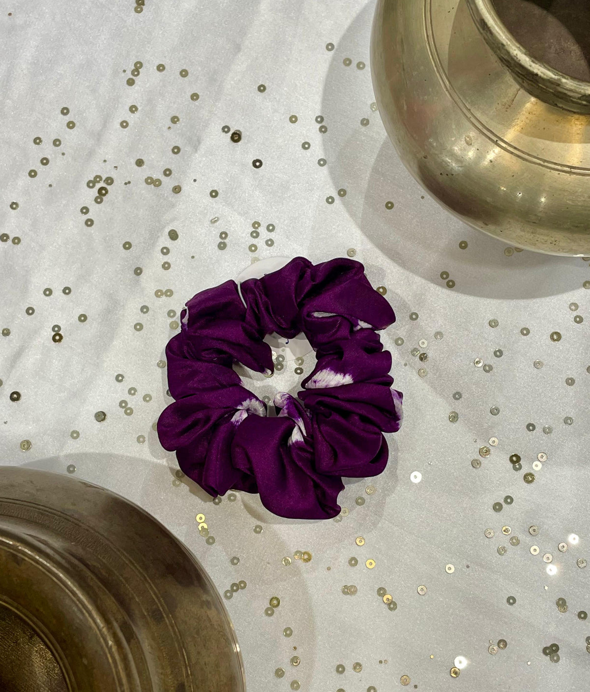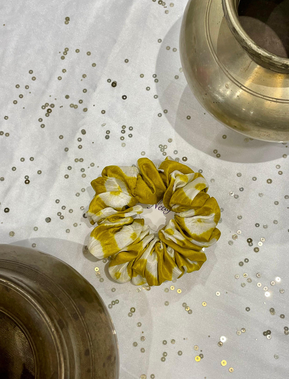 SILK SCRUNCHIES COMBO - LIGHT BLUE, MUSTARD YELLOW AND PURPLE