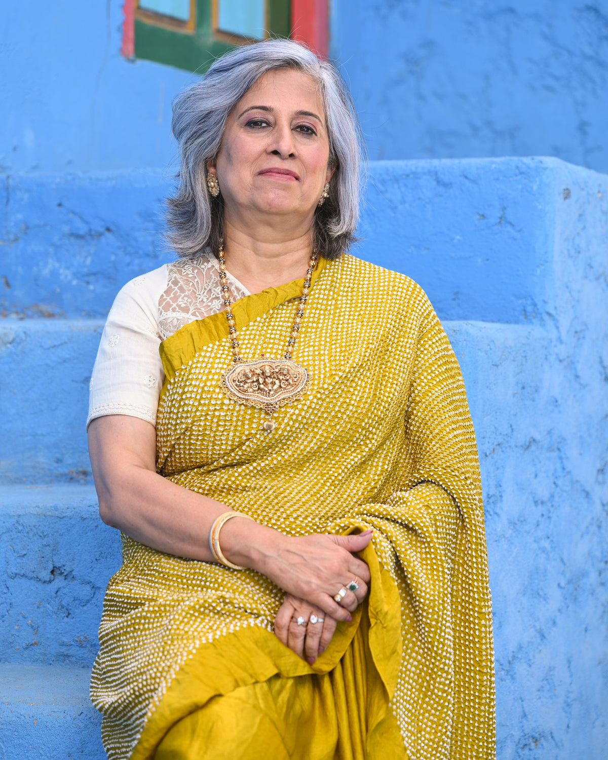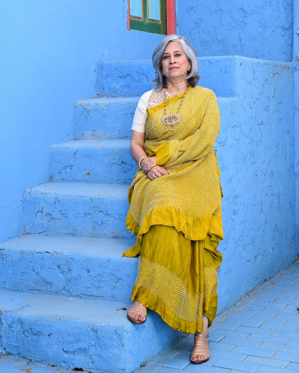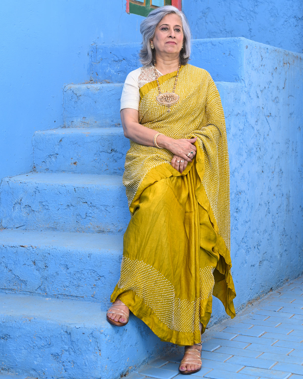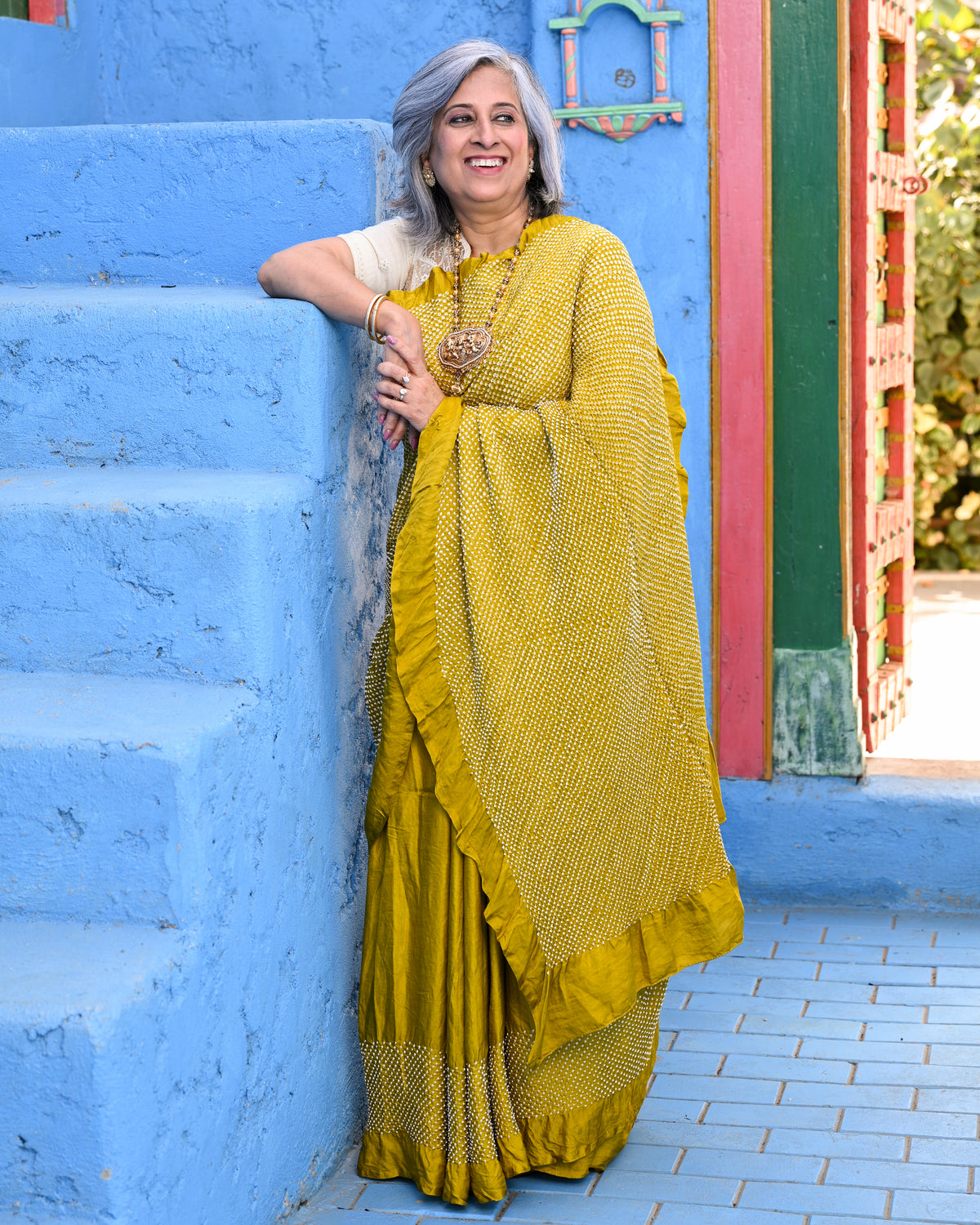 The blouse used on the model is not inclusive; a bandhani silk blouse is included with the saree.