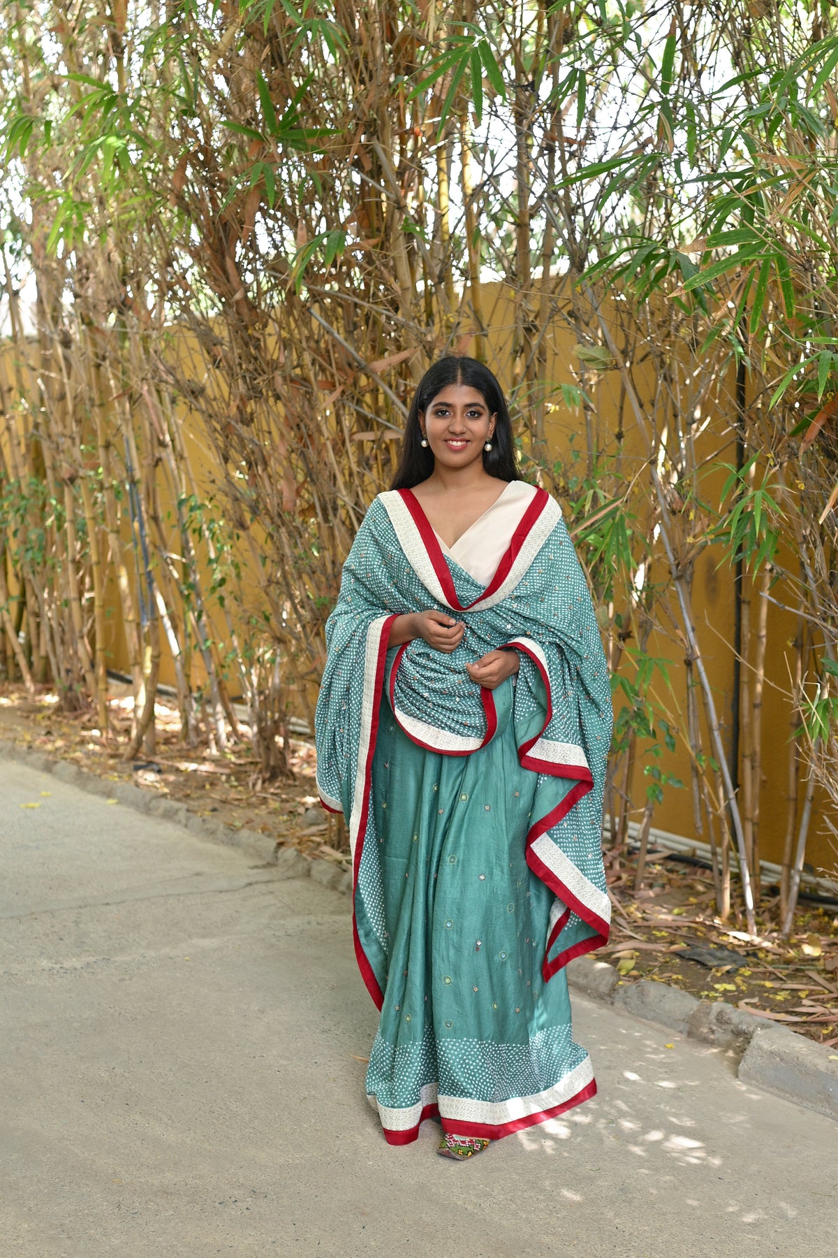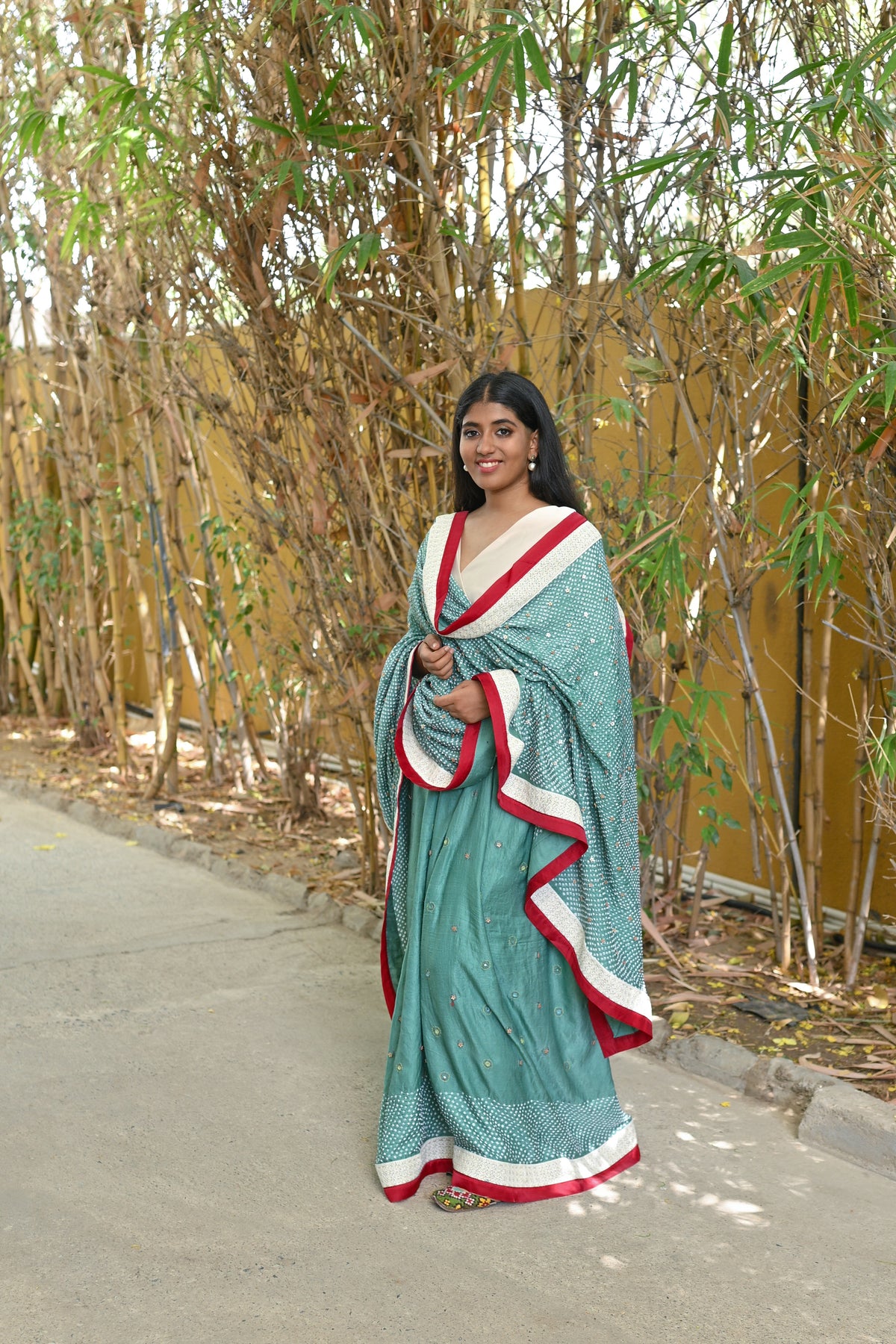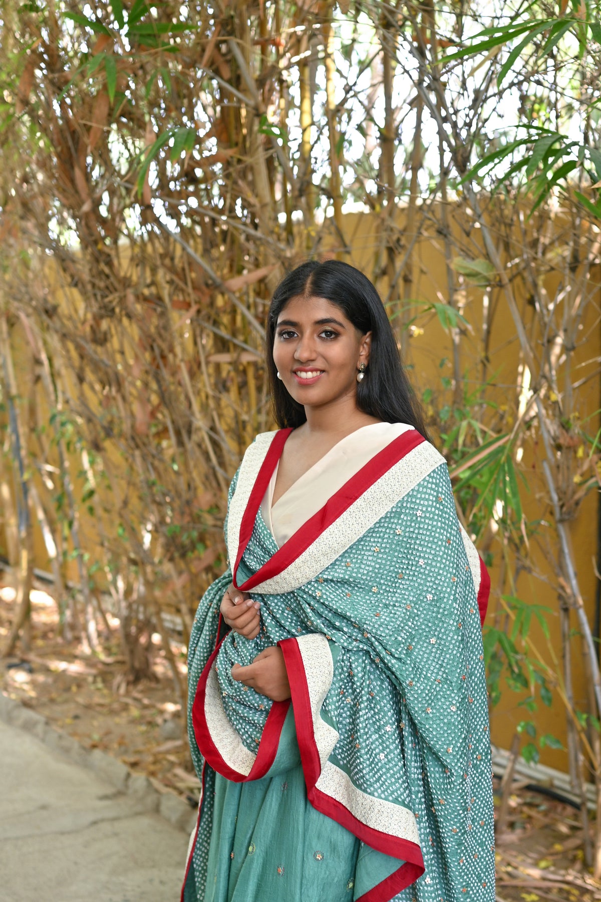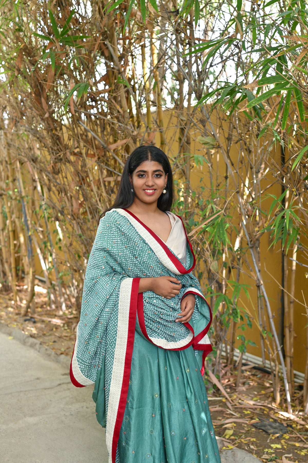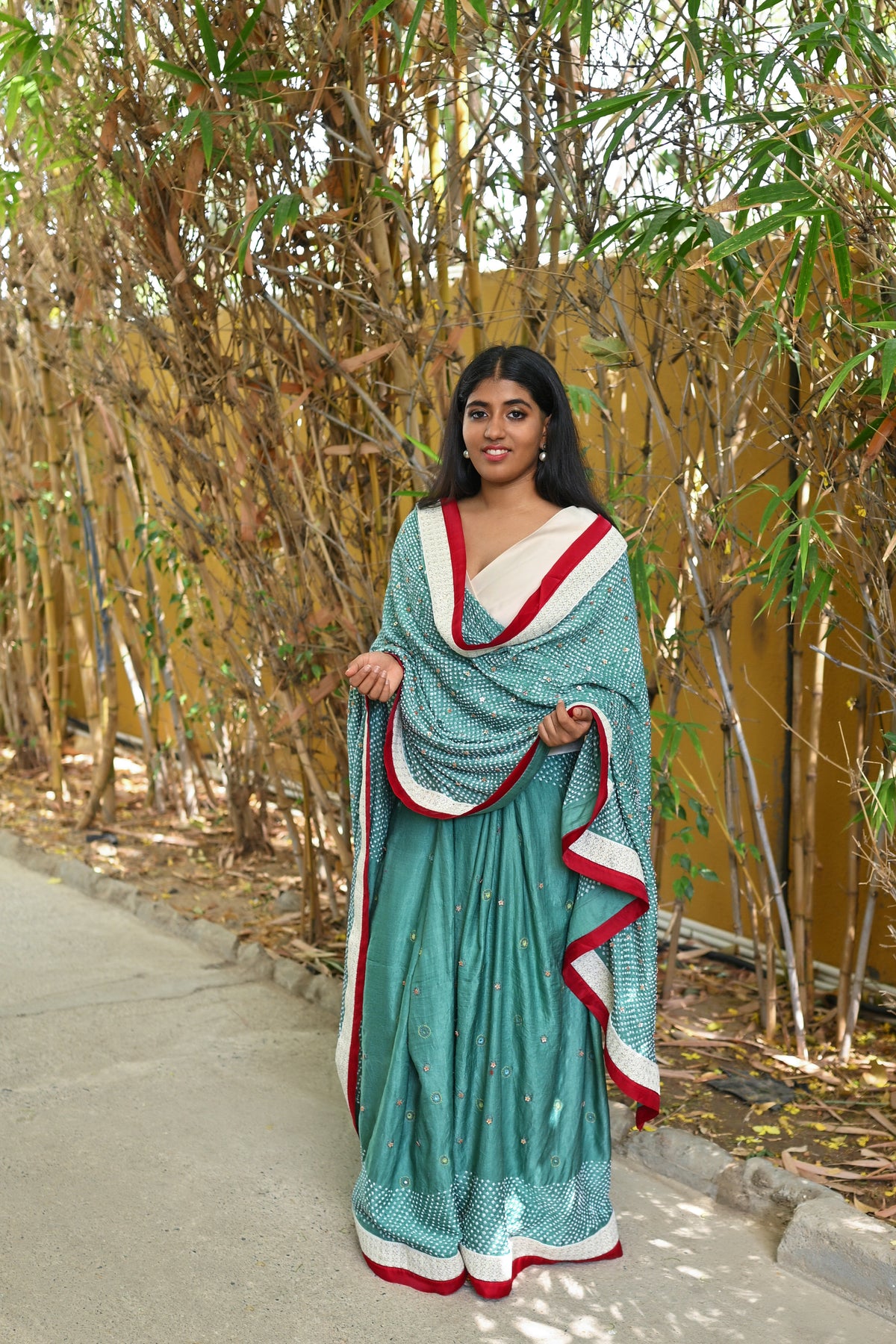 LIGHT GREEN YIN-YANG HALF FULL HALF EMPTY ETERNAL DOT BANDHANI SILK SAREE WITH EMBROIDERY AND LACE