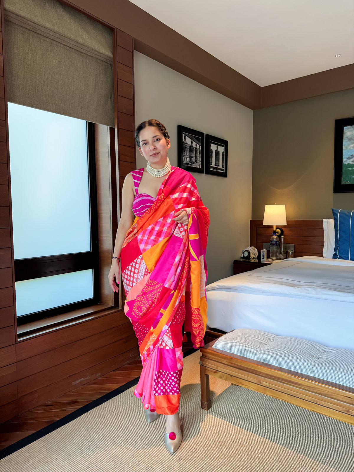 Neelgar's Patchwork Saree from the "Baradozi Collection" combines various fabric techniques to create a reversible masterpiece that can be worn on both sides, adding convenience to your wardrobe. Each saree is uniquely crafted with different patches, ensuring no two pieces are alike. Pure silk and super light, besides layers of fabric.