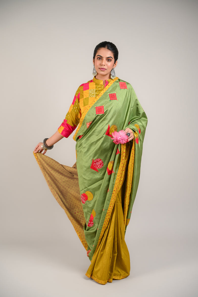 GREEN-GREY JAPANESE BANDHANI SILK SAREE