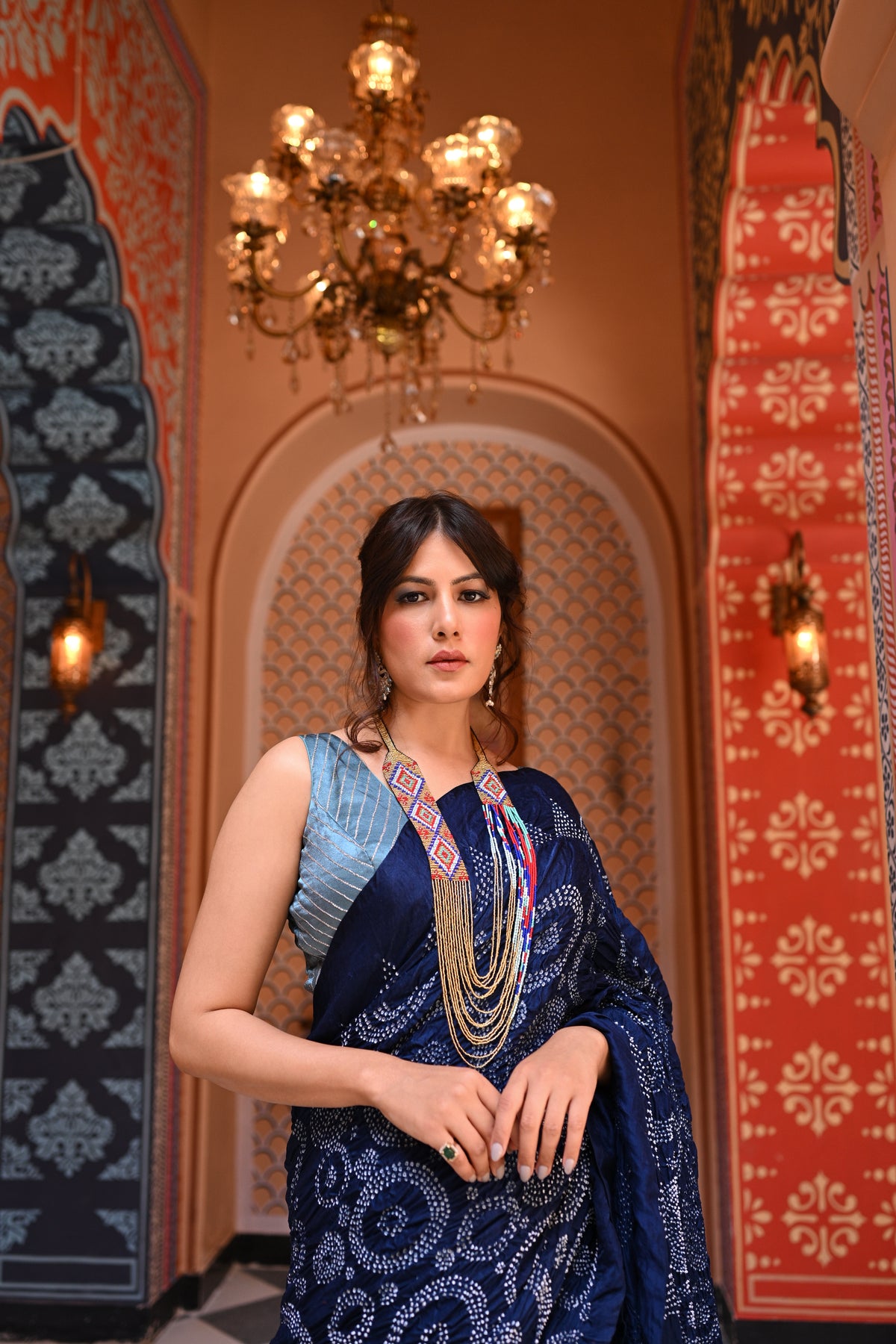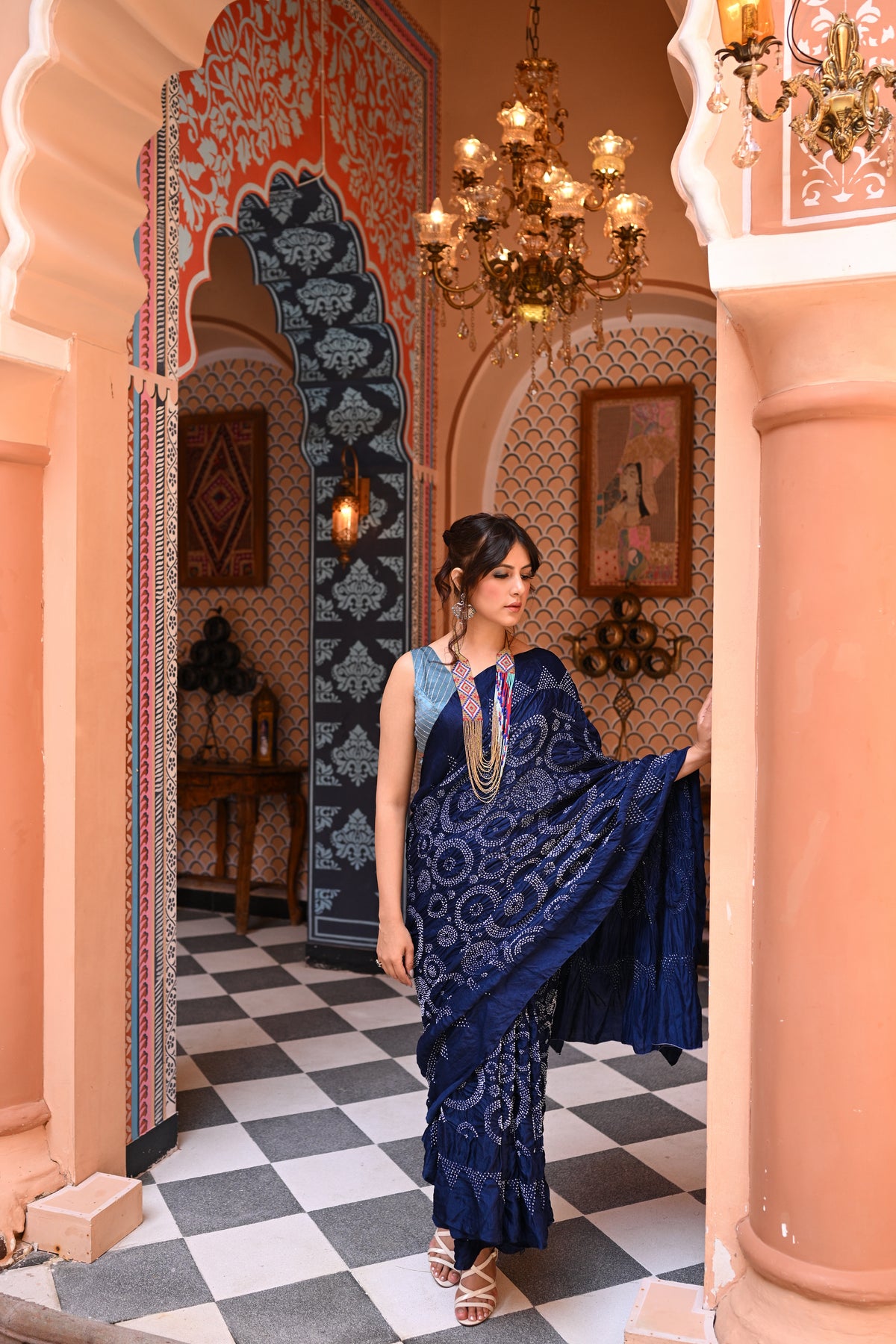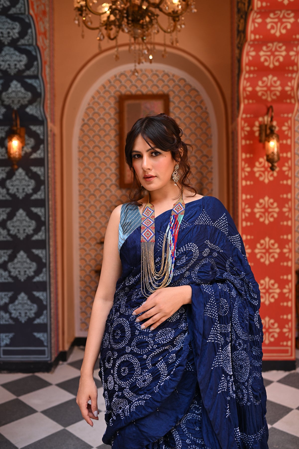 The blouse used on the model is not inclusive; a bandhani silk blouse is included with the saree.