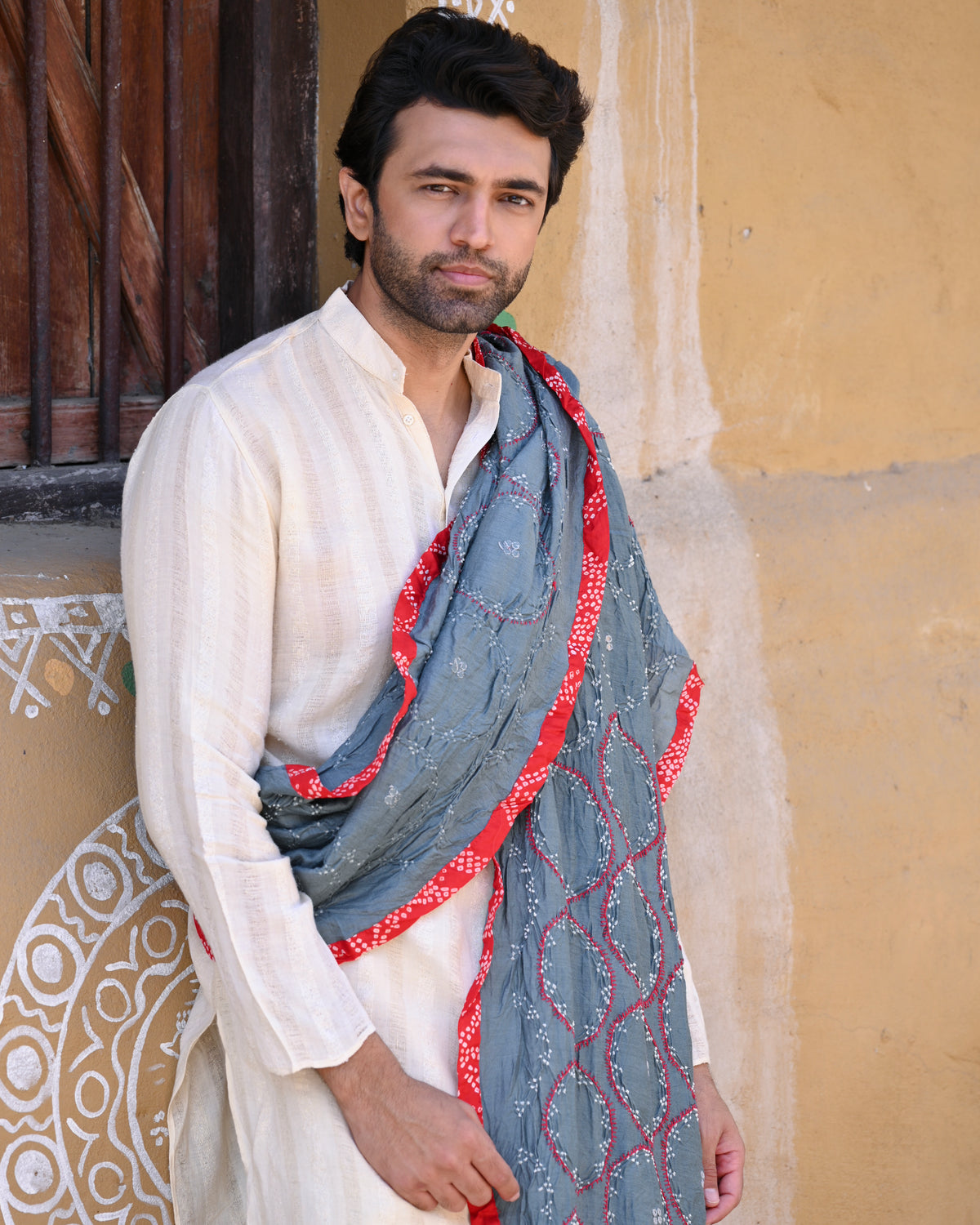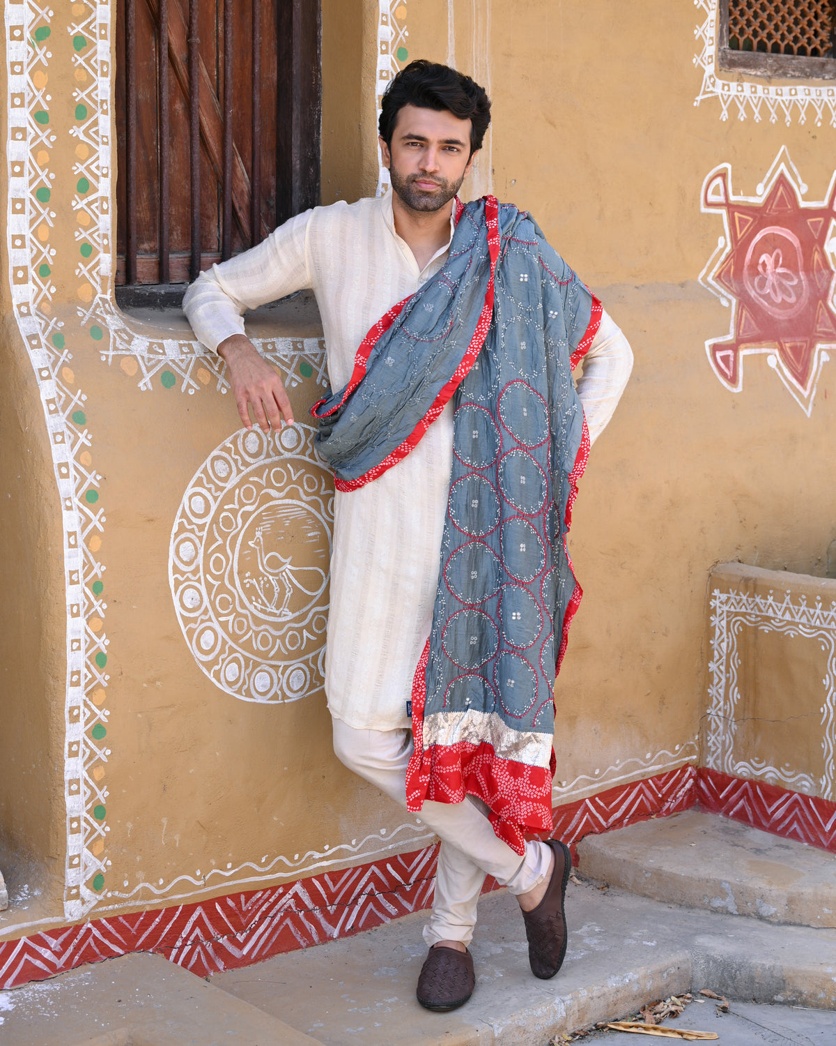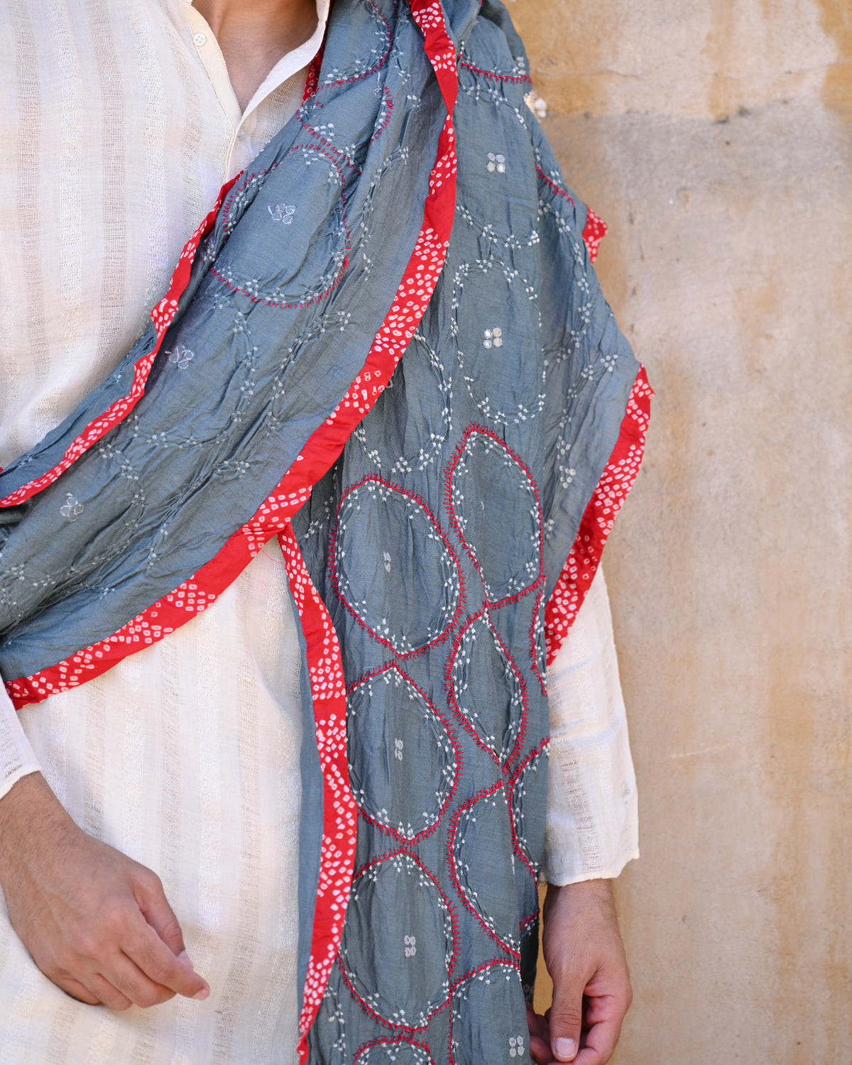 GREY CIRCLES OF THE LIFE BANDHANI SILK DUPATTAL WITH SILK BORDER, LAMPI AND MIRROR WORK