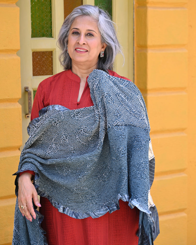 GREY PAISLEY BANDHANI SILK DUPATTA WITH LAMPI BORDER AND TASSELS
