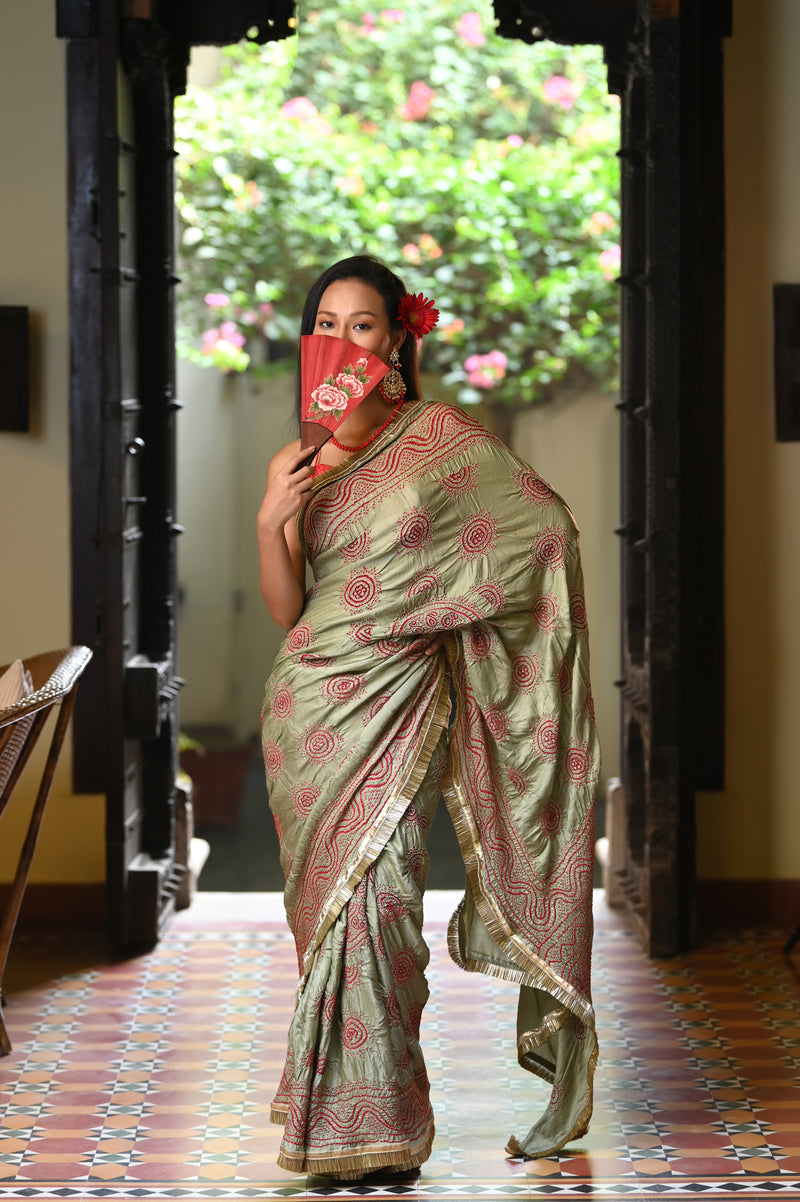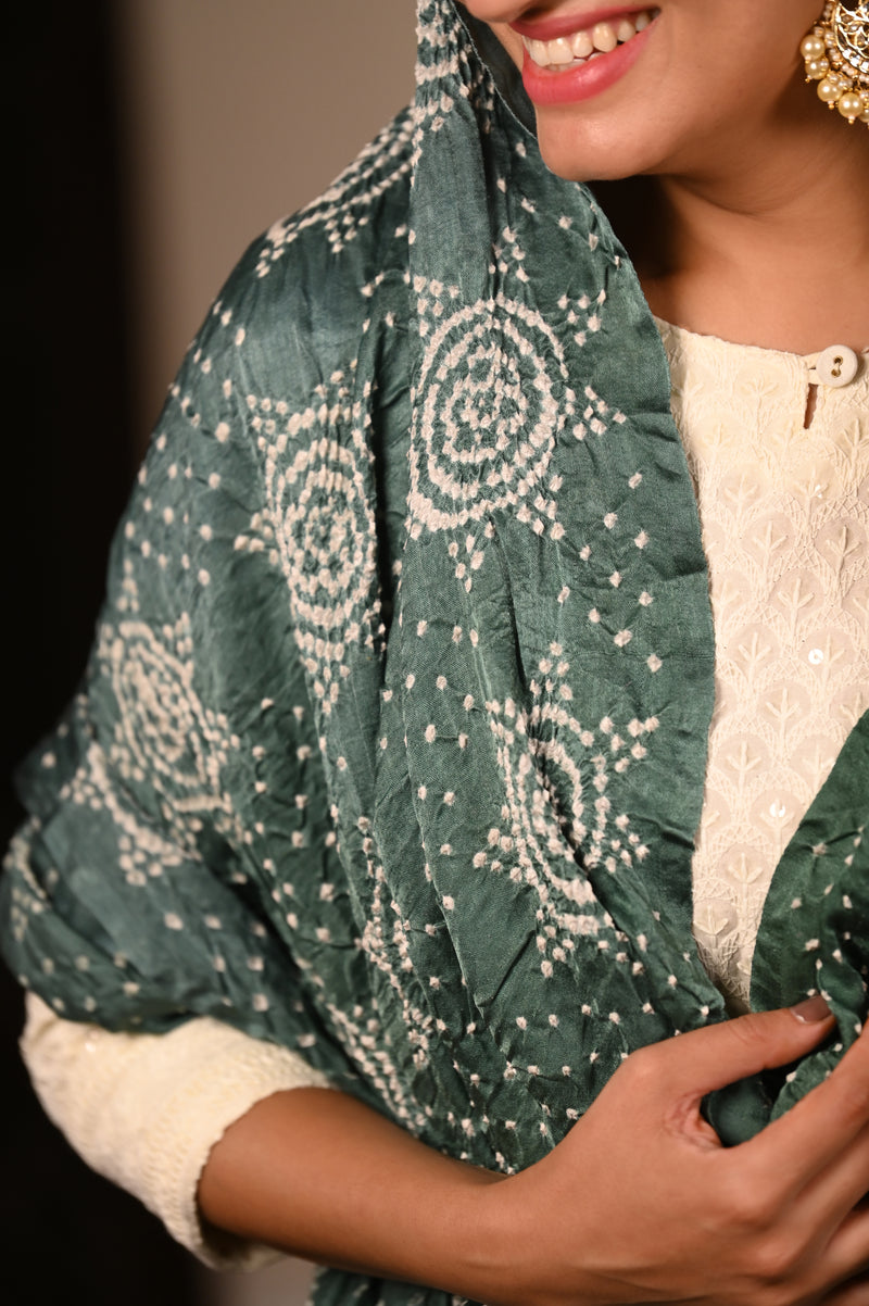 GREY-GREEN CLASSIC TRADITIONAL BANDHANI SILK DUPATTA WITH MUKAISH WORK AND KIRAN BORDER