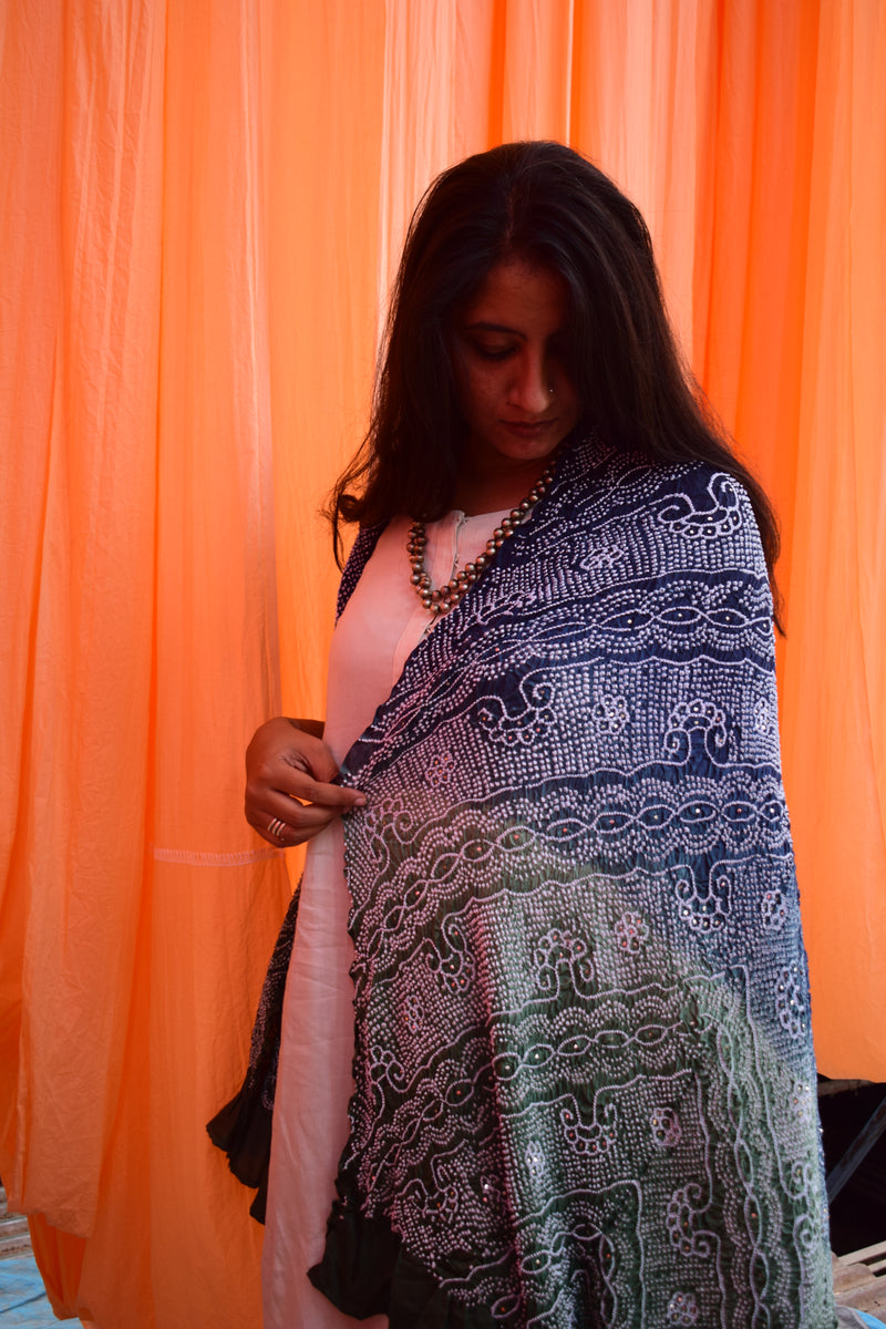 GREEN-NAVY BLUE FLOWER BANDHAANI SILK DUPATTA