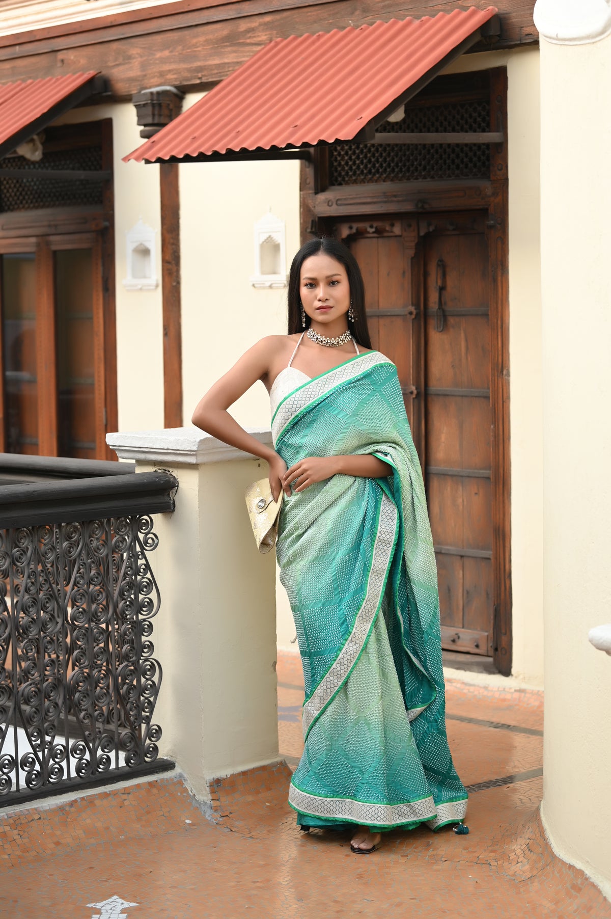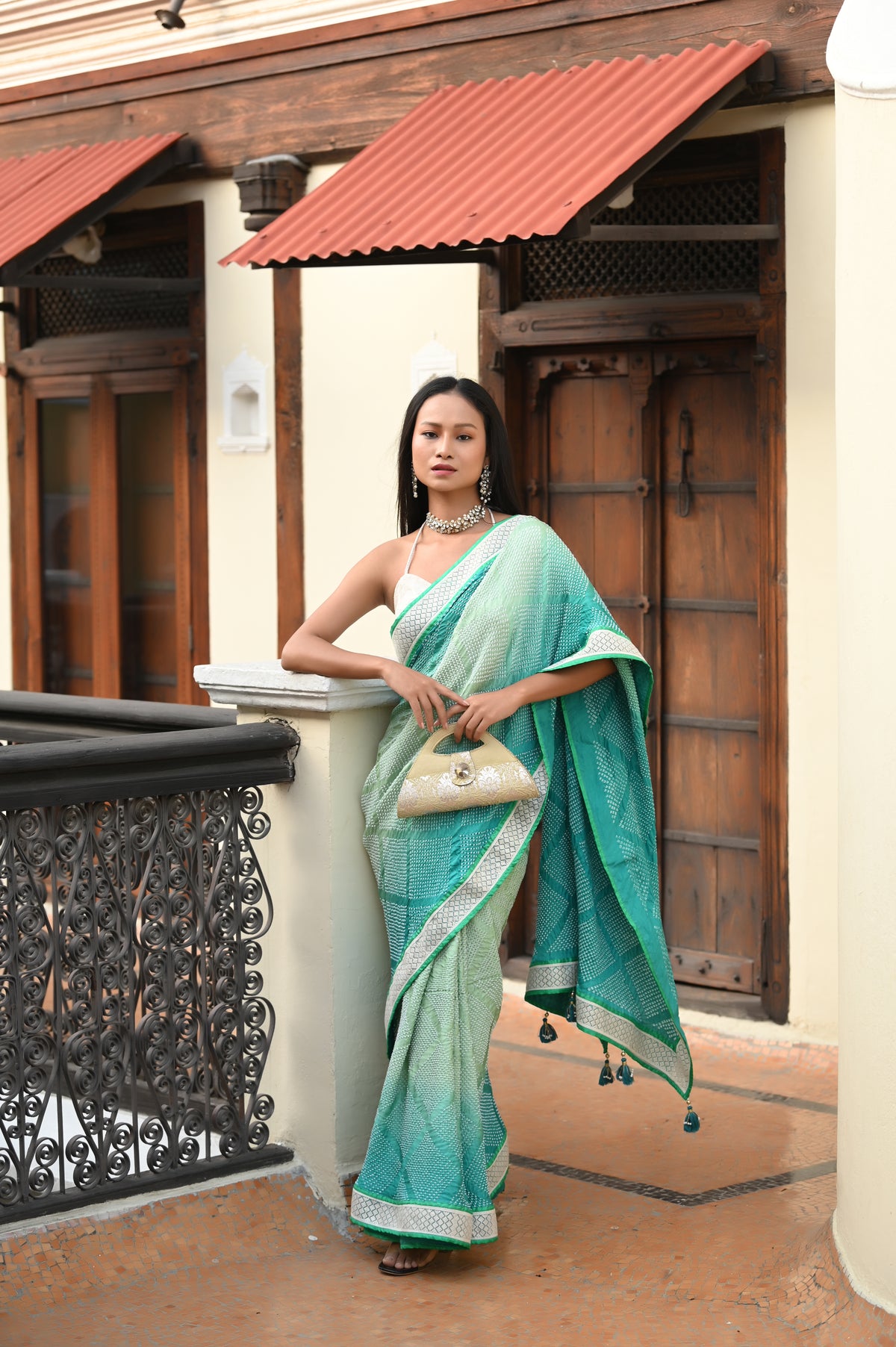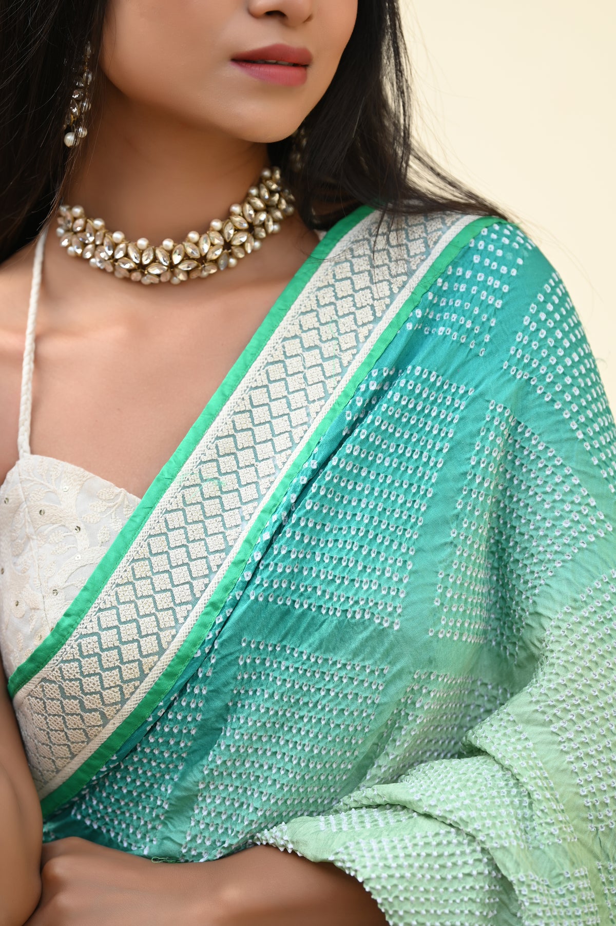 LIGHT GREEN DIAMOND GEOMETRIC BANDHANI SAREE WITH LACE BORDER AND TASSELS