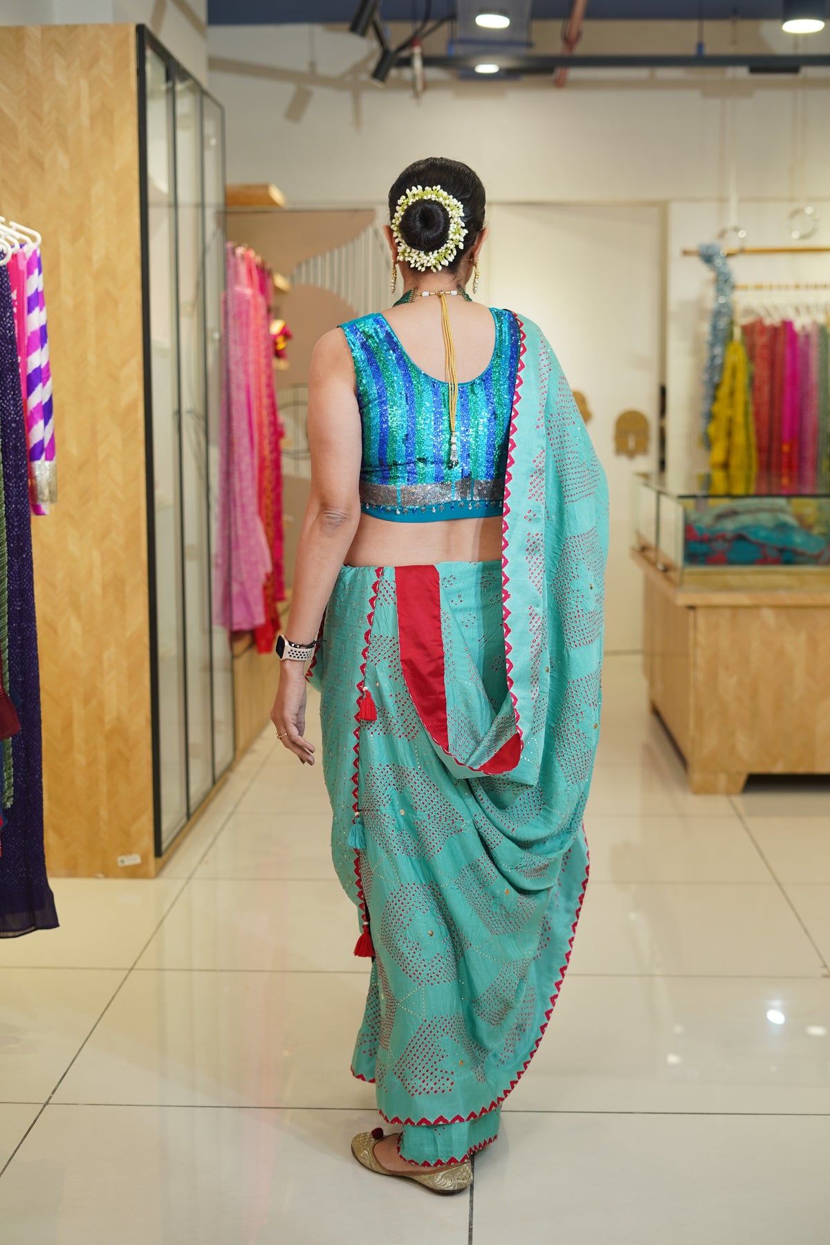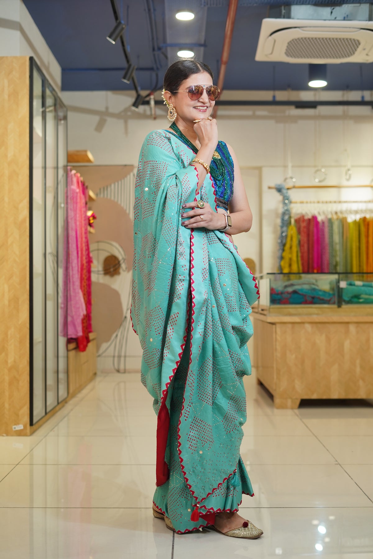 LIGHT BLUE F4 GEOMETRIC SILK BANDHANI SAREE WITH MUKAISH WORK