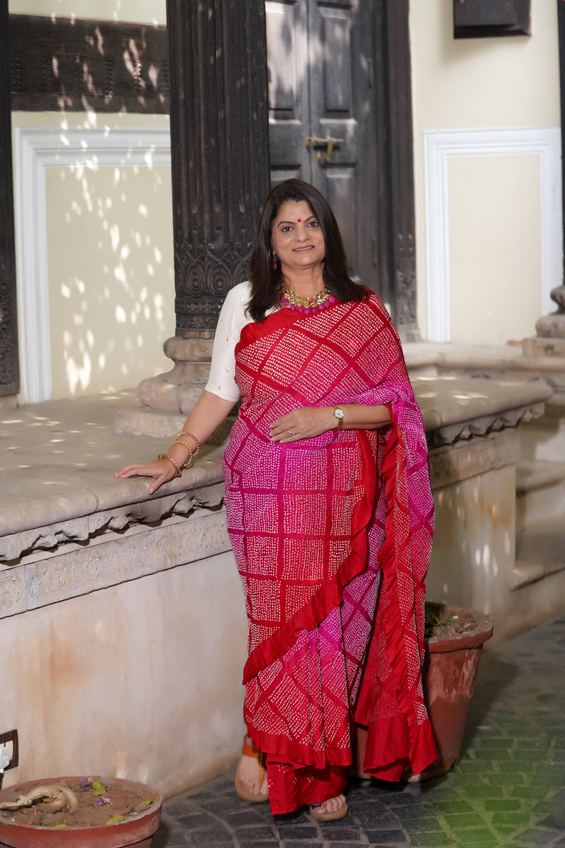PINK-RED DIAMOND GEOMETRIC BANDHANI SILK SAREE