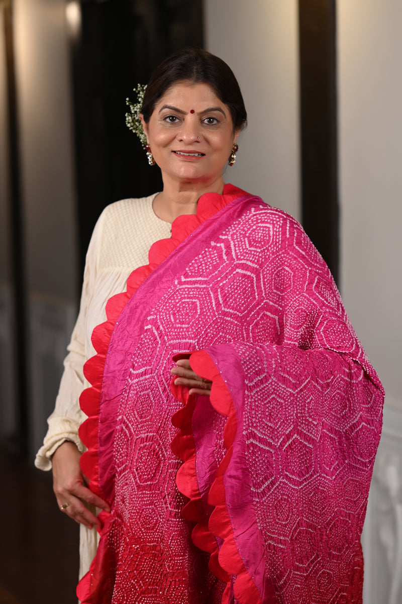 PINK-RED HONEYCOMB GEOMETRIC BANDHANI SILK DUPATTA WITH SCALLOP BORDER