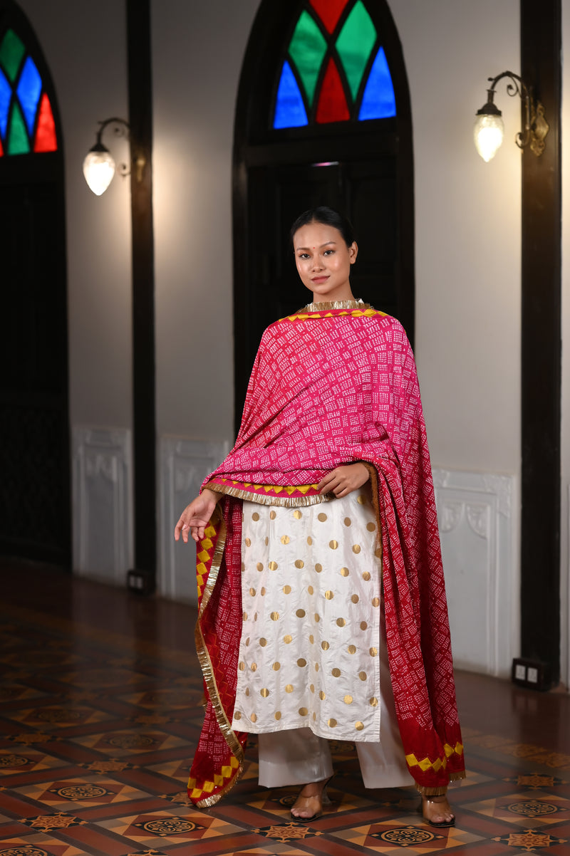 PINK-RED GEOMETRIC BANDHANI SILK DUPATTA WITH APPLIQUE BORDER AND KIRAN