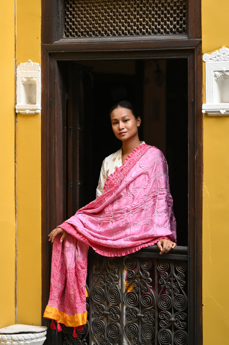 PINK MALAYSIAN IKAT BANDHANI SILK DUPATTA WITH EMBROIDERY AND TASSELS