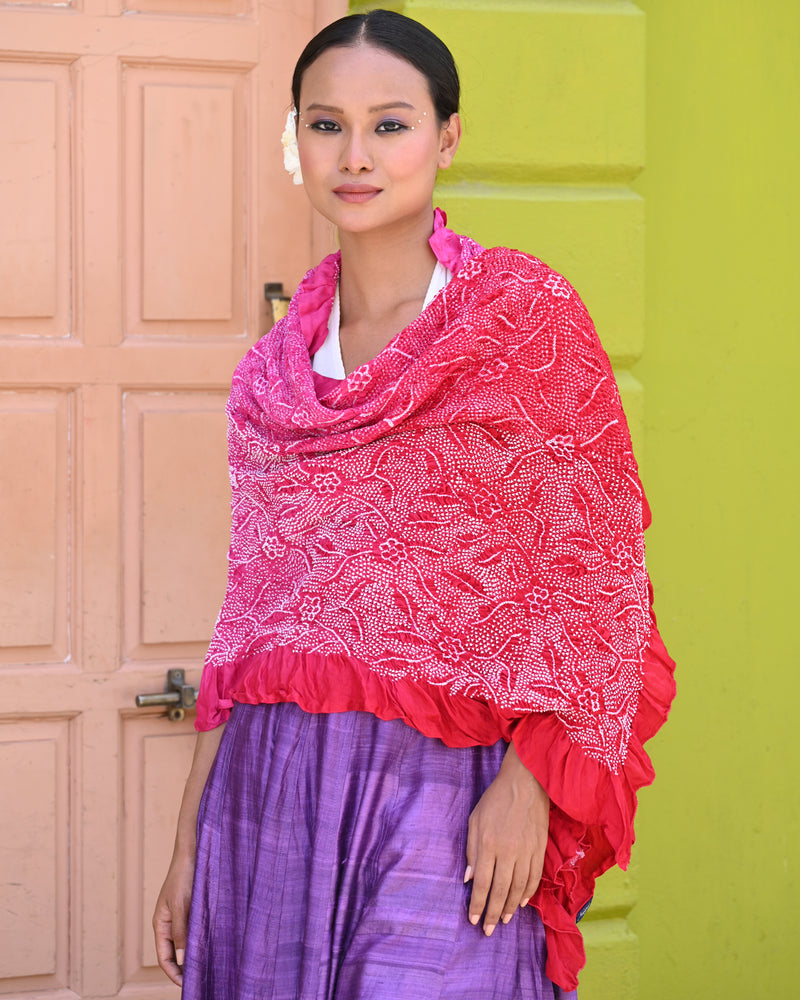 PINK-RED FLOWER BANDHANI SILK DUPATTA
