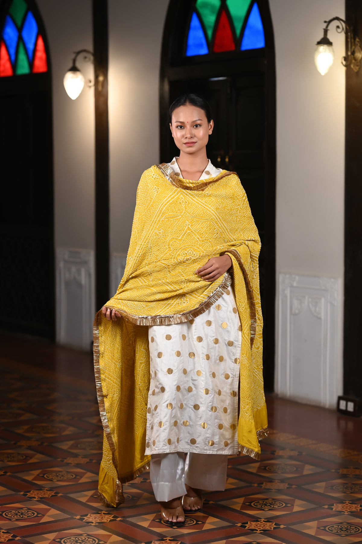 Rumal Bandhani, also known as Rumal Bandhej. This cotton rumal was so amazing that, to preserve the design and its reach, we converted it into a dupatta, which is a specialized form of the traditional Bandhani tie-dye technique, characterized by its intricate patterns on small pieces of fabric, typically used as handkerchiefs. This style showcases the remarkable skill and precision of artisans who create detailed motifs such as floral designs, geometric shapes, and traditional symbols.