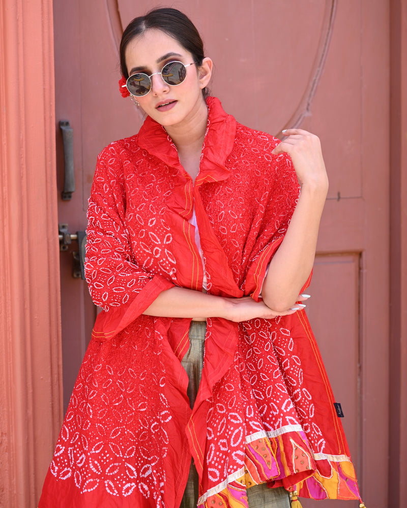 RED CHANDRAKHUNI BANDHANI SILK DUPATTA WITH MARODI WORK
