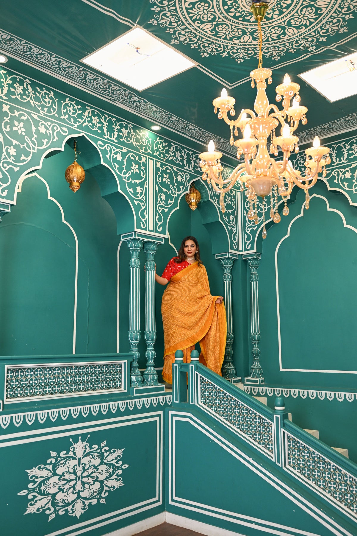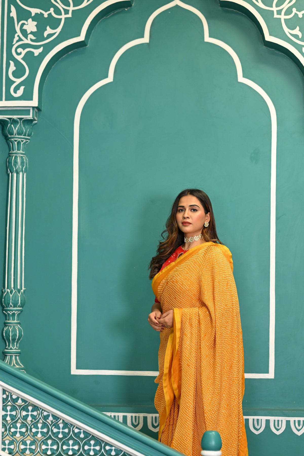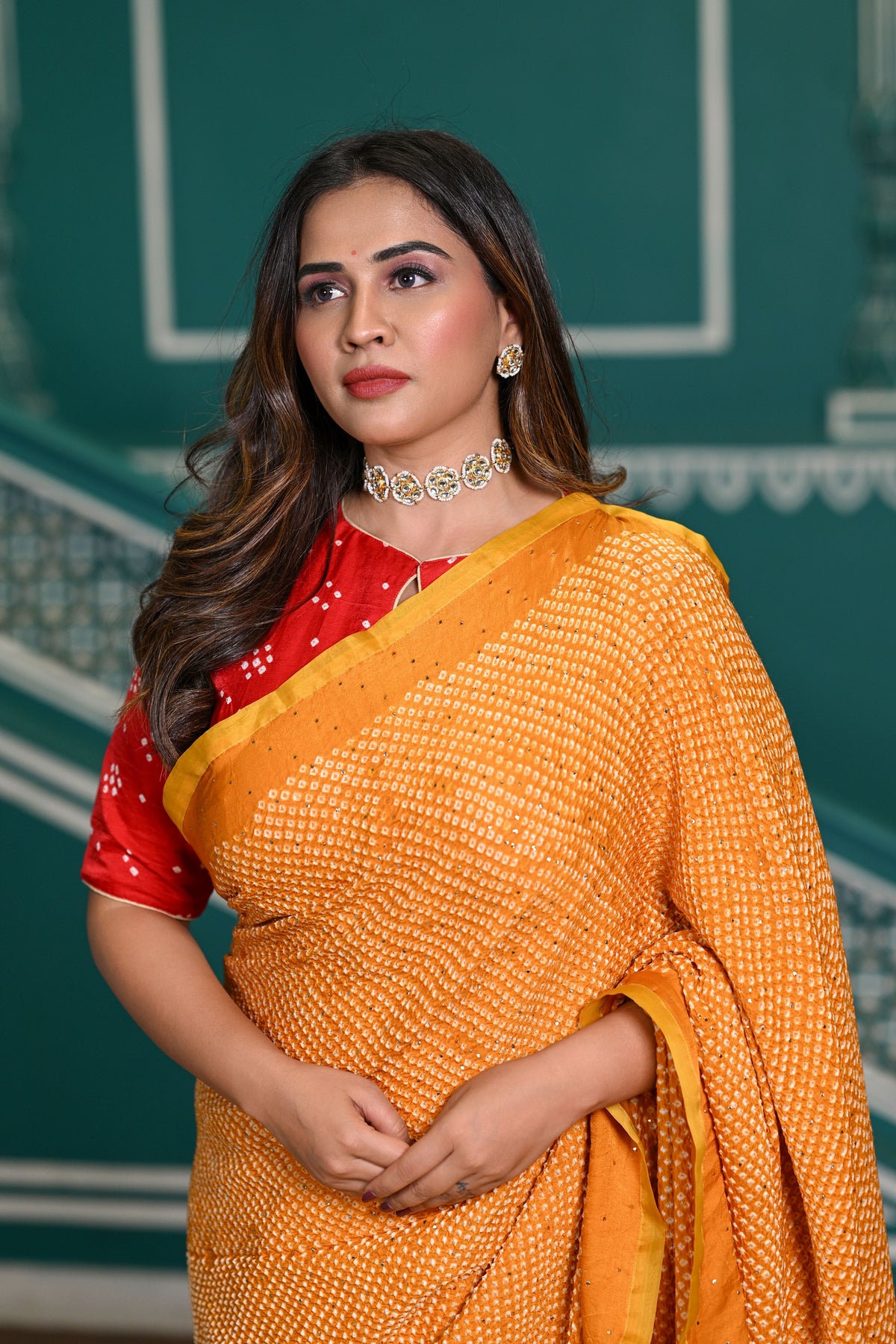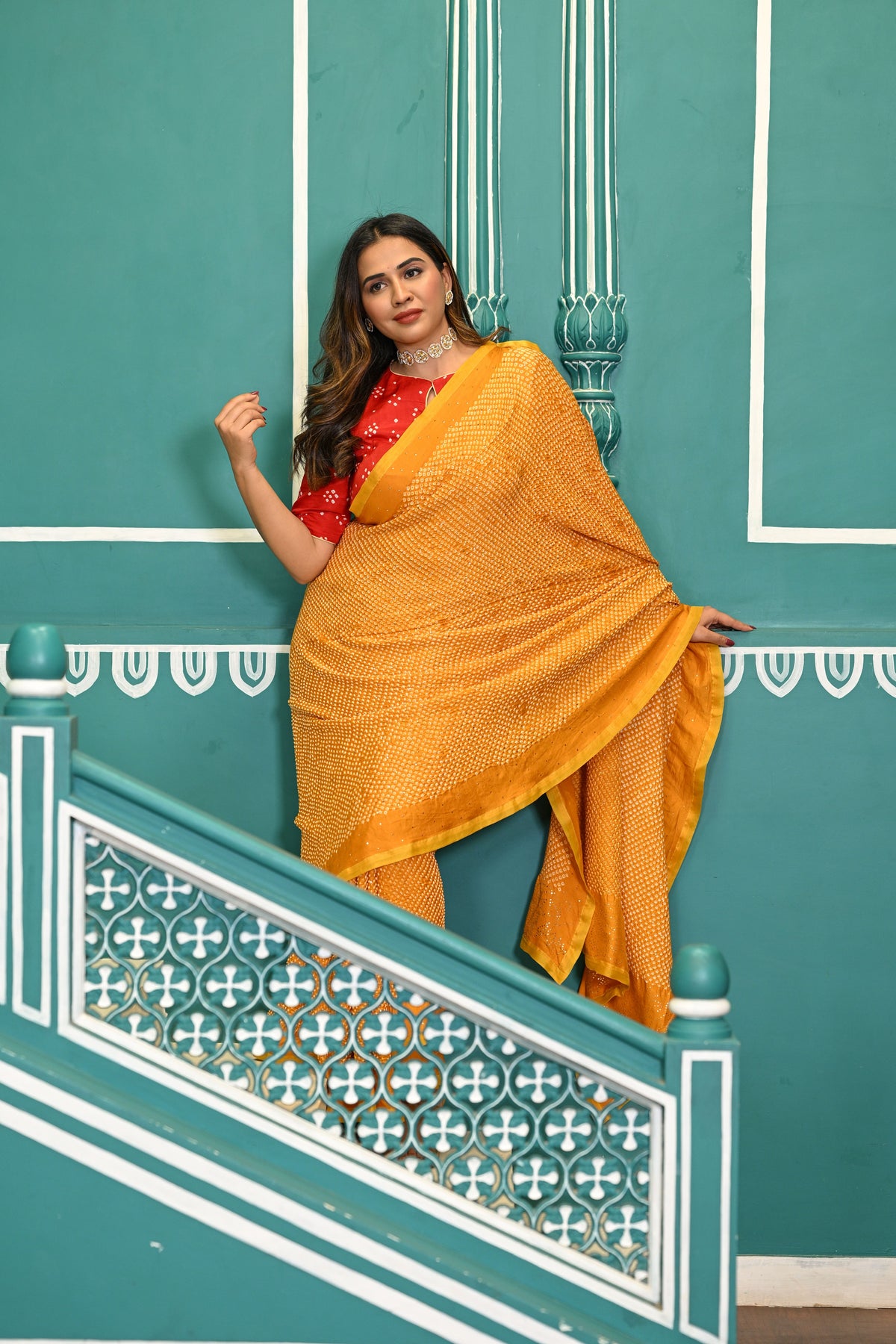 GOLDEN YELLOW ETERNAL DOT BANDHANI SILK SAREE WITH MUKAISH WORK
