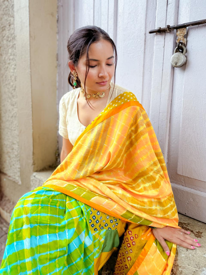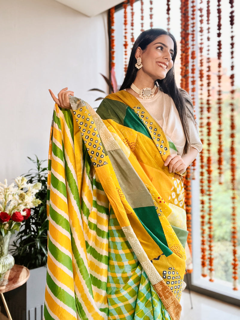 YELLOW-GREEN BAARADOZI PATCHWORK REVERSIBLE SILK SAREE