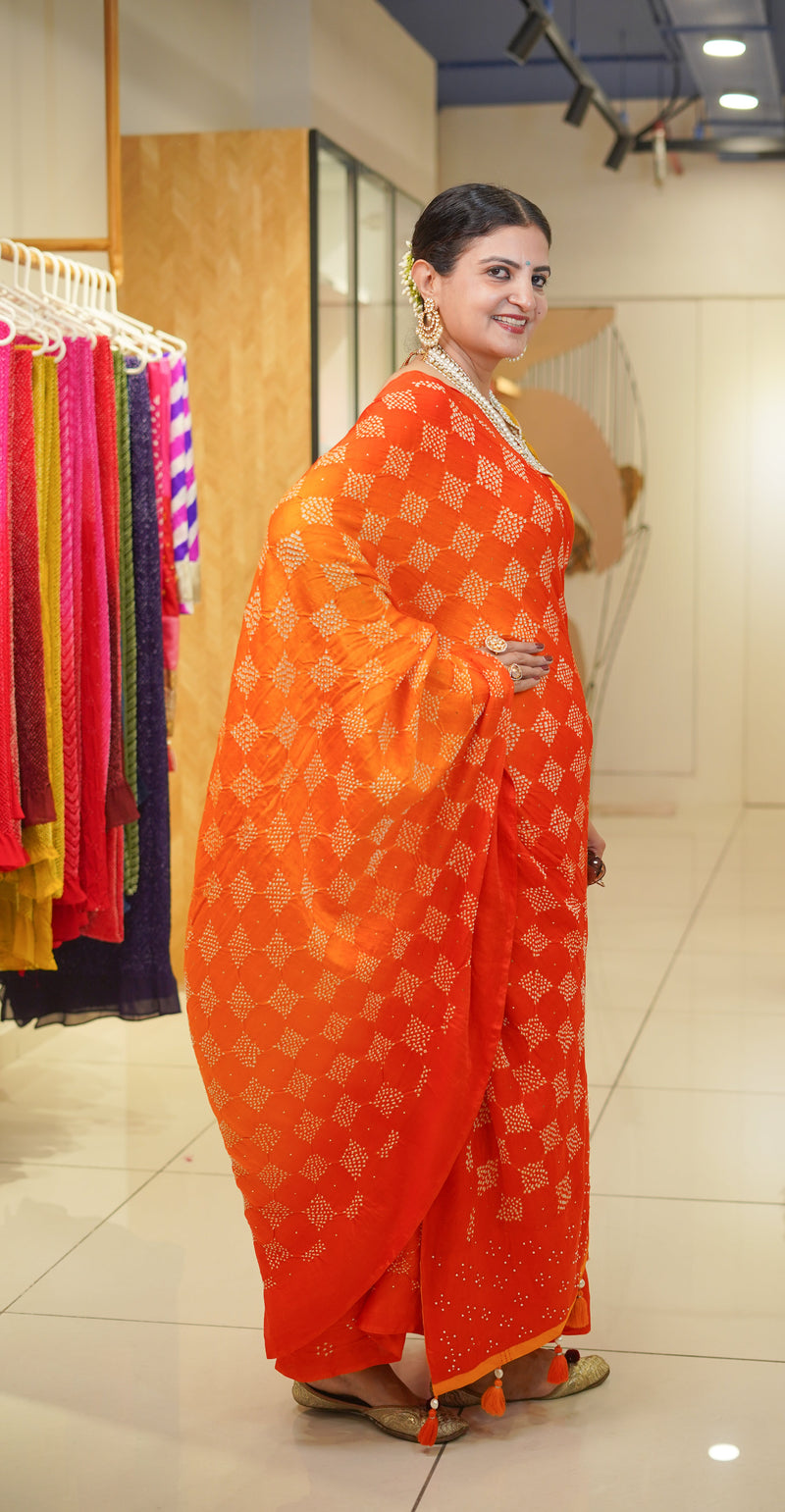 YELLOW-ORANGE S3 GEOMETRIC SILK BANDHANI SAREE WITH MUKAISH AND STONE WORK