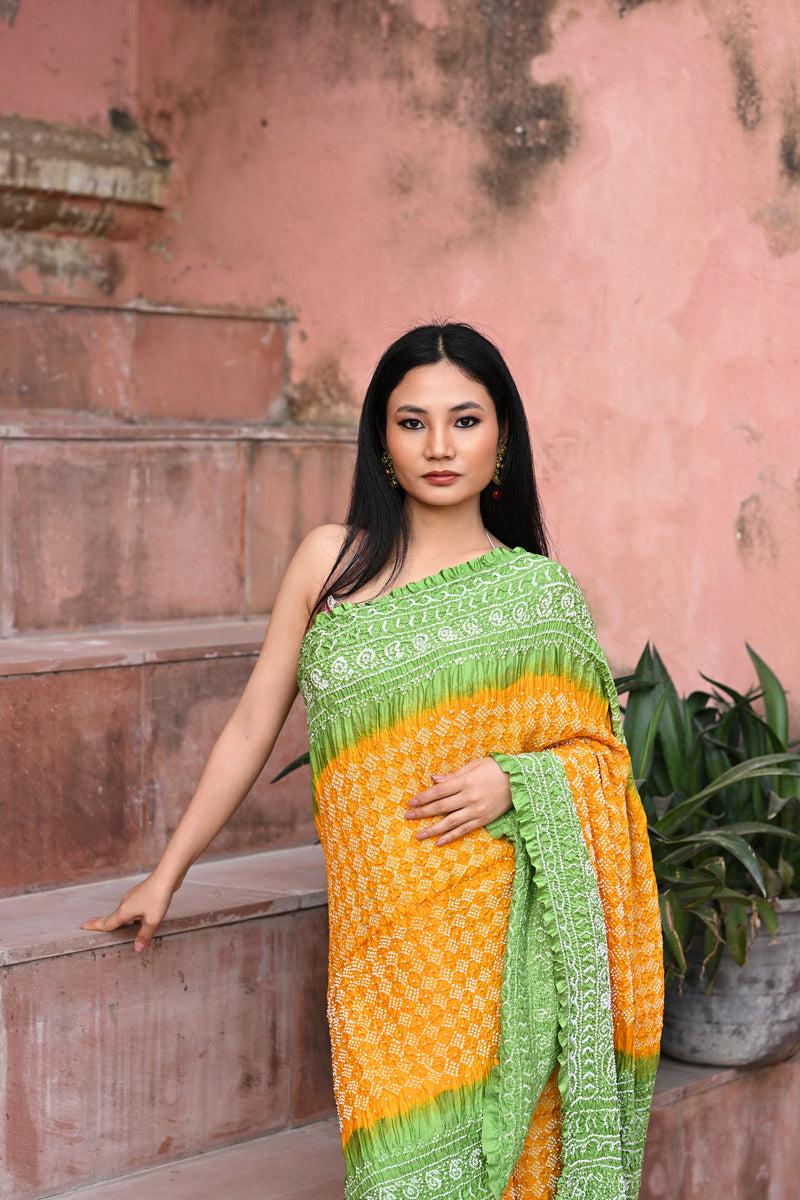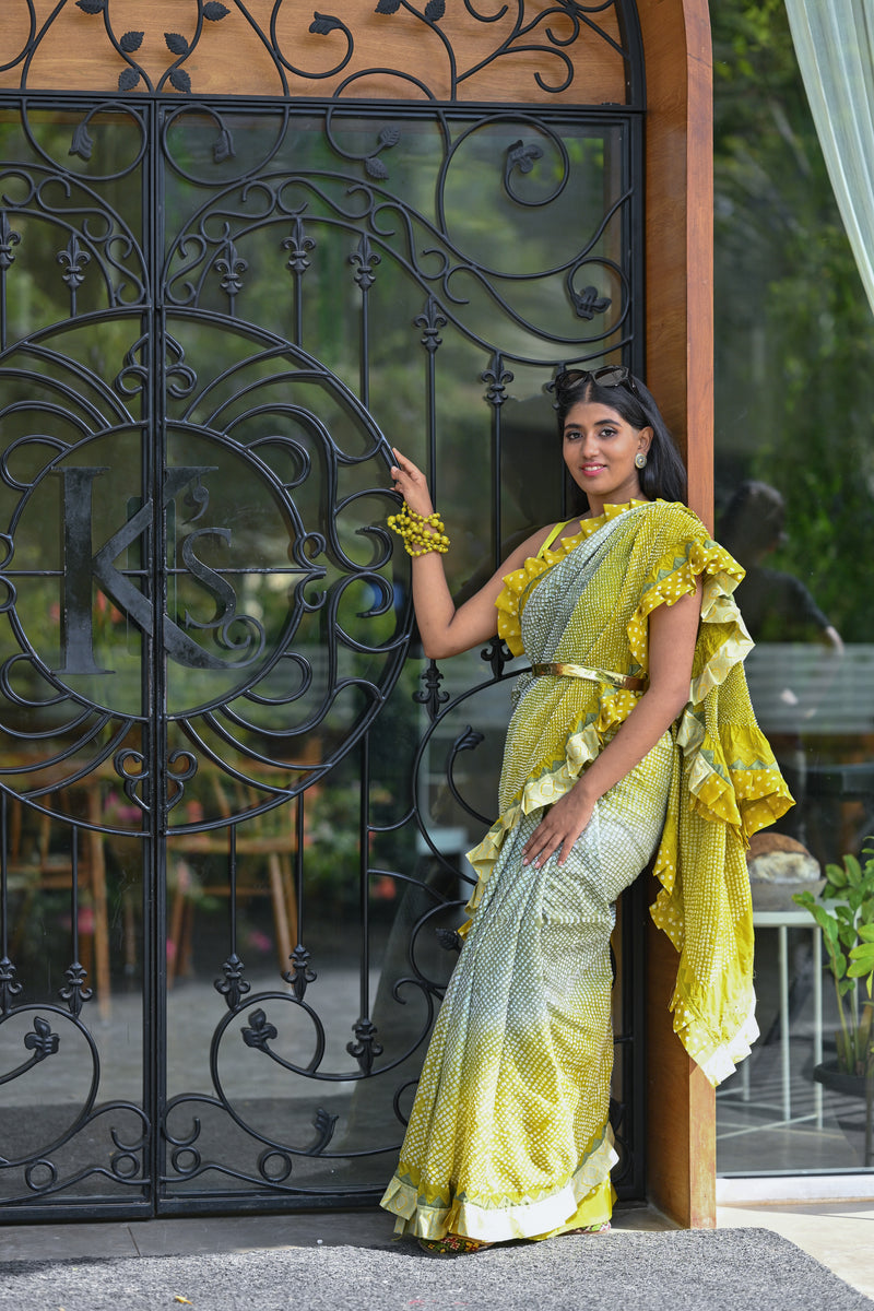 YELLOW-GREY SILK BANDHANI SAREE WITH EMBROIDERY AND RUFFLE BORDER