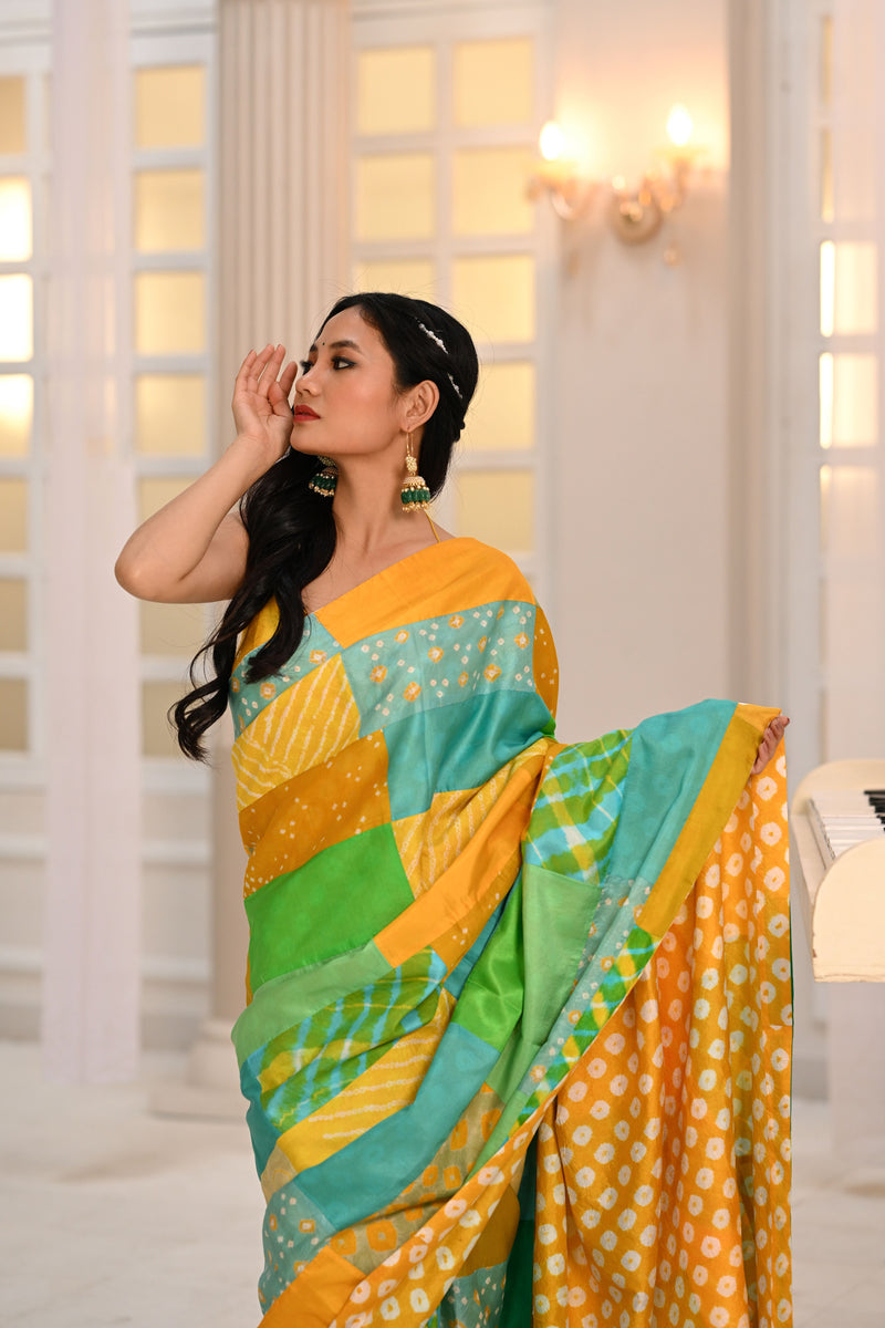 YELLOW-GREEN CLASSIC TRADITIONAL BANDHANI SILK SAREE