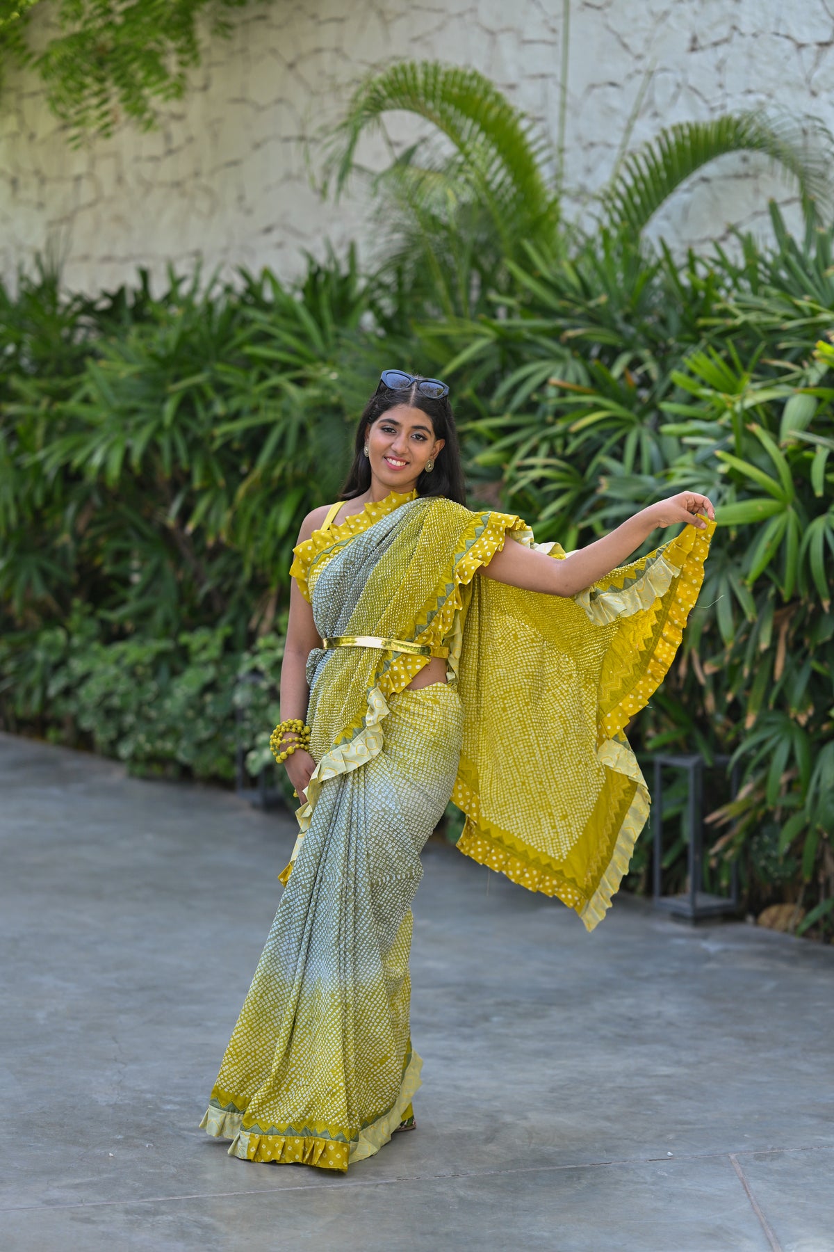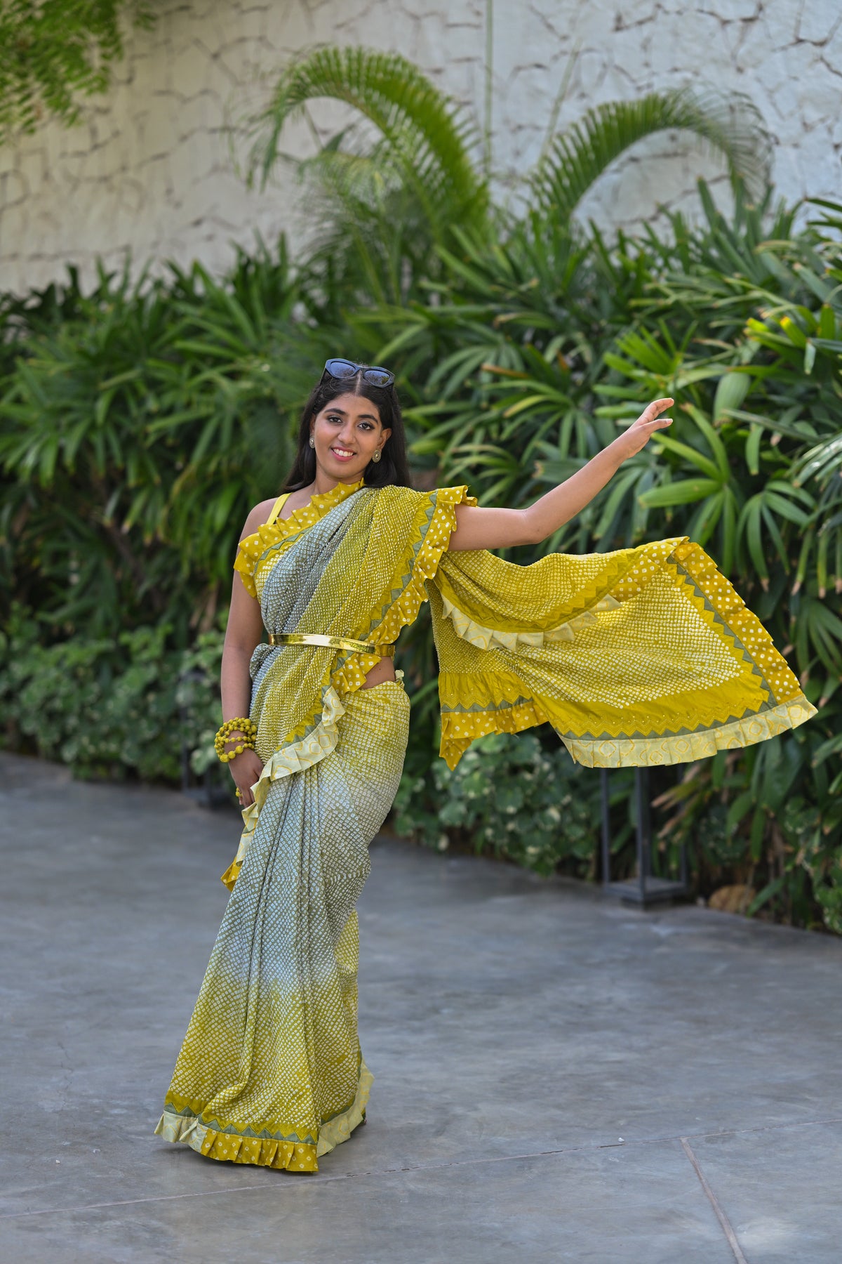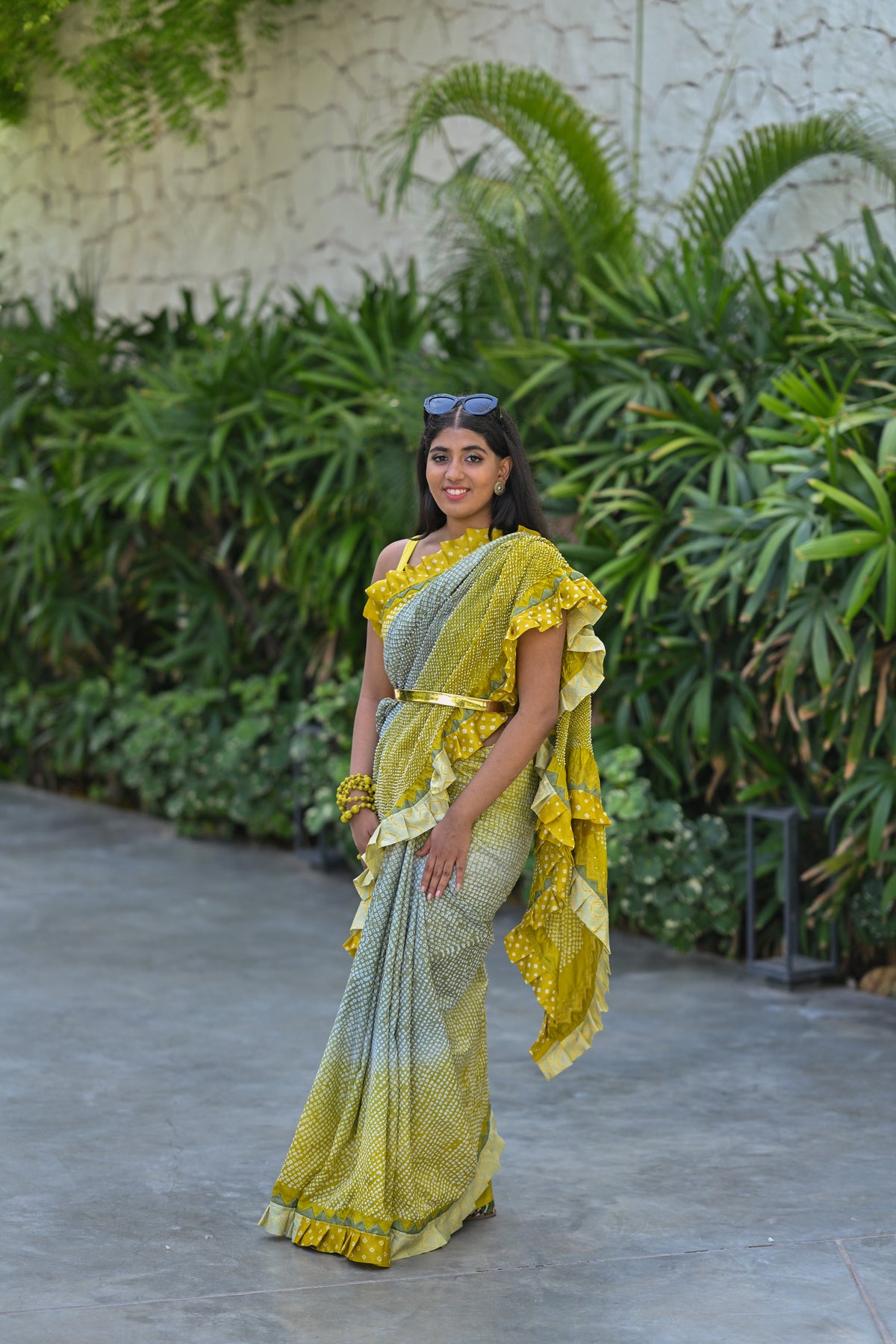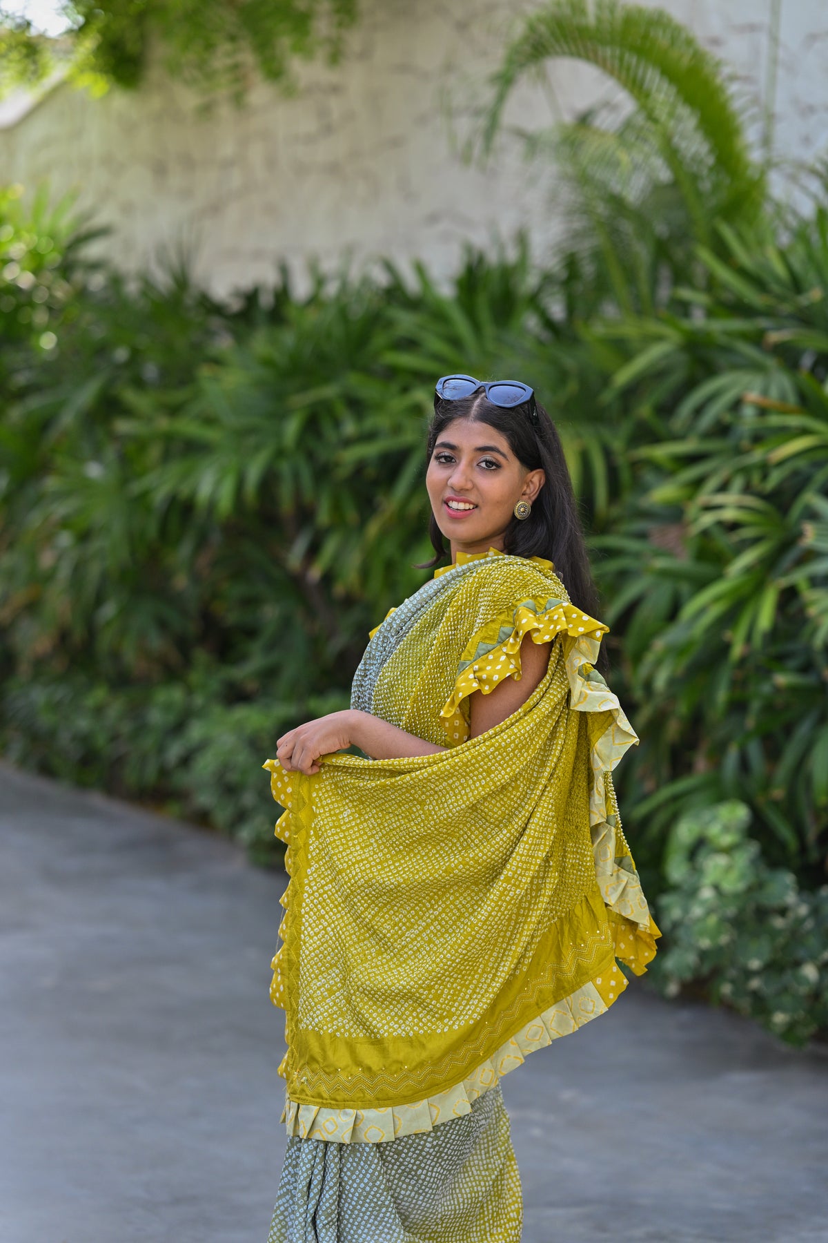 YELLOW-GREY SILK BANDHANI SAREE WITH EMBROIDERY AND RUFFLE BORDER