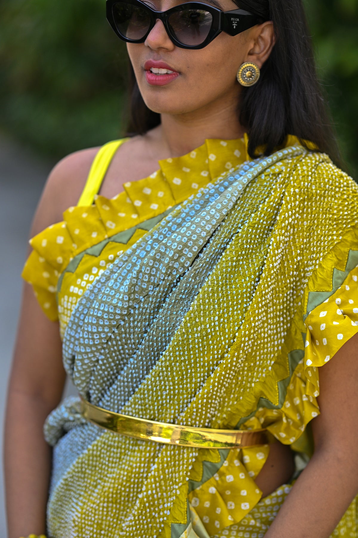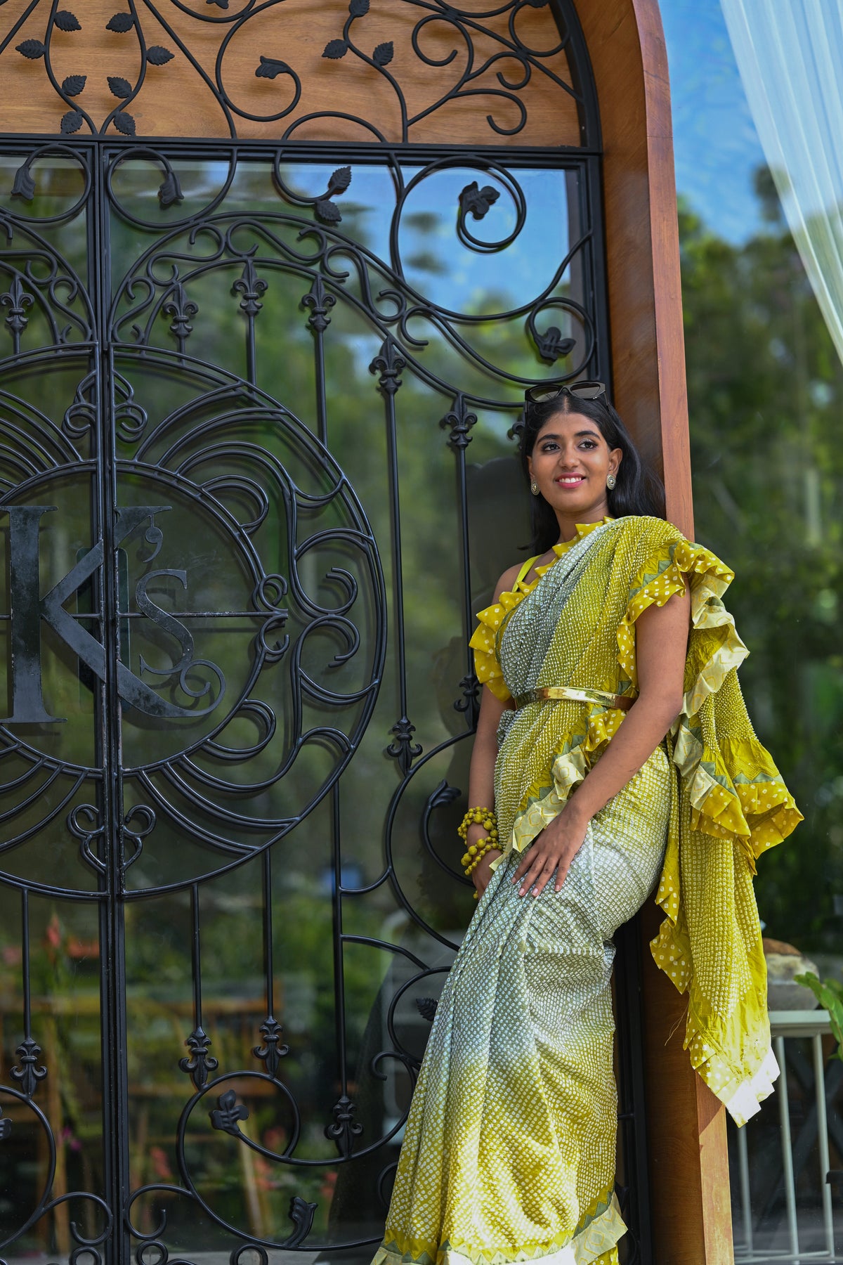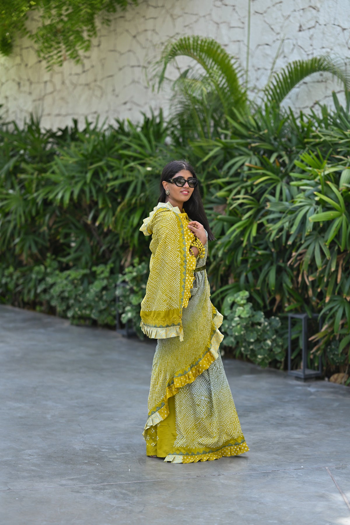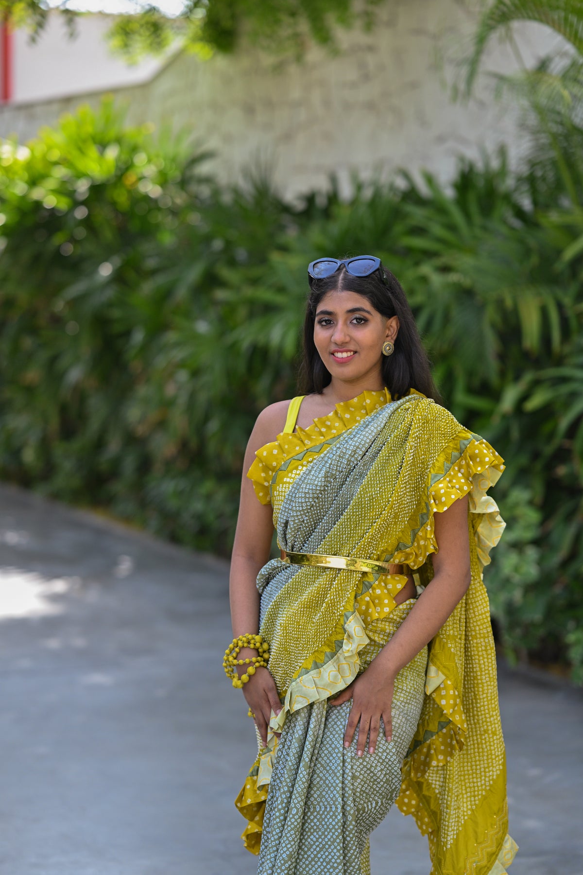 YELLOW-GREY SILK BANDHANI SAREE WITH EMBROIDERY AND RUFFLE BORDER