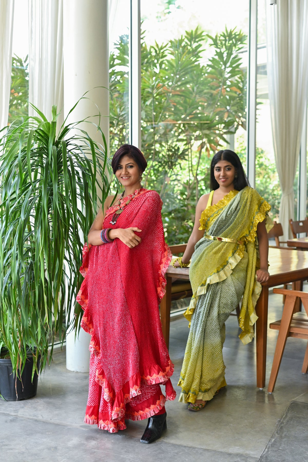 The Silk Ruffle Saree is a masterpiece that blends various art forms into one cohesive creation. Featuring block prints, bandhani, and Leheriya, each saree is uniquely distinct. Stand out in a crowd, with a Neelgar Silk bandhani  Ruffle Saree, where no two pieces are alike.