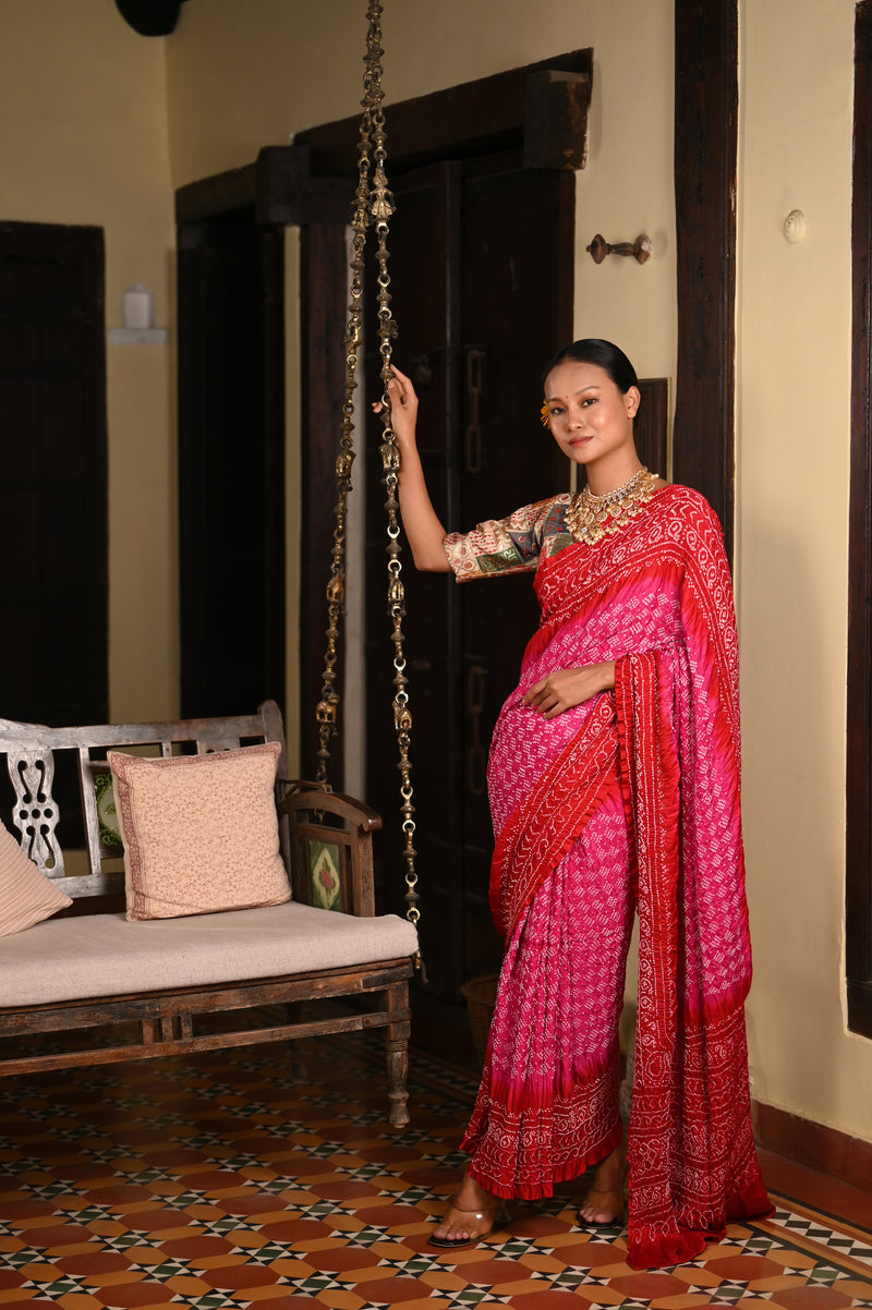 PINK-RED CLASSIC TRADITIONAL BANDHANI SILK SAREE