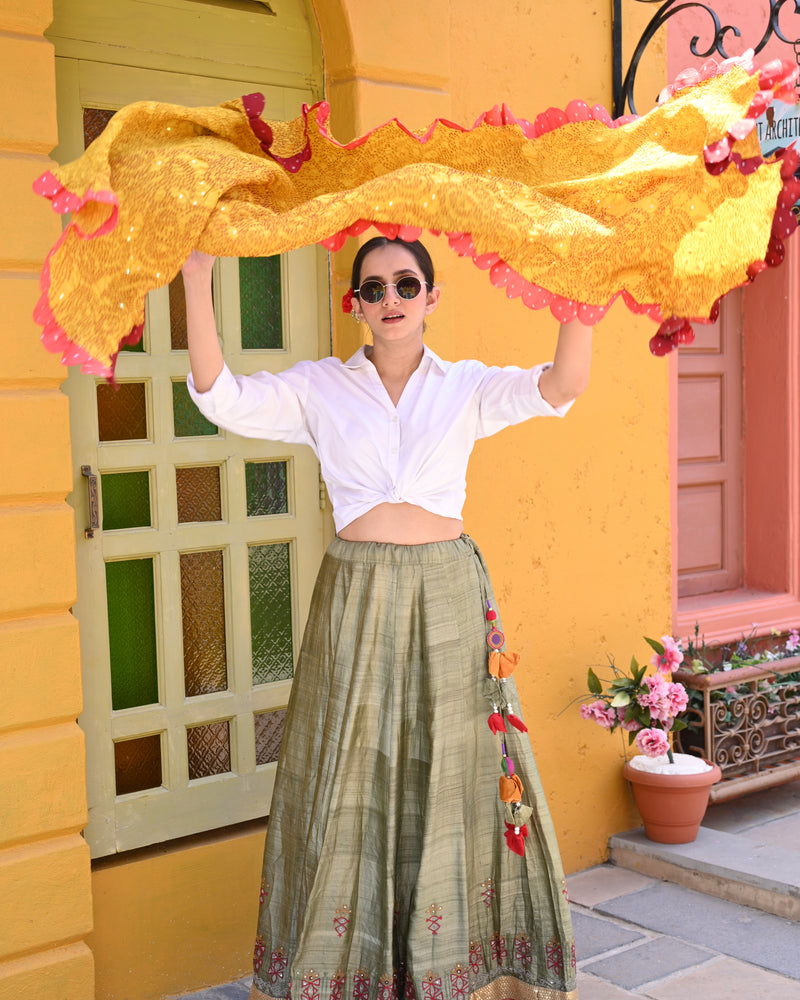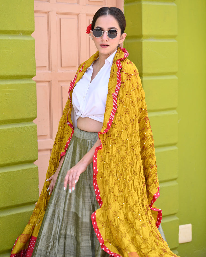 MUSTARD YELLOW POPPY FLOWER BANDHANI SILK DUPATTA WITH EMBROIDERY AND MIRROR BORDER