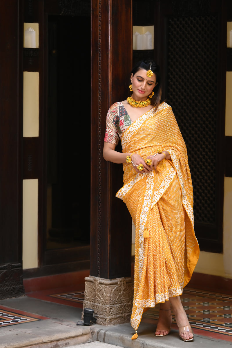 YELLOW ETERNAL DOTS BANDHANI SILK SAREE WITH LACE BORDER AND TASSELS